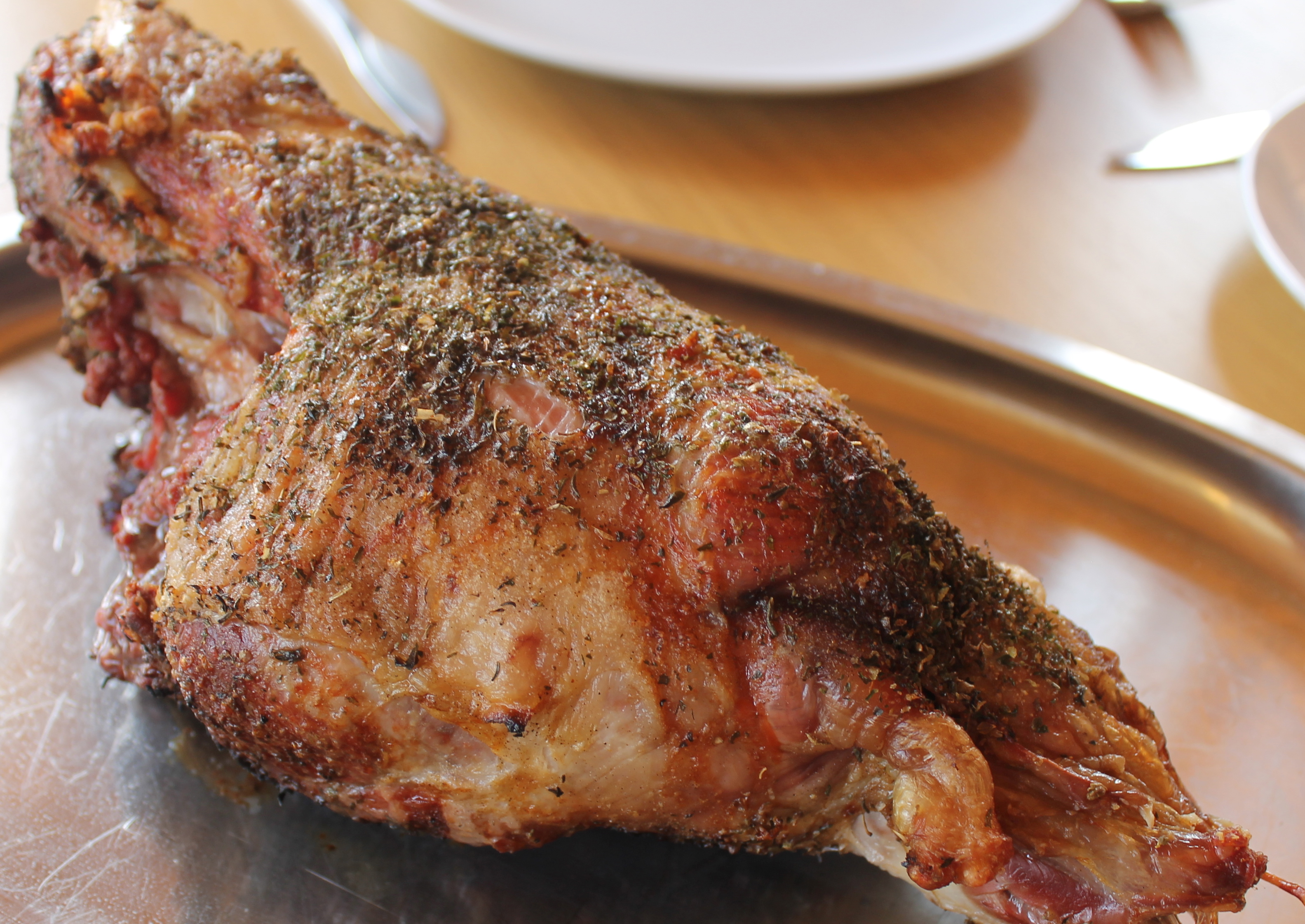 Ég byrjaði á að skera mjaðmabeinið úr lærinu, mér finnst bæði að það steikist þá jafnar og svo er mun auðveldara að skera kjötið. Það er engin mynd af því, ég er enginn sérstakur úrbeiningasnillingur og var bara með bitlítinn smáhníf svo þetta var ekki sýningarhæft. En ég skar bara meðfram beininu eftir bestu getu, þar til kom að liðamótum, og reyndi að skilja sem minnst kjöt eftir á beininu. Svo sleit ég mjaðmabeinið frá og geymdi til að nota í soð.