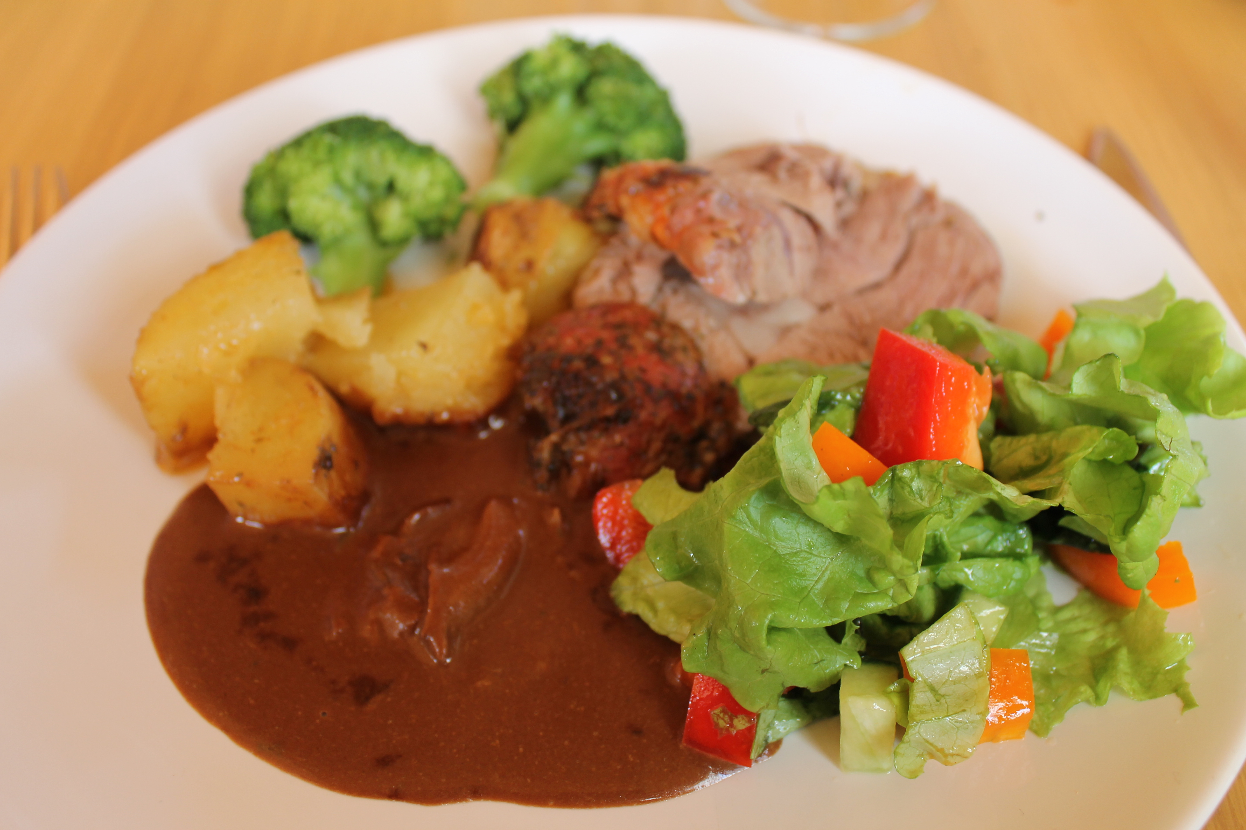 Með kartöflunum og sósunni, soðnu spergilkáli og salati (já, vitlaus fókus, ég veit). Ósköp gott bara.