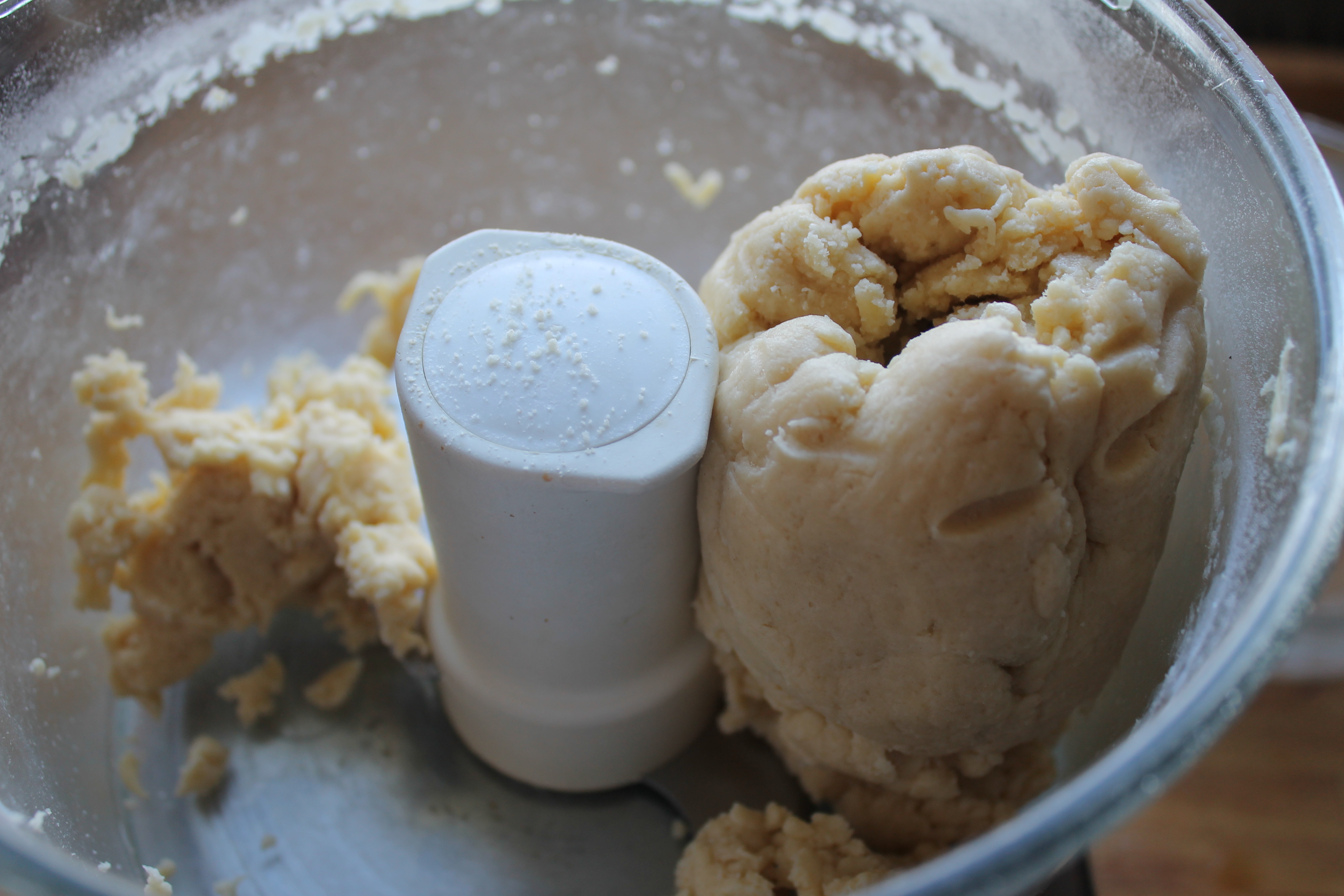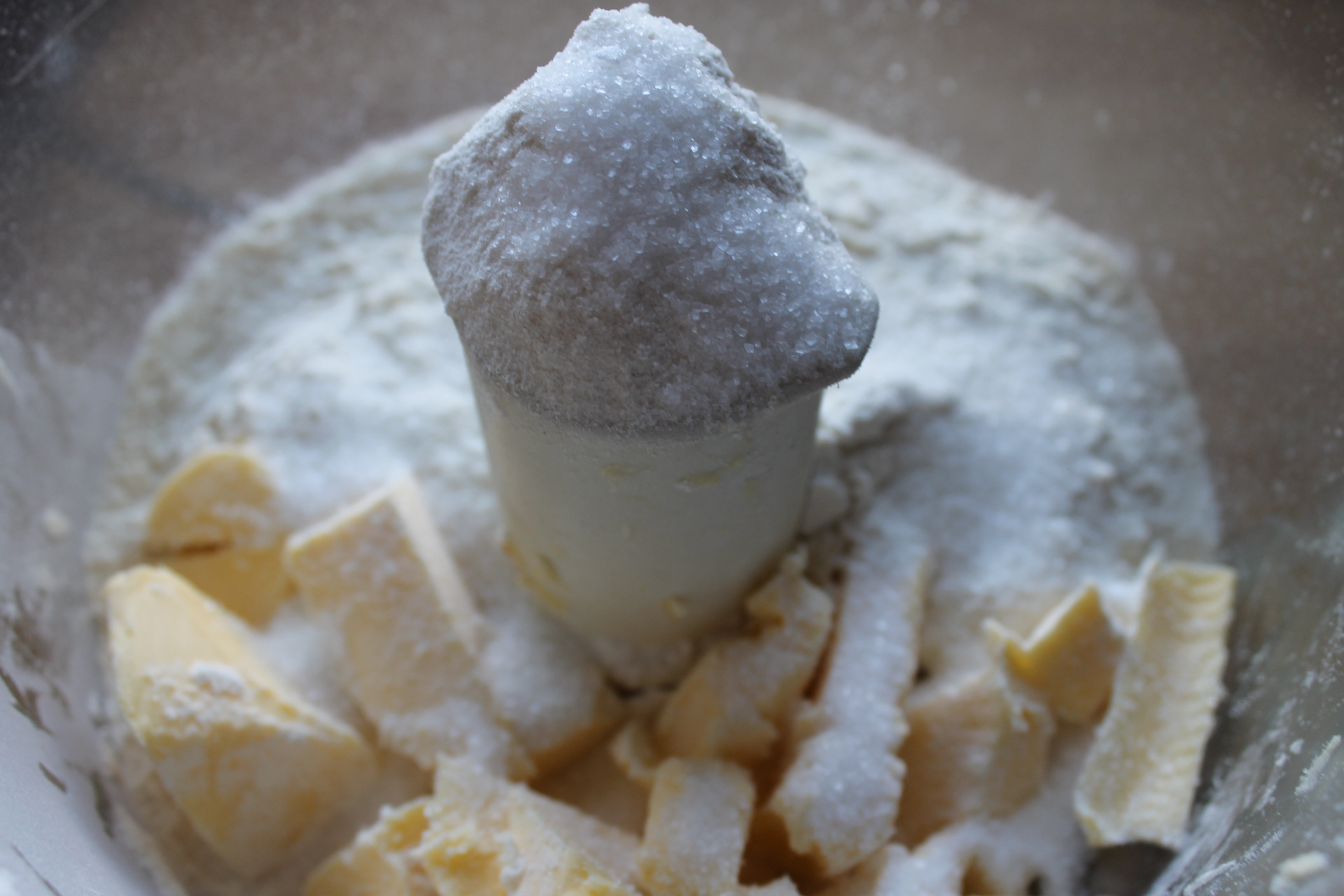 Ég notaði 300 g hveiti, 150 g af smjöri (köldu og skornu í bita), 2 msk af sykri og 1/2 tsk af salti. Setti þetta í matvinnsluvél og lét hana ganga þar til smjörið var alveg komið saman við hveitið.