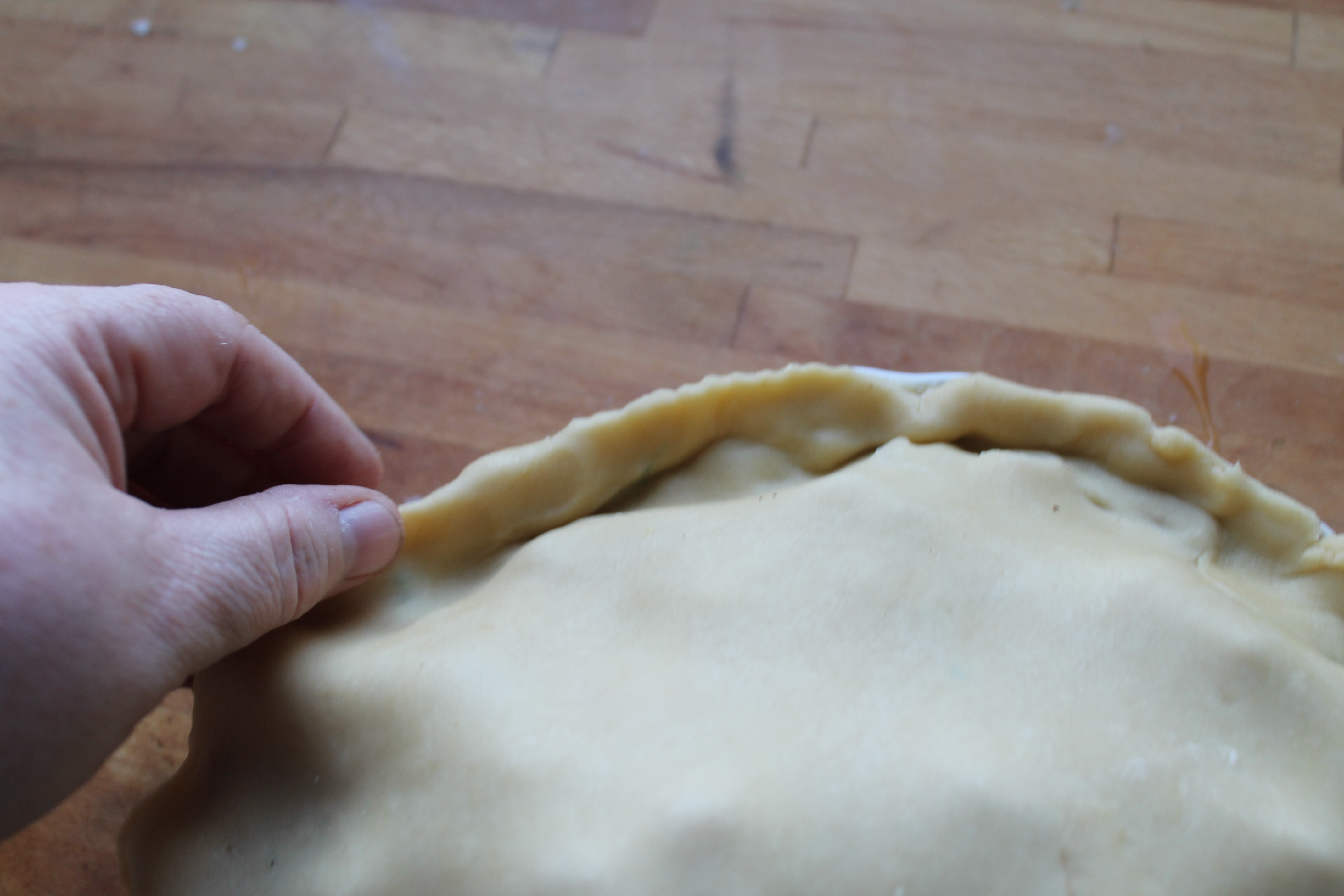 Ég flatti svo afganginn af deiginu út þar til kominn var hringur, dálítið stærri en formið, lagði hann yfir og klemmdi saman við eggjapensluðu kantana með fingrunum, allan hringinn. Helst þarf að klemma deigið þétt saman og þrýsta aðeins niður um leið, eins og hér sést. Þá eru minni líkur á að fyllingin leki út.