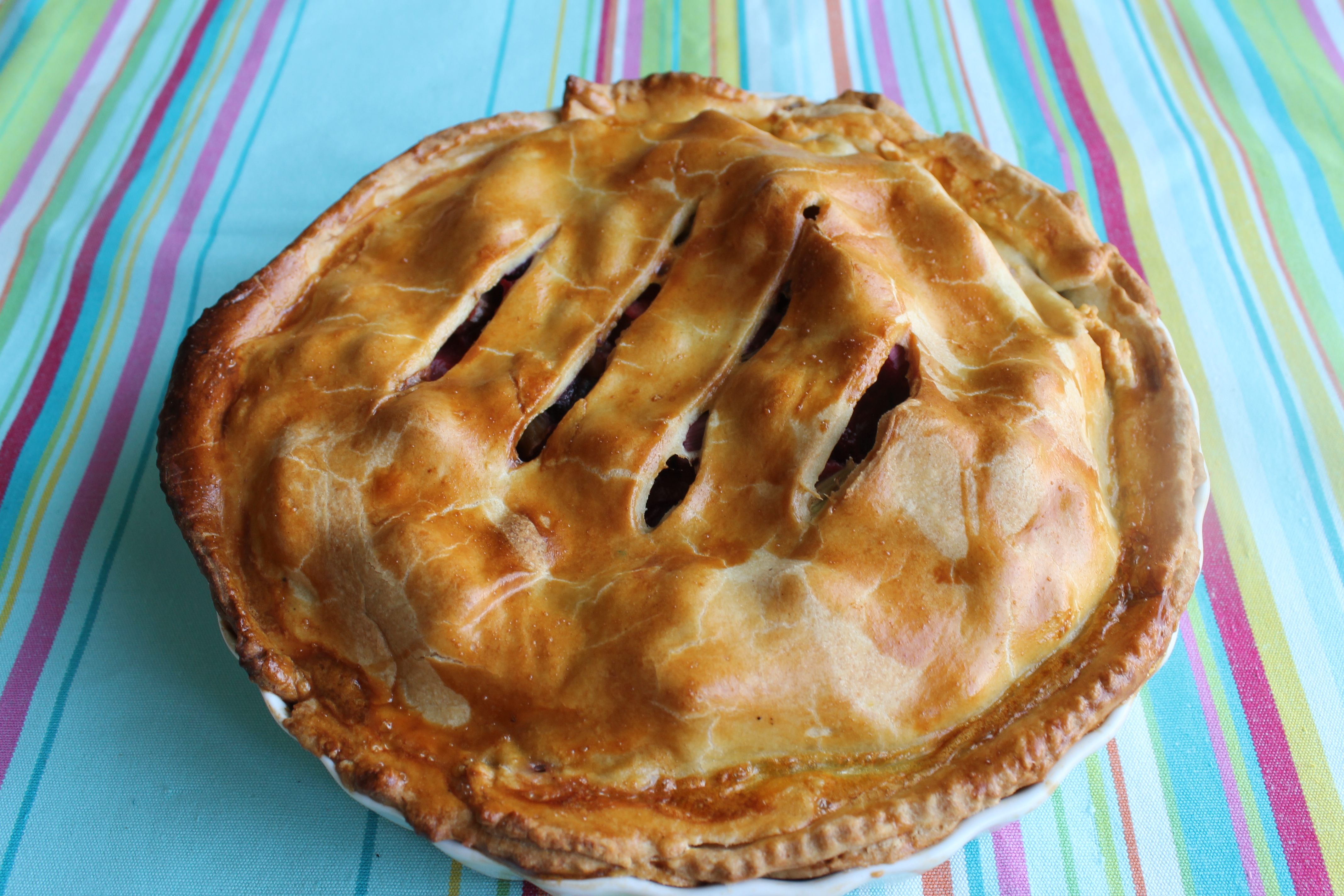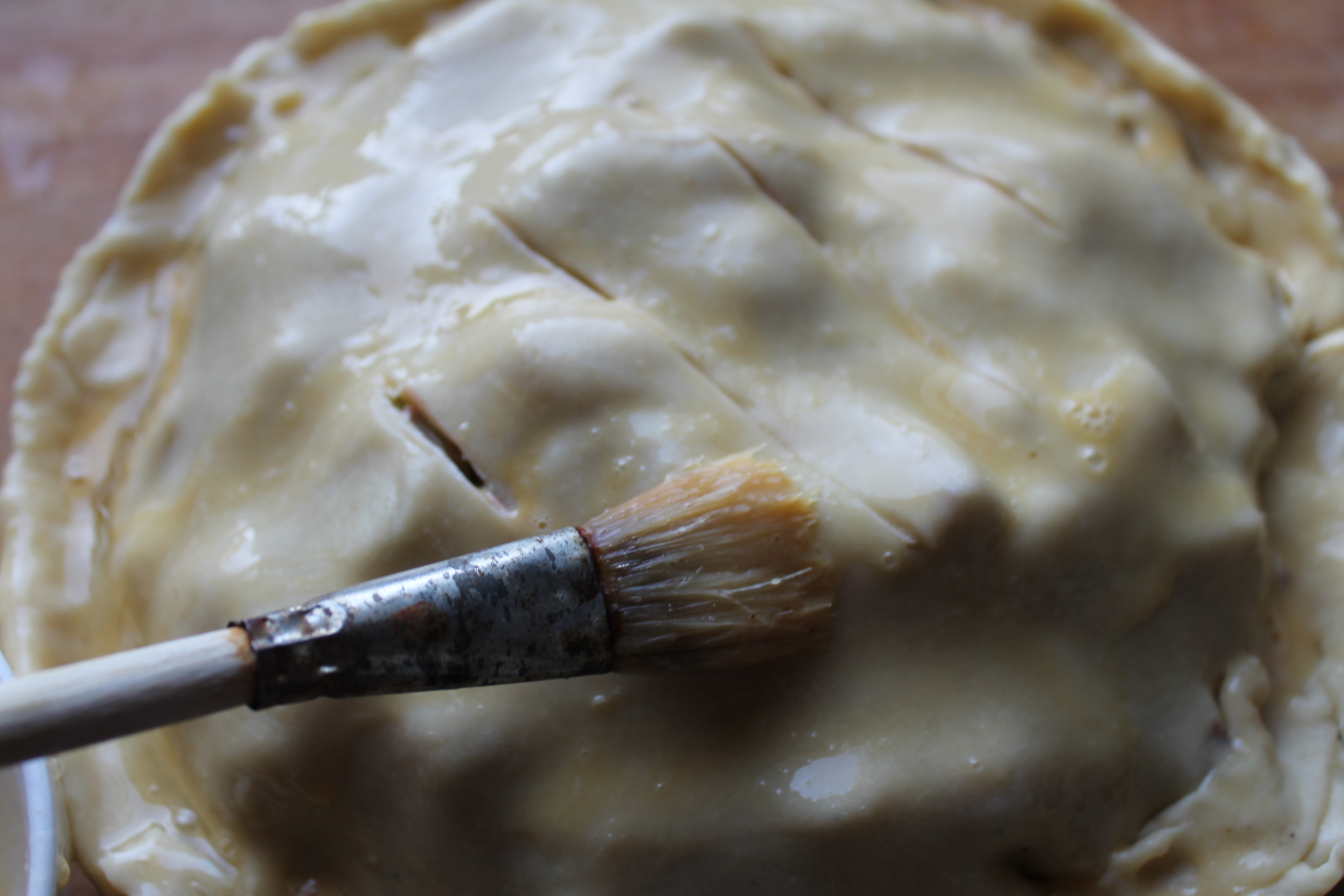 Svo skar ég nokkrar rifur í deiglokið (til að hleypa út gufu) og penslaði það vel með egginu. Ég setti formið á bökunarplötu – finnst það alltaf vissara þegar ég er með fyllingu sem gæti lekið út – og stakk henni í ofninn á næstneðstu rim. Eftir 20 mínútur lækkaði ég hitann í 175°C og bakaði í um 30 mínútur í viðbót.