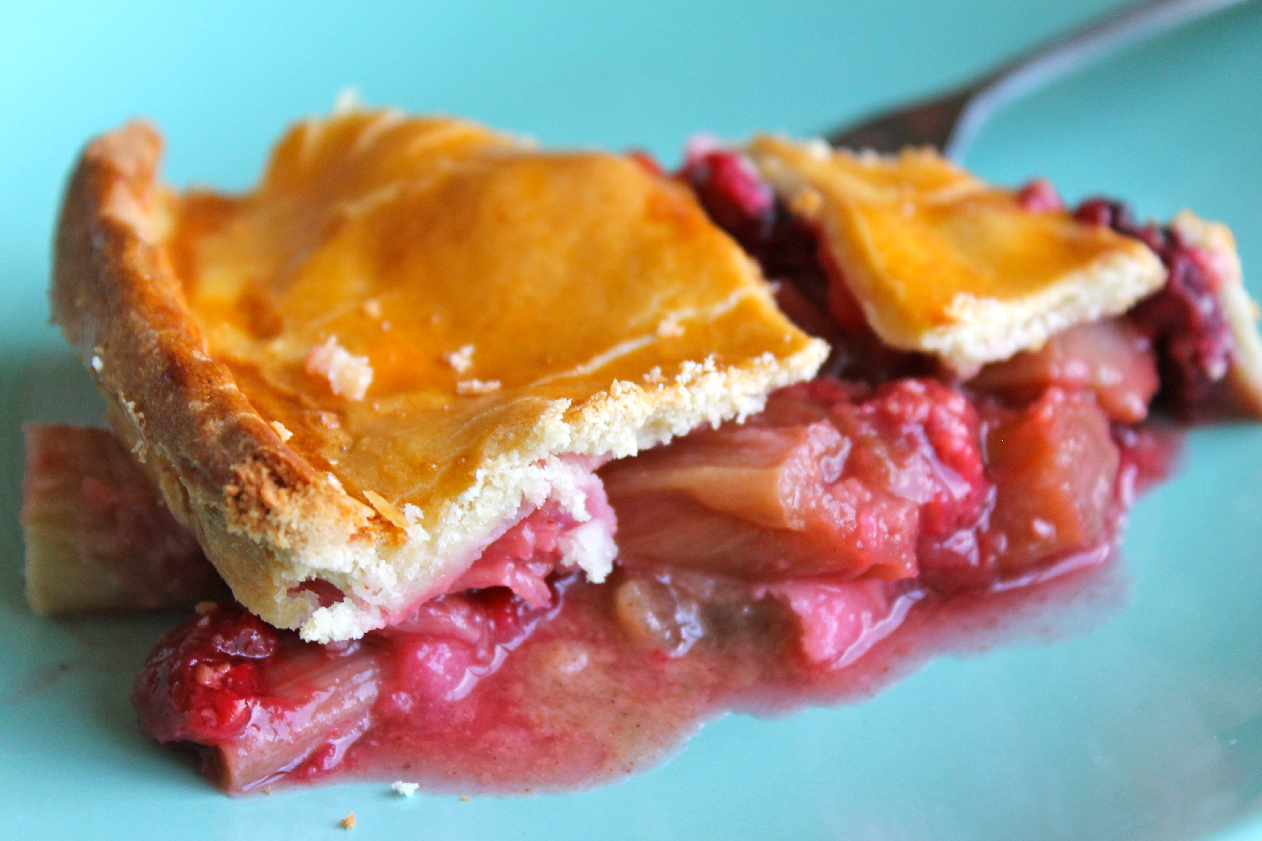 Ég skoðaði nokkrar rabarbarabökuuppskriftir og yfirleitt var notað hlutfallslega meira af sykri í þær. Það þarf töluverðan sykur til að vega upp á móti sýrunni í rabarbaranum en ég vil ekki hafa rabarbararétti mjög sæta og mér finnst þetta hæfilegt. En það má auðvitað hafa eitthvað meira … Hveitið er aftur á móti til að binda allan safann sem rennur úr rabarbaranum þegar hann hitnar. Það var reyndar dálítið af safa sem rann úr þessari en ekki mikið og ég er ekki viss um að það hefði verið rétt að nota meira hveiti, þá hefði bakan misst karakterinn.