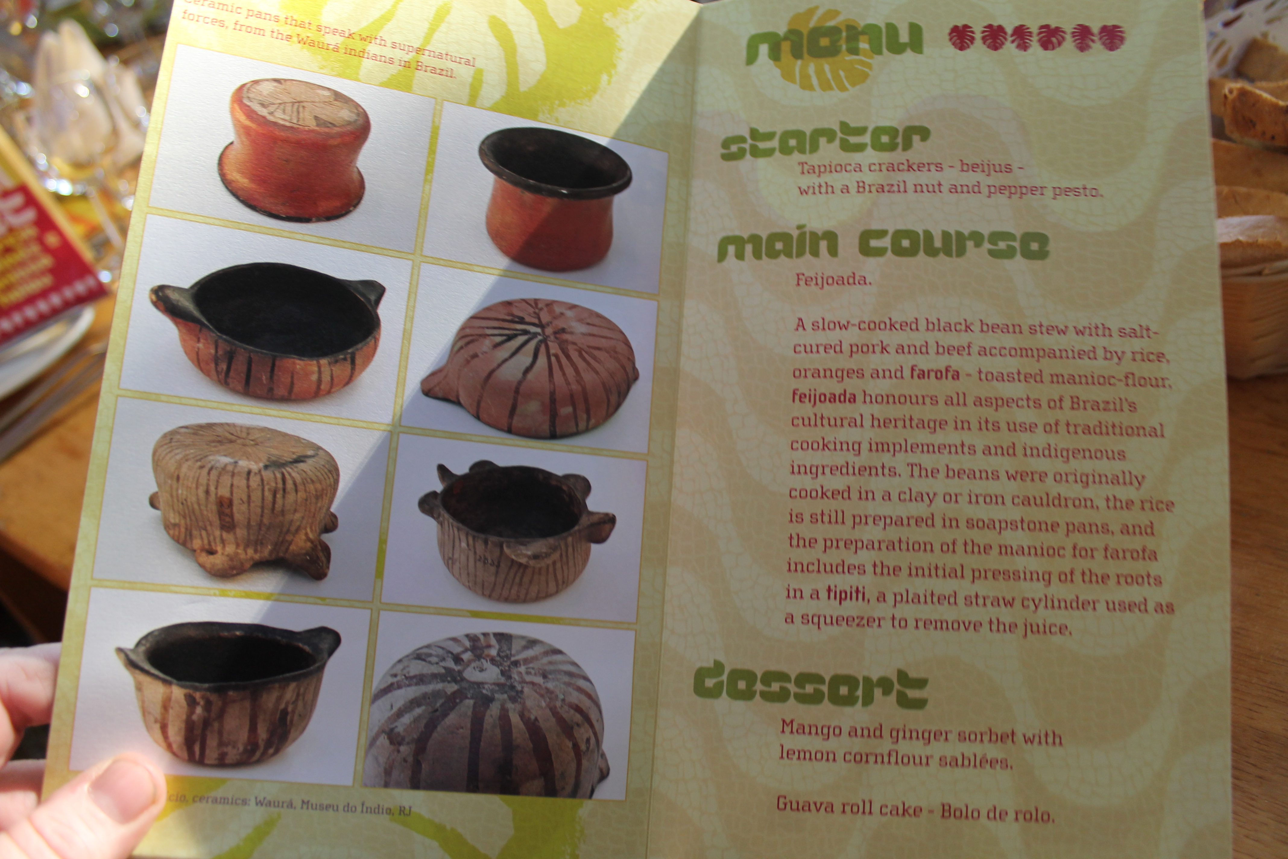 Matseðlarnir þarna eru alltaf flott hannaðir og skemmtilegir og gefa manni miklar upplýsingar. Þarna eru til dæmis myndir af ýmsum leirpottum sem þjóðarrétur Brasilíumanna, feijoada, er eldaður í samkvæmt hefð.