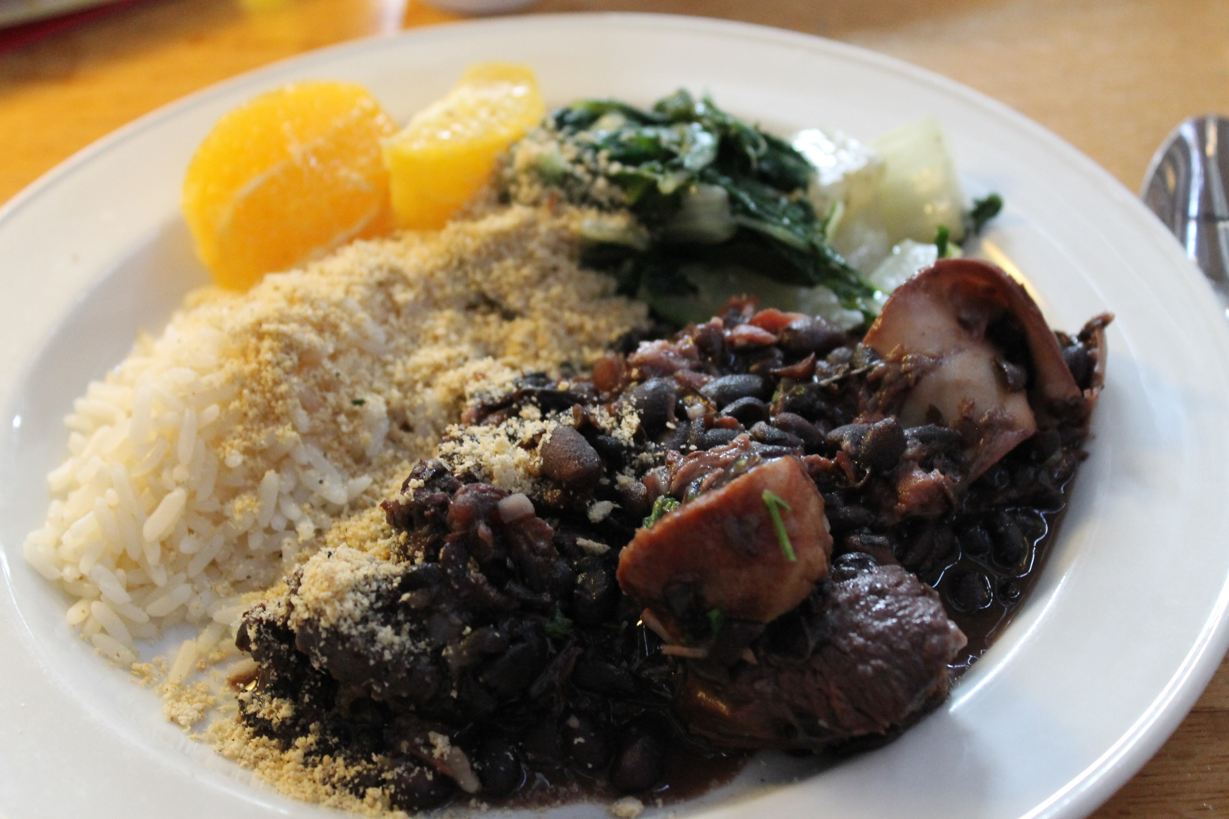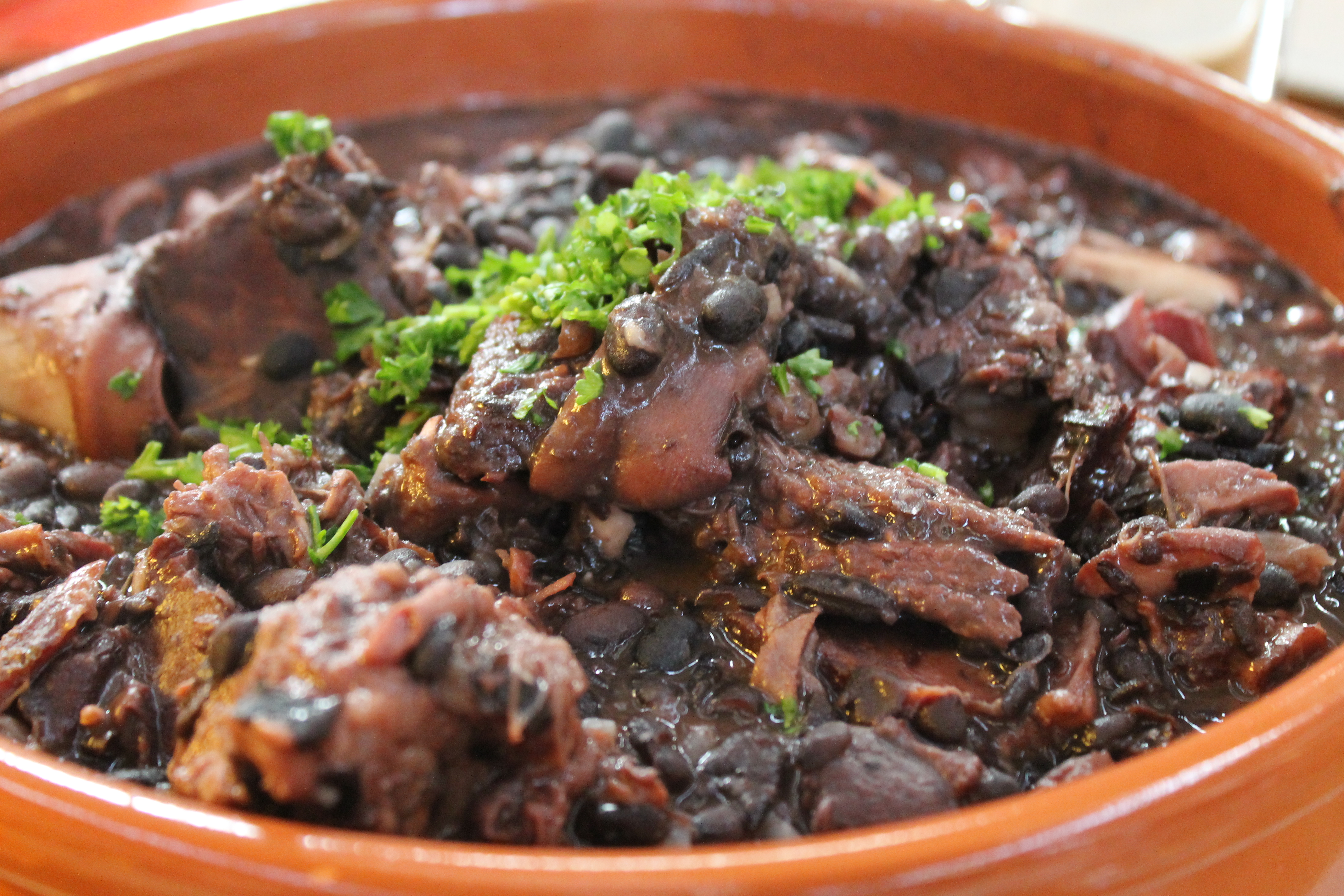 Svo voru bornar fram leirskálar með feijoada – svartbaunir (feijoa þýðir baunir) með söltuðu svínakjöti og nautakjöti og líklega einhverju beikoni, látið malla lengi við vægan hita.