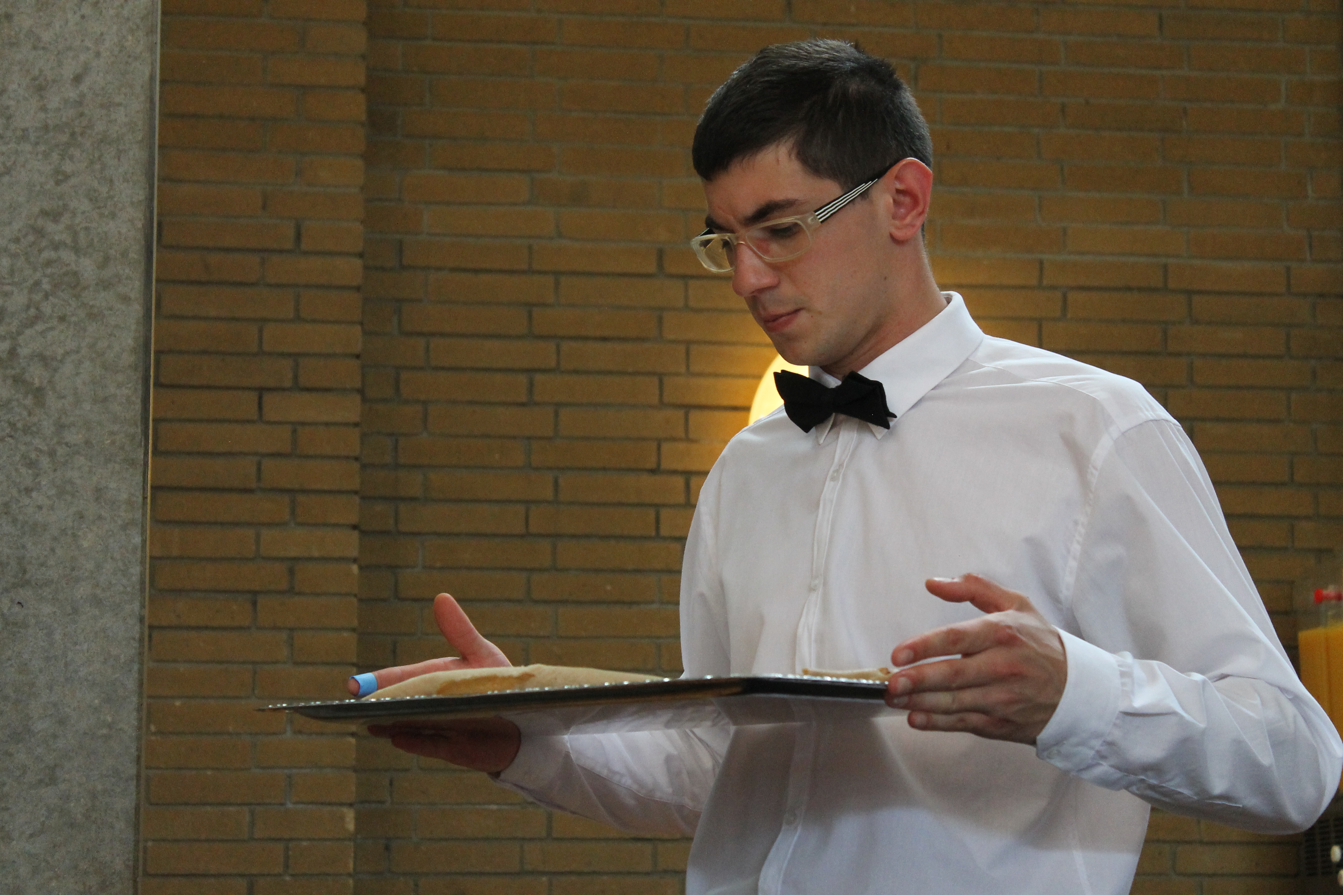 Þjónustan í borðsal St. Catz gengur alltaf eins og smurð vél og þjónarnir streymdu inn með stóra bakka með eþíópíska flatbrauðinu injera. En þessi drengur stóð smástund og horfði á injera-brauðið eins og hann væri að velta því fyrir sér hvort þetta væri virkilega ætt og hann ætti að setja þetta fyrir gestina; mér fannst svipurinn á honum óborganlegur.