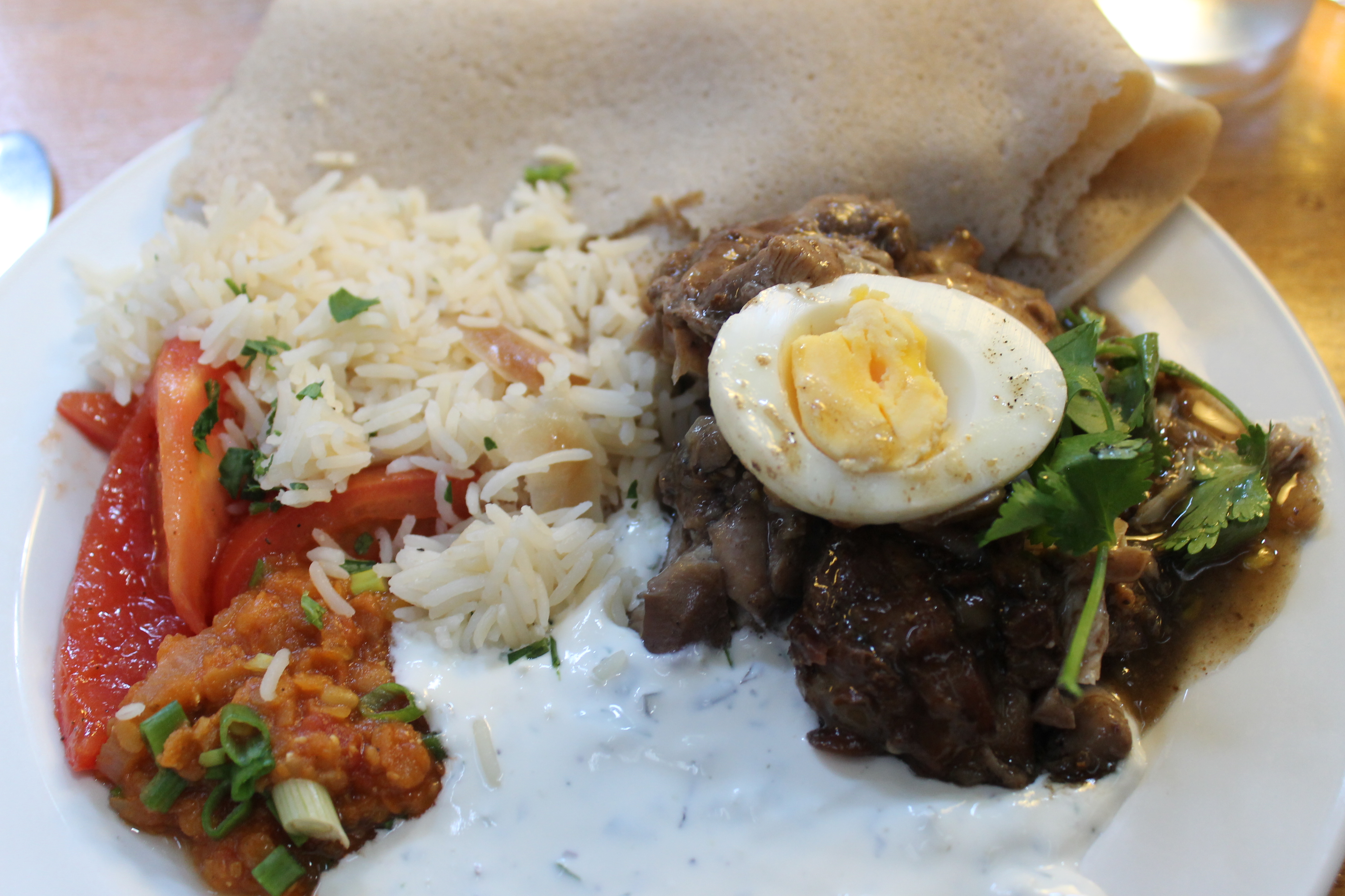 Og svo voru kryddaðir tómatar og paprika, kryddmauk, hrísgrjón og sósa úr ferskosti. Og injera, sem er reyndar meira eins og pönnukaka en brauð. Maður fékk hnífapör en það var mælt með að maður borðaði með höndunum (rifi bita af brauðinu og tæki matinn upp með honum).