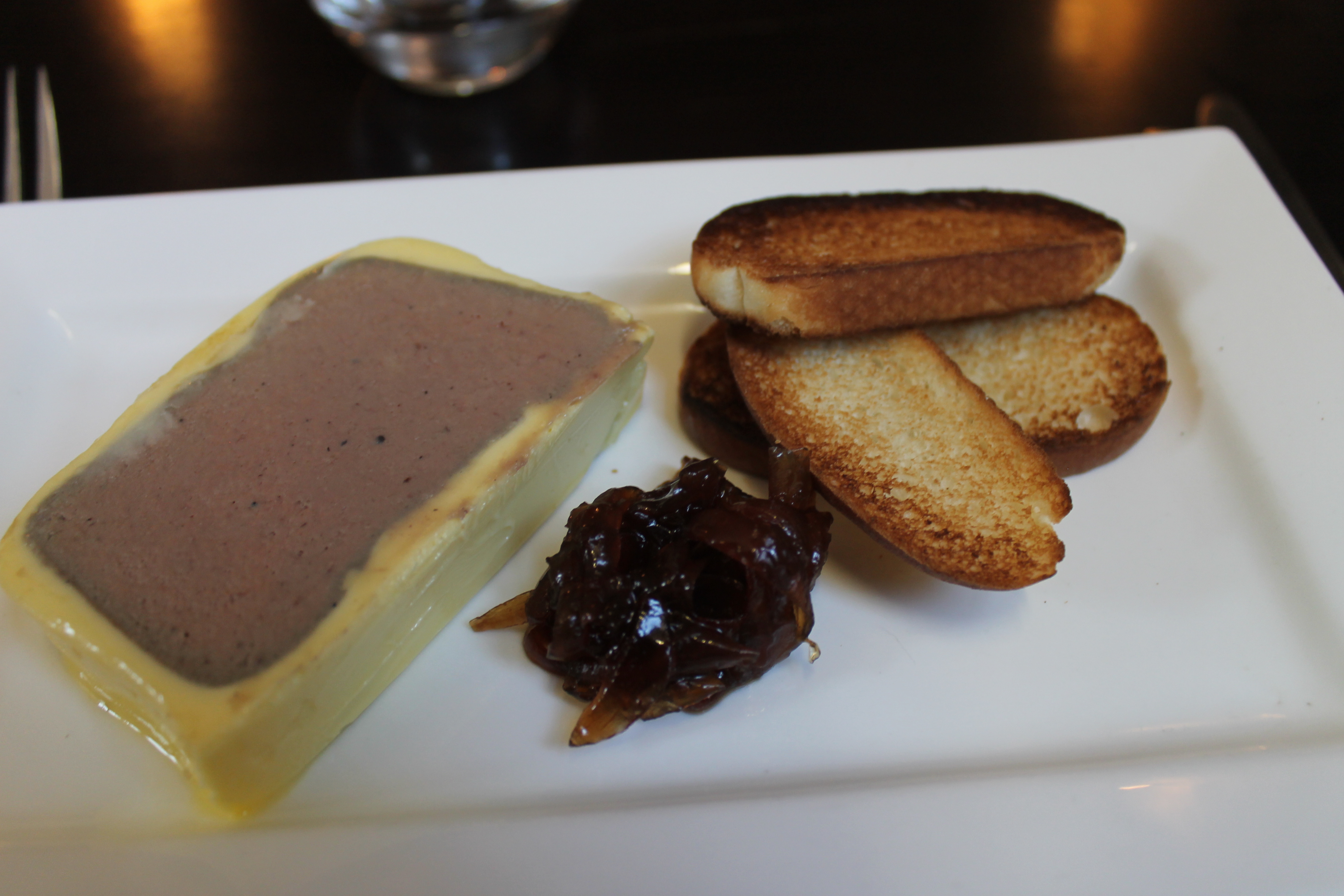 Ég var þreytt eftir annasama daga á ráðstefnunni og ákvað að borða bara á veitingastað hótelsins, sem er alveg þokkalegur. Byrjaði á kjúklingalifrarkæfu sem var vel útilátin og borin fram með sultuðum rauðlauk og ristuðu brauði.