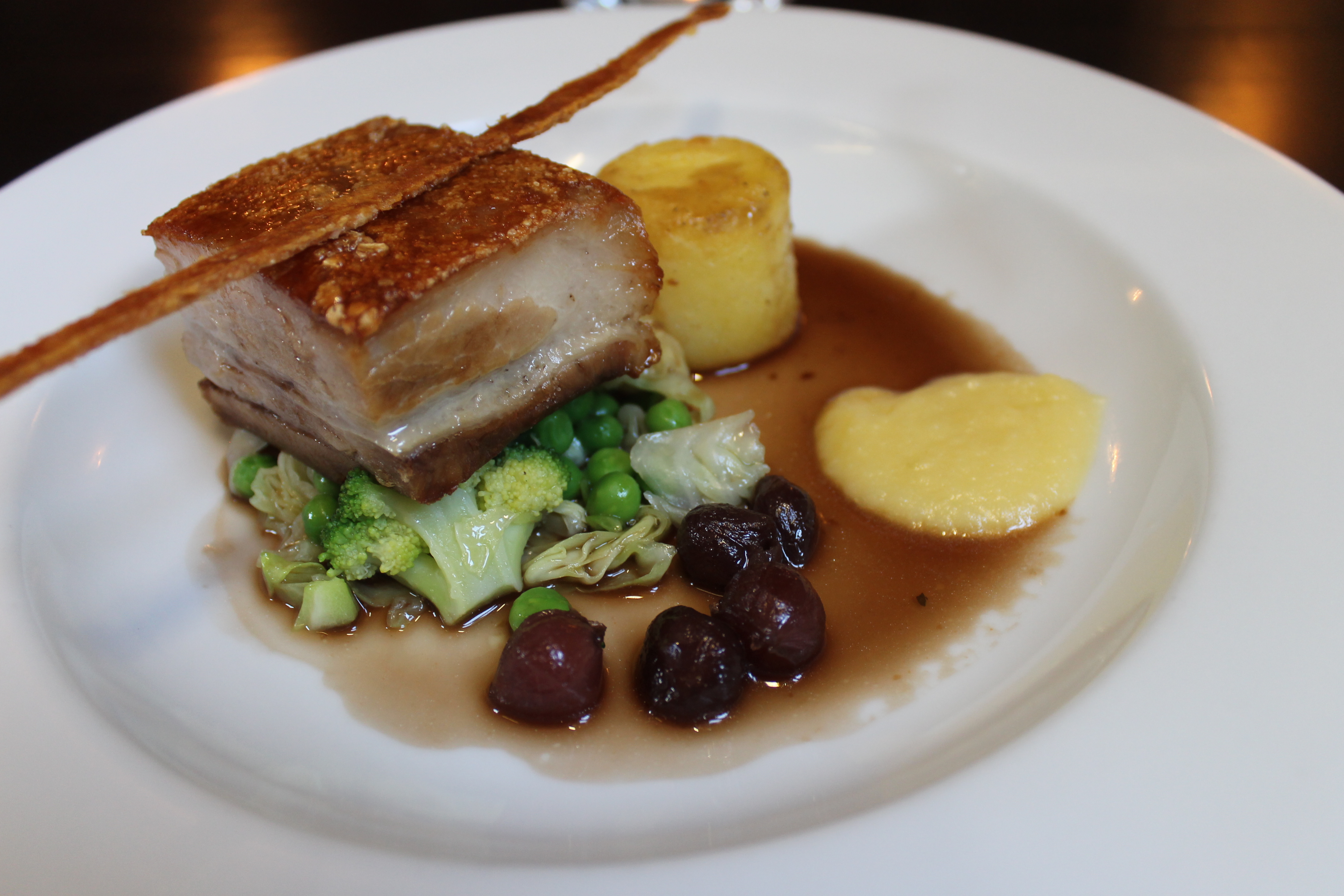 Aðalrétturinn var svo hægelduð svínasíða með madeirasósu, vínberjum, baunum, spergilkáli og fondantkartöflu. Þetta var, eins og forrétturinn, ágætt en ekki eftirminnilegt. Ég sleppti eftirrétti en settist þess í stað út á svalirnar mínar með kaffibolla.