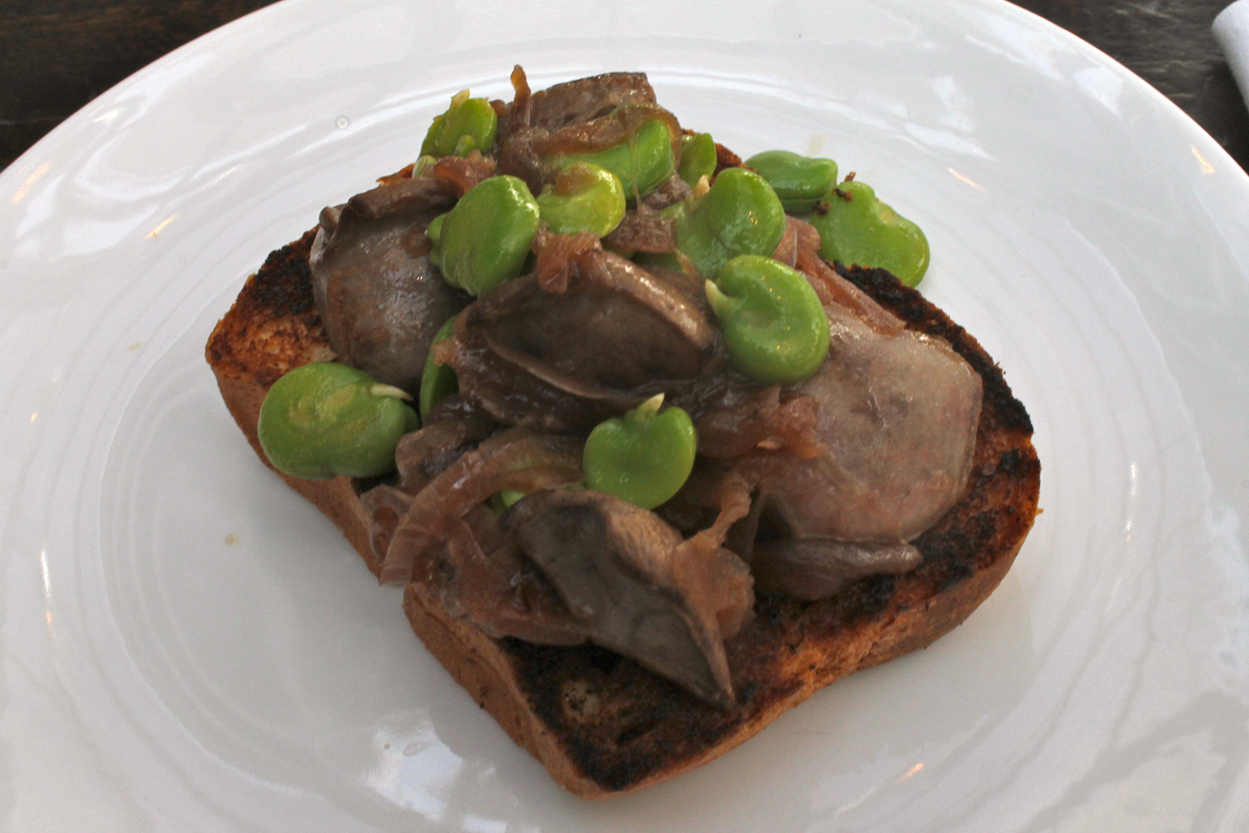 Það er ýmislegt hefðbundið á matseðlinum á Gee’s, borgarar, grillsteikur og fleira og það sem ég sá á diskum hjá öðrum gestum leit ágætlega út. En ég sækist alltaf fremur eftir því sem maður fær ekki á hvaða stað sem er og þegar ég sá að Gee’s bauð upp á andahjörtu með hestabaunum á brioche var ég fljót að ákveða forréttinn. Ég þurfti ekki að bíða sérlega lengi (og fékk nýjar og afar góðar radísur og sjávarsalt að gæða mér á meðan ég beið) og þetta var ansi gott – þó var brioche-brauðið aðeins of dökkristað en ekki brunnið að ráði svo það slapp alveg. En þetta er nú ekki fyrir alla.