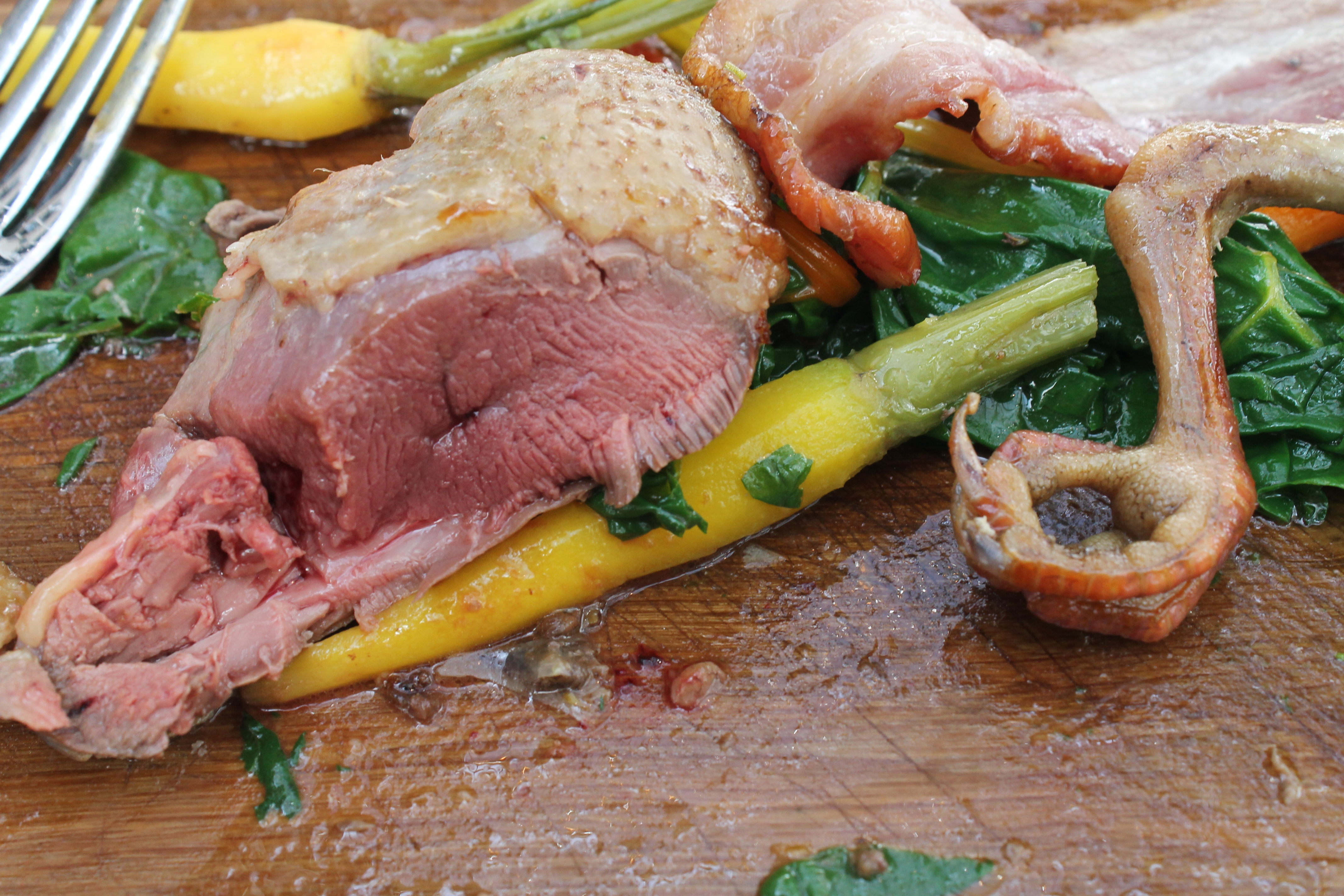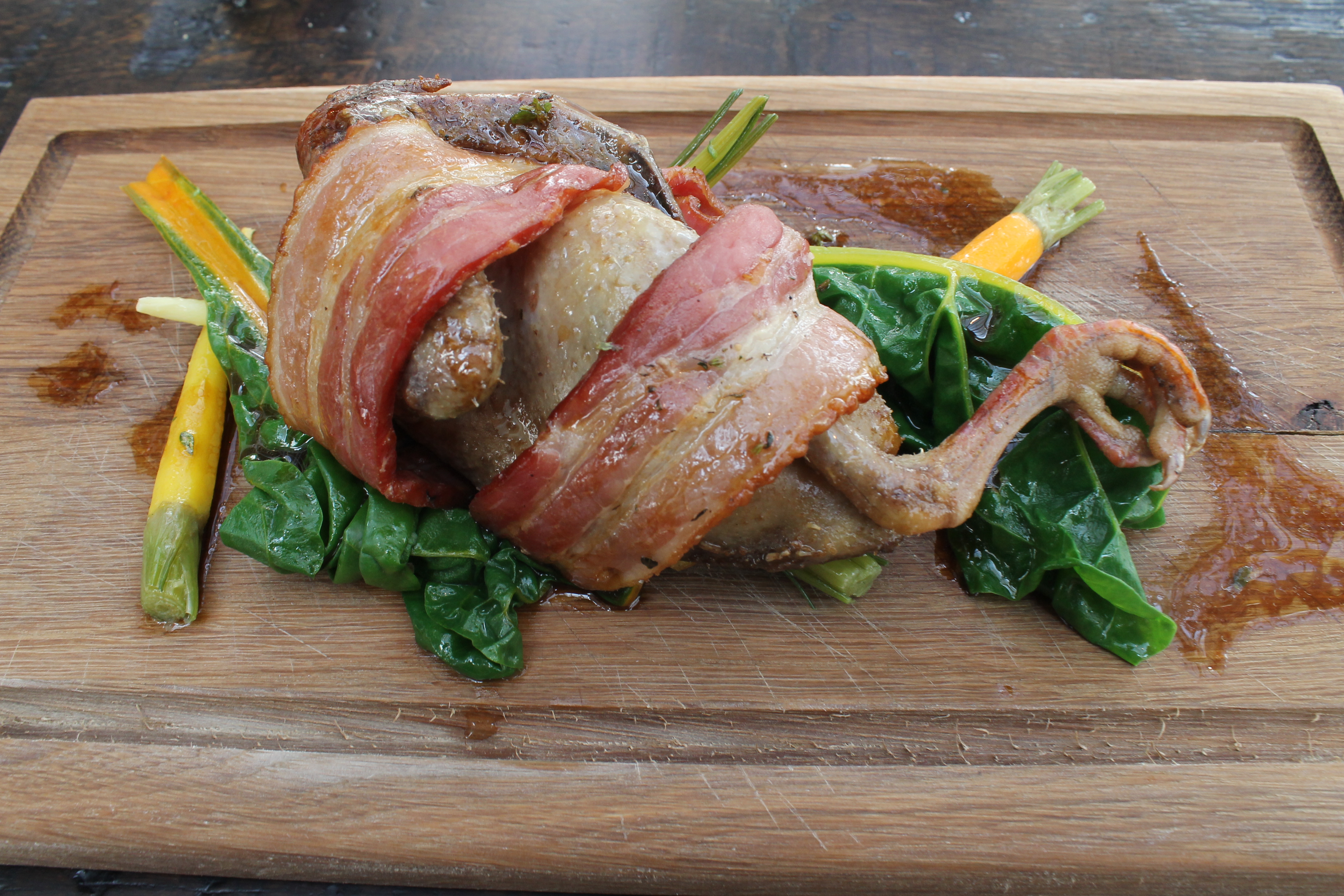Aðalrétturinn var vissulega ekki fyrir alla heldur, hálf beikonvafin dúfa. Ég veit að þetta er eitthvað sem margir gætu ekki hugsað sér að borða …