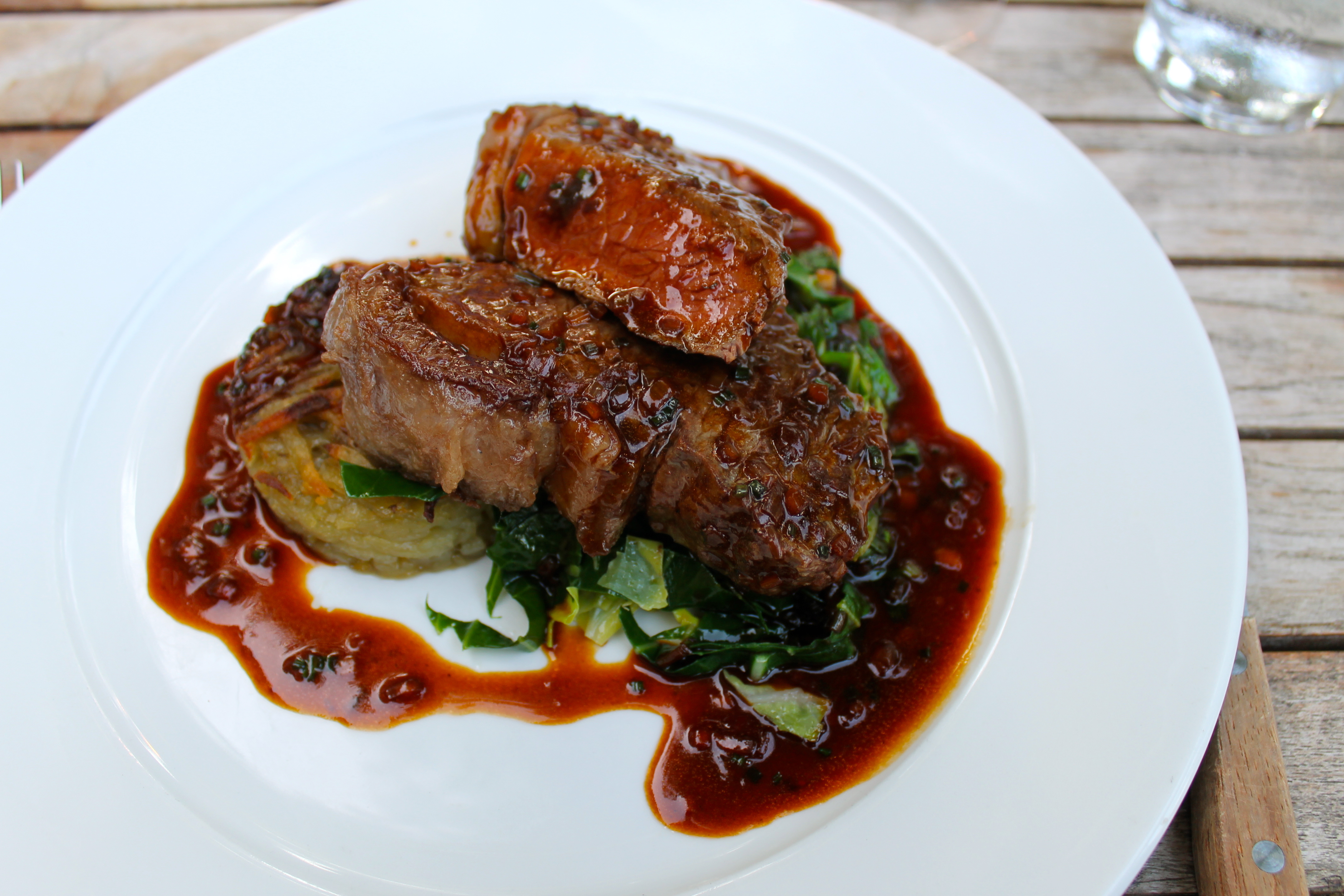 En svo kom aðalrétturinn, vel hangin sirloin-steik með kartöfluköku og bordelaise-sósu og ég lýg því ekki, mér fannst steikin svo falleg og litirnir svo æðislegir að ég ætlaði ekki að tíma að skera í hana – en svo var hún svo girnileg líka og auðvitað sigraði sulturinn. Og nei, hún olli engum sérstökum vonbrigðum, hreint ekki.