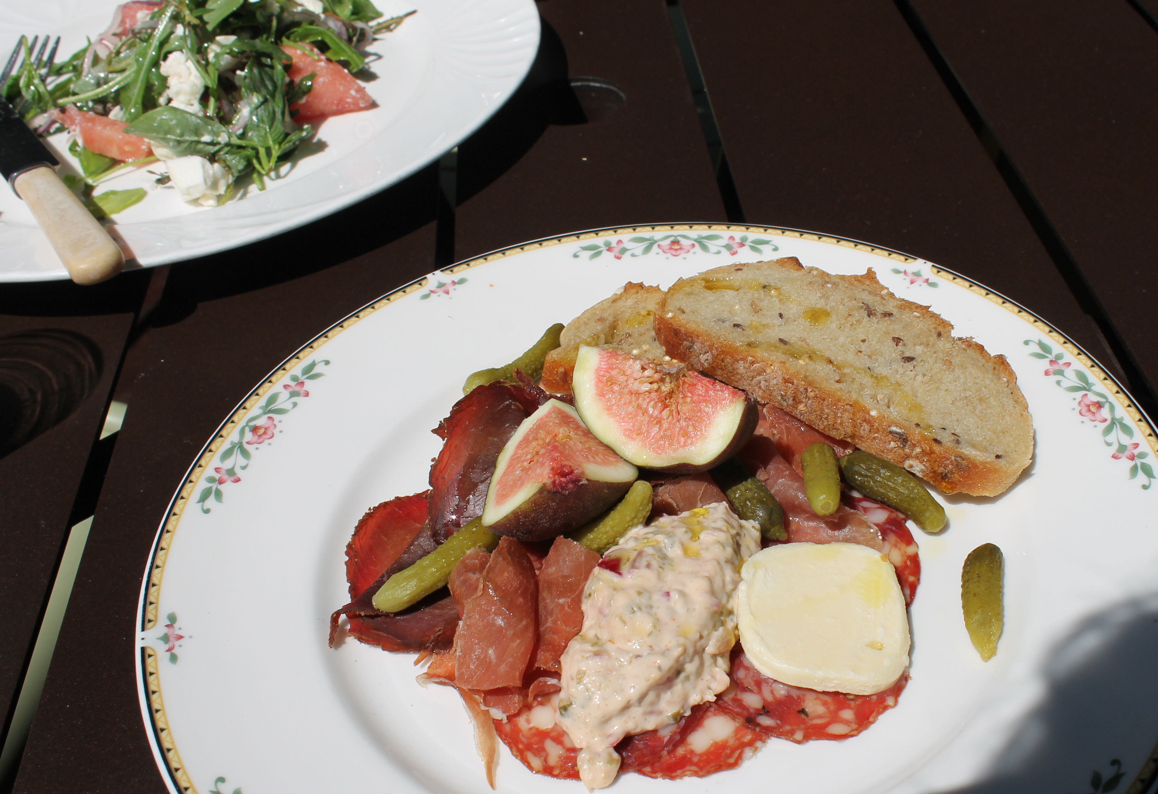 Ég var nú ekkert voðalega svöng eftir allt átið undanfarna daga og langaði ekkert sérlega í aðalrétt svo að ég pantaði tvo forrétti sem ég bað um að fá samtímis – salat með vatnsmelónu, fetaosti og basilíku og disk með köldu kjöti og pylsum. Þetta voru hins vegar stærri skammtar en ég hafði haldið …