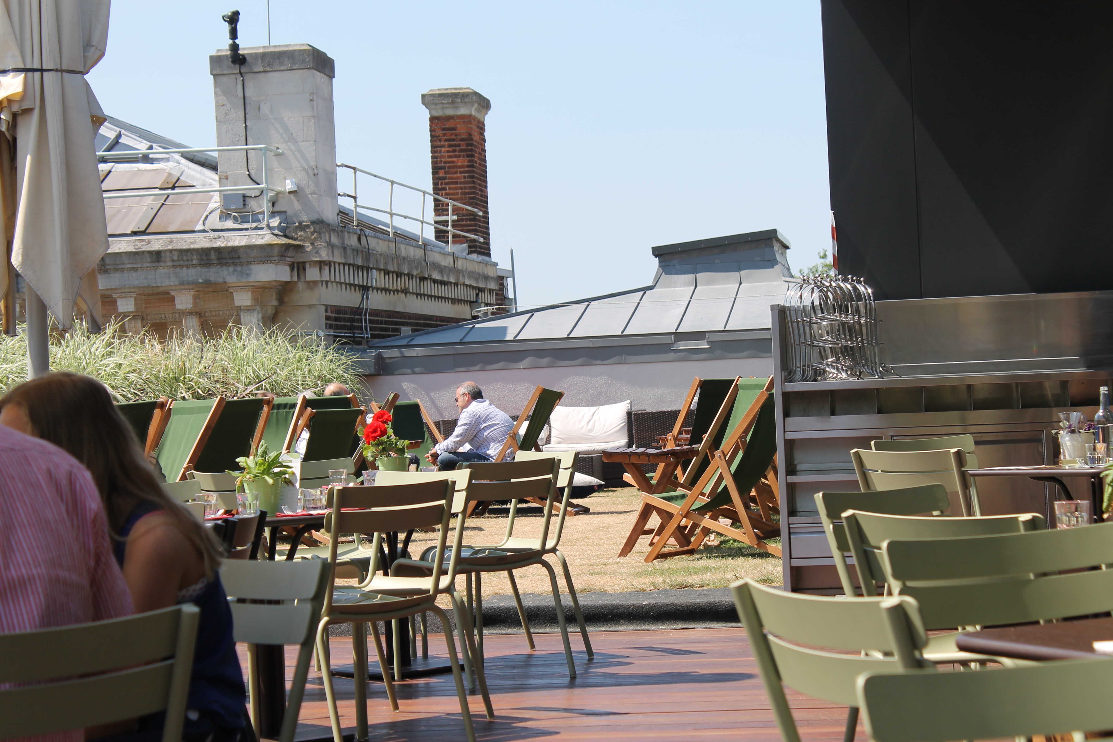 Á þakhæð safnsins er nýtt veitingahús sem er mjög vinsælt, ekki síst í hádegismat á svona degi. Þar er nefnilega fjöldi borða á þakinu og hluti þess er meira að segja grasklæddur og með sólstólum. Ég prófaði þá reyndar ekki … Ég kom rétt fyrir hádegi og þá voru frekar fáir en um leið og klukkan varð tólf streymdi fólk að og bráðlega var hvert sæti setið. Þannig að ef þið farið þangað mæli ég með að mæta snemma eða panta borð. (Það er bara opið á kvöldin föstudaga og laugardaga.)