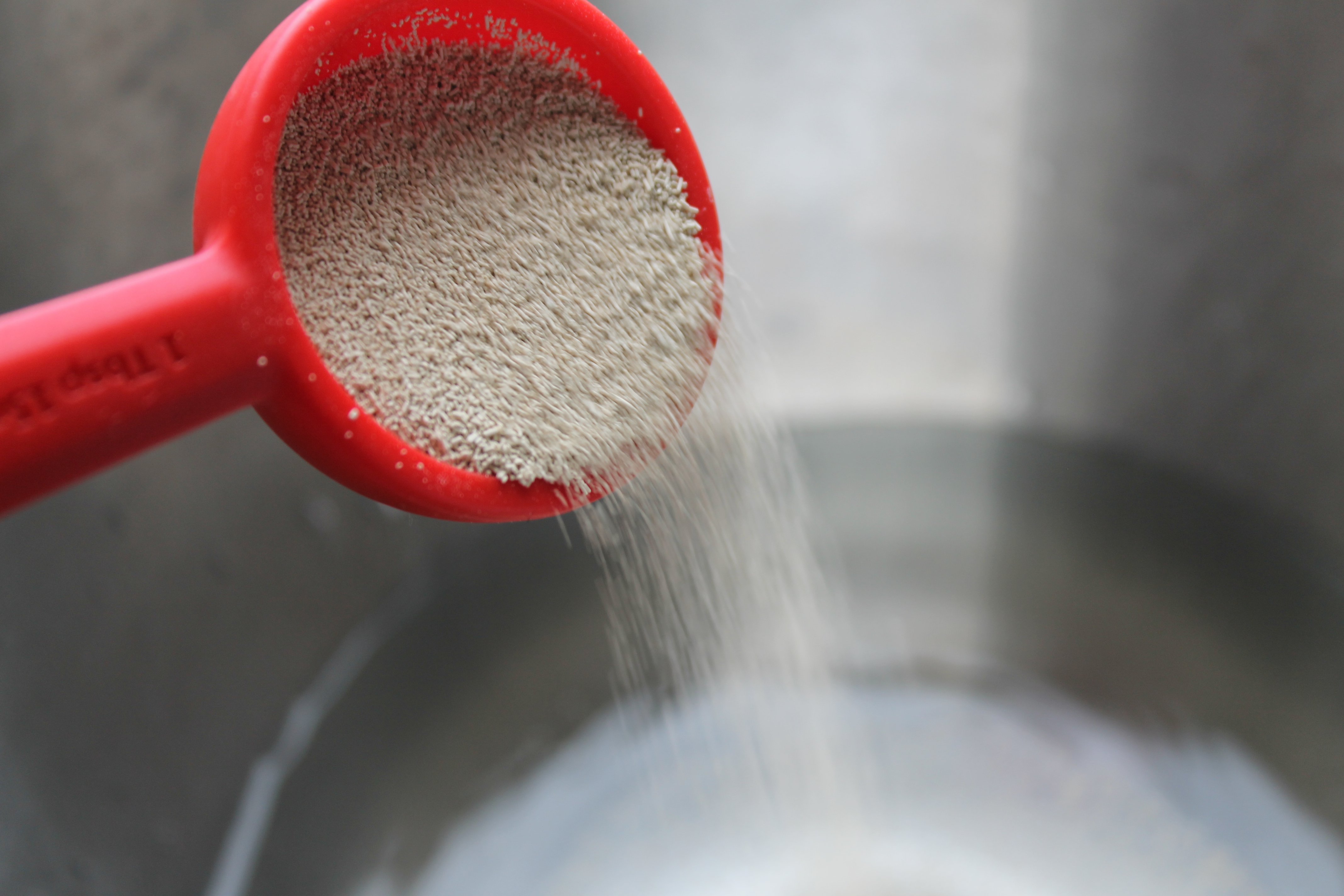 En ég byrjaði á því að hita dálítið vatn og blanda því svo saman við kalt vatn þar til ég var komin með 750 ml af ylvolgu vatni. Einhversstaðar í kringum 40°C alltsvo. Setti það í hrærivélarskálina og stráði 1 msk af geri yfir. Lét standa í nokkrar mínútur.