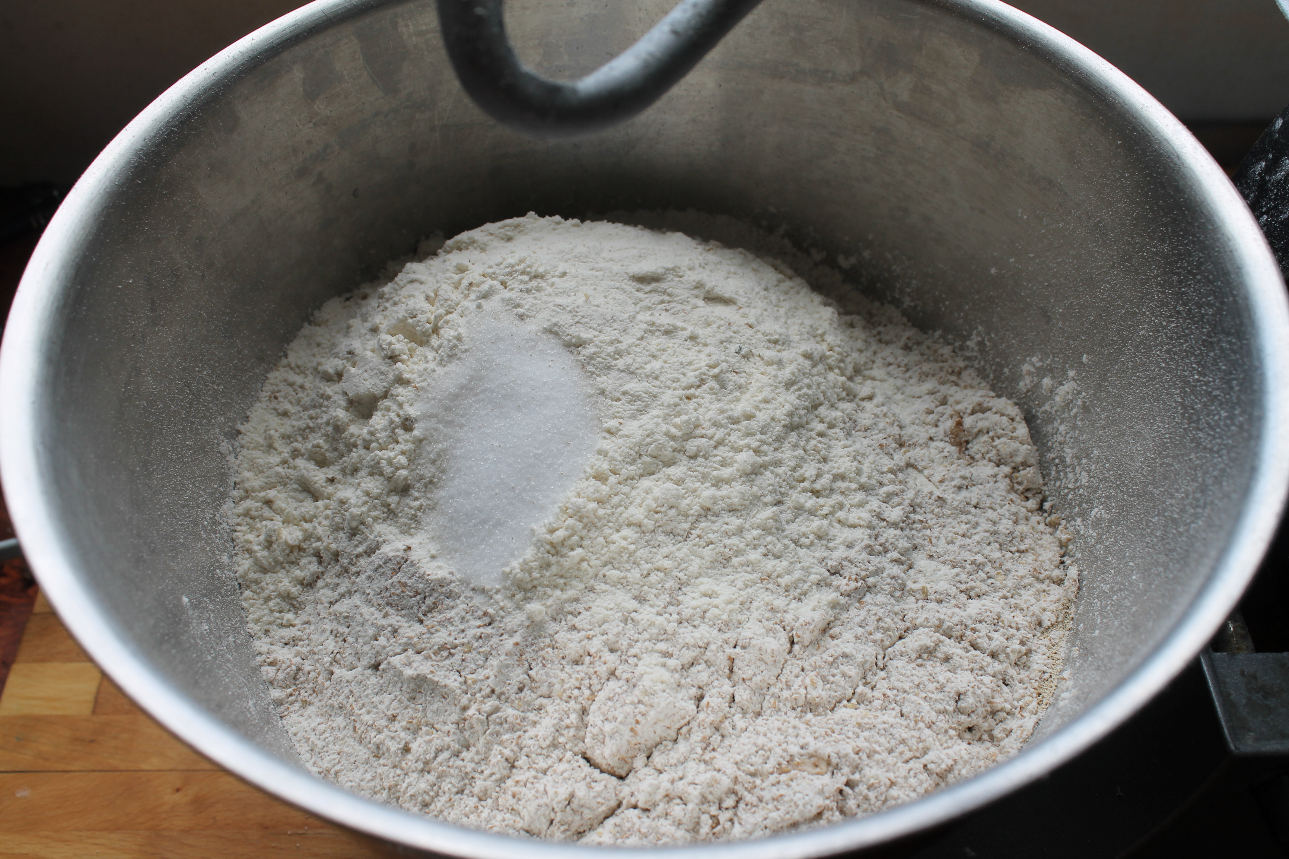 Ég setti svo 500 g af heilhveiti, 350 g af hveiti og 2 tsk af salti út í, setti hnoðkrókinn á hrærivélina og hnoðaði deigið rólega í nokkrar mínútur. Ef ég hefði ætlað að baka deigið í formi eða hrúga því bara á plötuna hefði ég látið þar við sitja en þar sem ég ætlaði að fletja deigið út var það heldur lint svo ég bætti við svona 50 g af hveiti, gæti þurft meira.