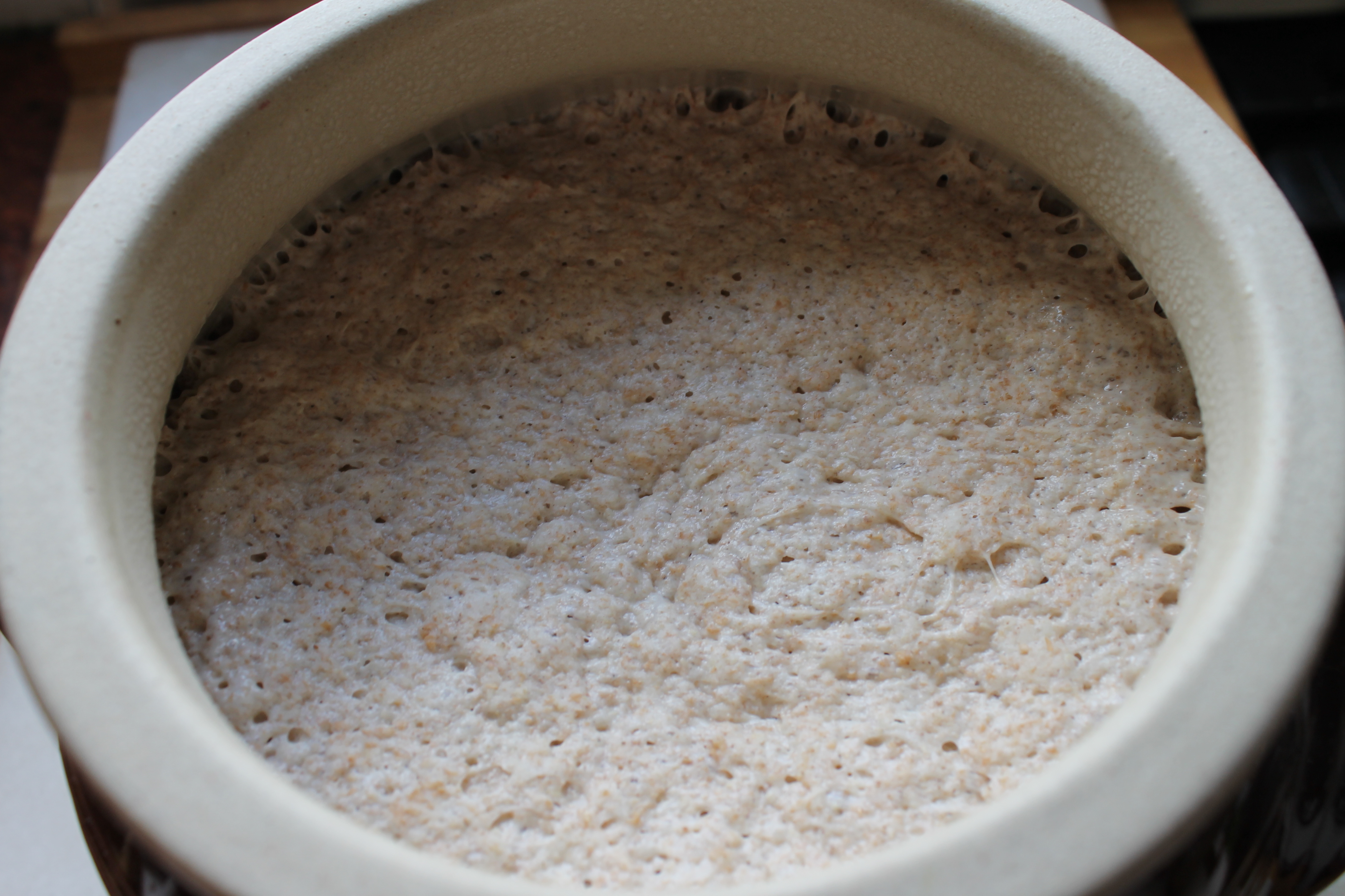 Það var ekkert deig í krukkunni minni svo að ég byrjaði á að búa það til. Ákvað að gera heilhveitibrauð (eða birgðastaðan ákvað það eiginlega fyrir mig, ég sá að hvíta hveitið mundi ekki nægja) og svo veitir mér ekkert af grófmeti eftir öll fínheitin síðustu dagana. Og ég gerði skammt sem dugir í tvö brauð og baka því örugglega aftur á – ja, líklega á sunnudag, nú á ég deig í ísskápnum.
