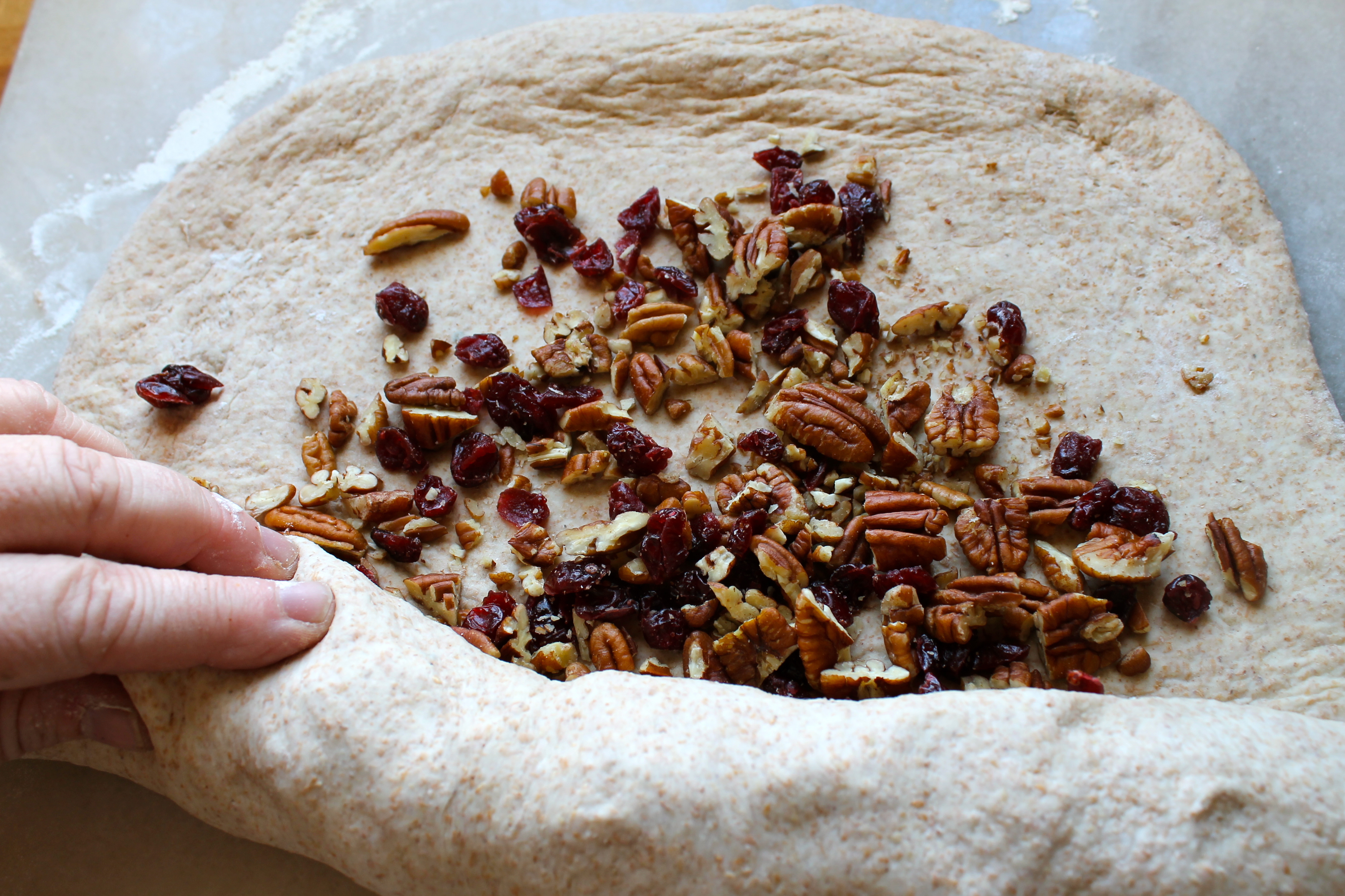 Svo grófsaxaði ég 80 g af pekanhnetum, blandaði saman við 40 g af þurrkuðum trönuberjum (mætti líka nota t.d. rúsínur, eða eintómar hnetur), stráði jafnt á deigið (þó ekki kantana) og rúllaði því upp í lengju. Braut endana á rúllunni inn til að loka þeim.
