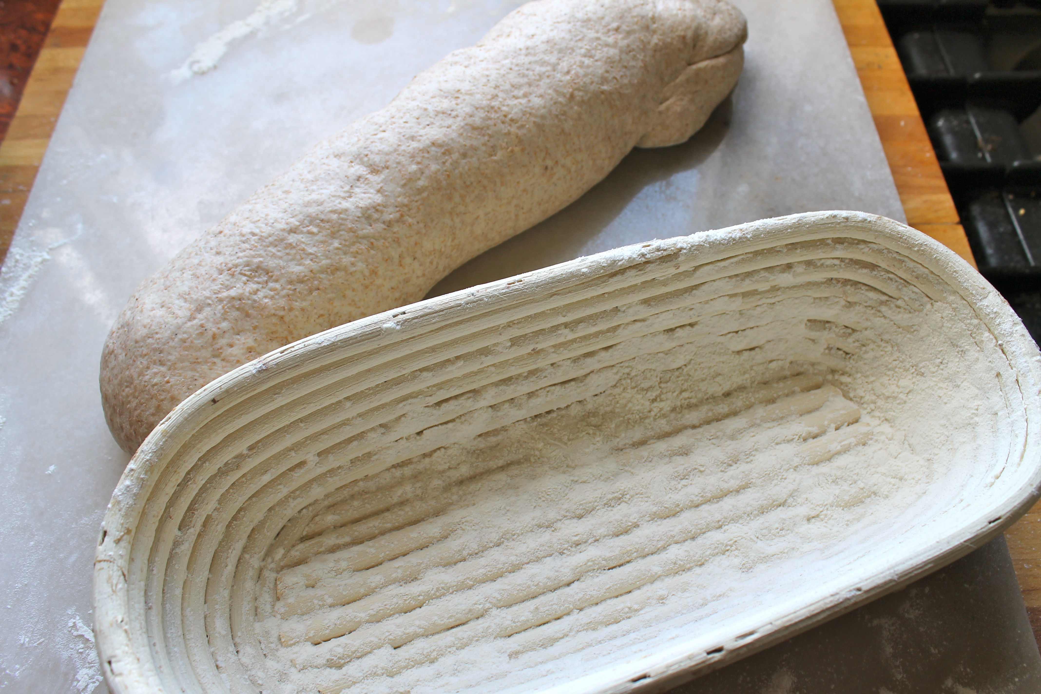 Ég tók svo aflanga hefunarkörfu, stráði hveiti í hana og setti deiglengjuna í hana og lét samskeytin snúa upp. Ég var nærri búin að láta þau snúa niður af því að það gerir maður venjulega þegar eitthvað svona er sett í form – en á síðustu stundu mundi ég að hefunarkarfan er einmitt ekki form og það sem snýr upp í hefuninni mun snúa niður á brauðinu.