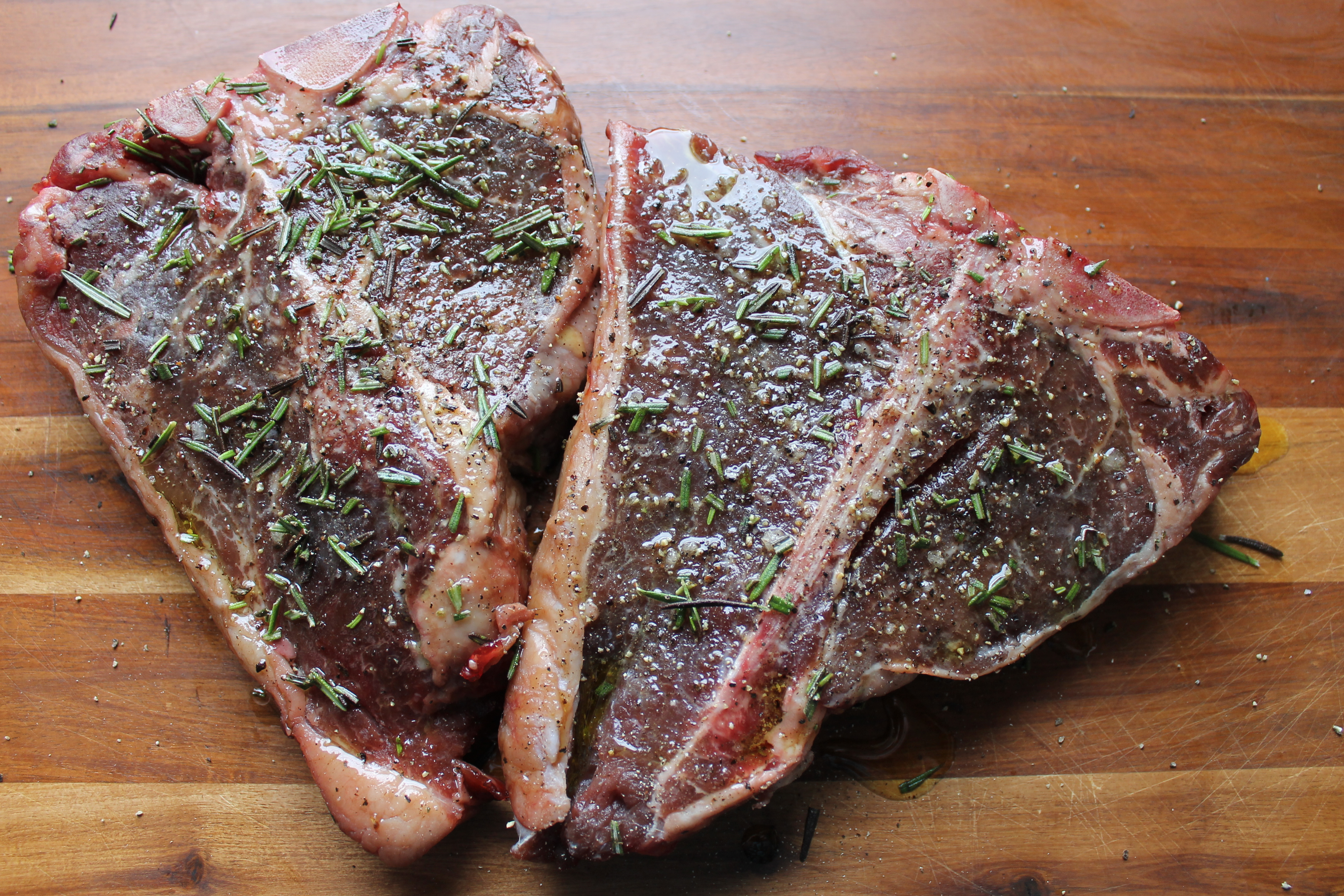 Þær voru reyndar merktar og seldar sem T-bein-steikur en þetta eru porterhouse-steikur, það fer ekkert á milli mála. Þessu er svosem oft ruglað saman, enda hvorttveggja bitar af aftanverðum hryggnum, en T-bein-steikin er skorin framar en porterhouse-steikin og henni fylgir þar af leiðandi minna af lundinni (lundin mjókkar fram eftir hryggnum). Porterhouse-steikin er því (finnst mér) betri biti – svo ekki kvarta ég … Þær voru þykkt skornar og vænar, hátt í 600 g hvor um sig.