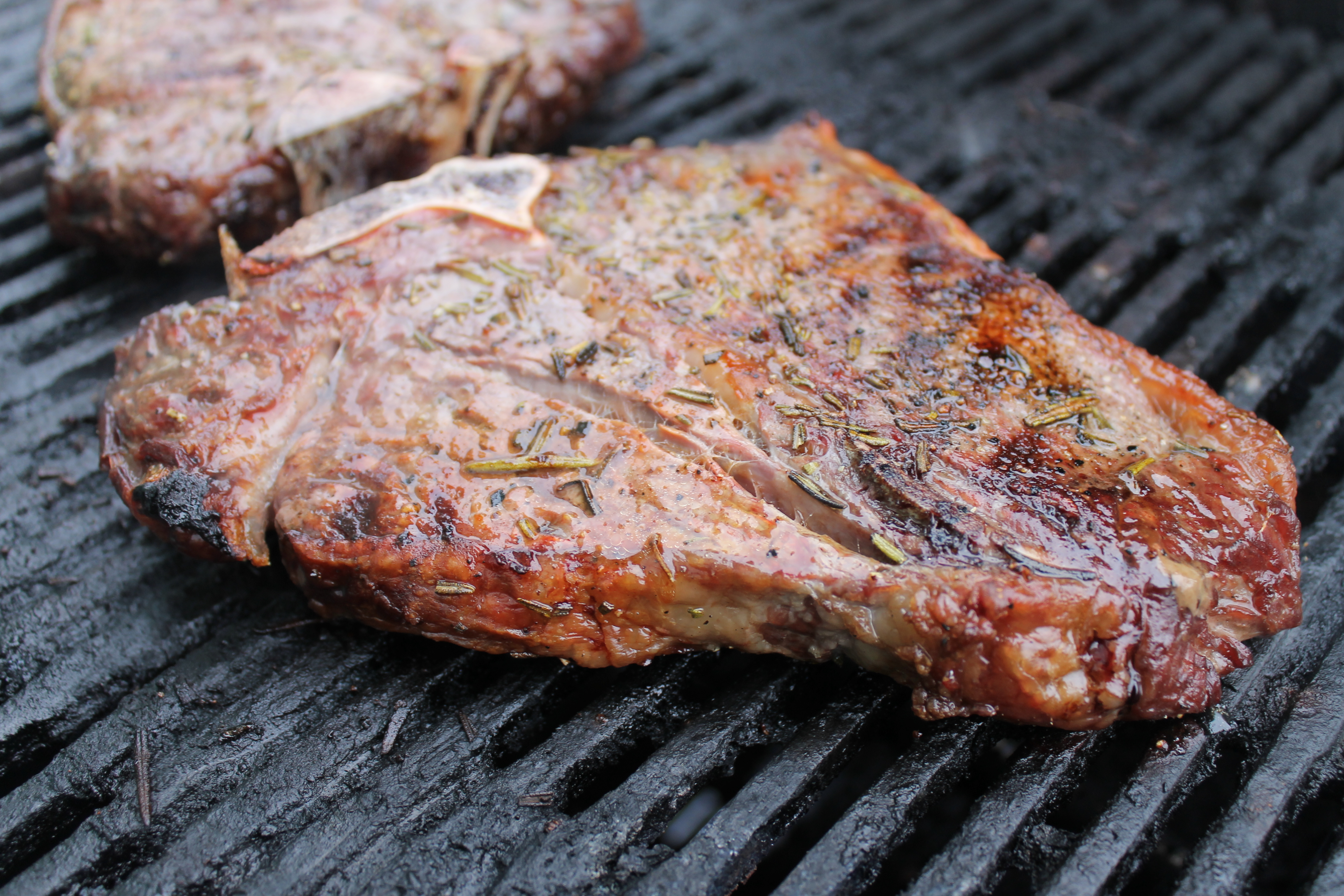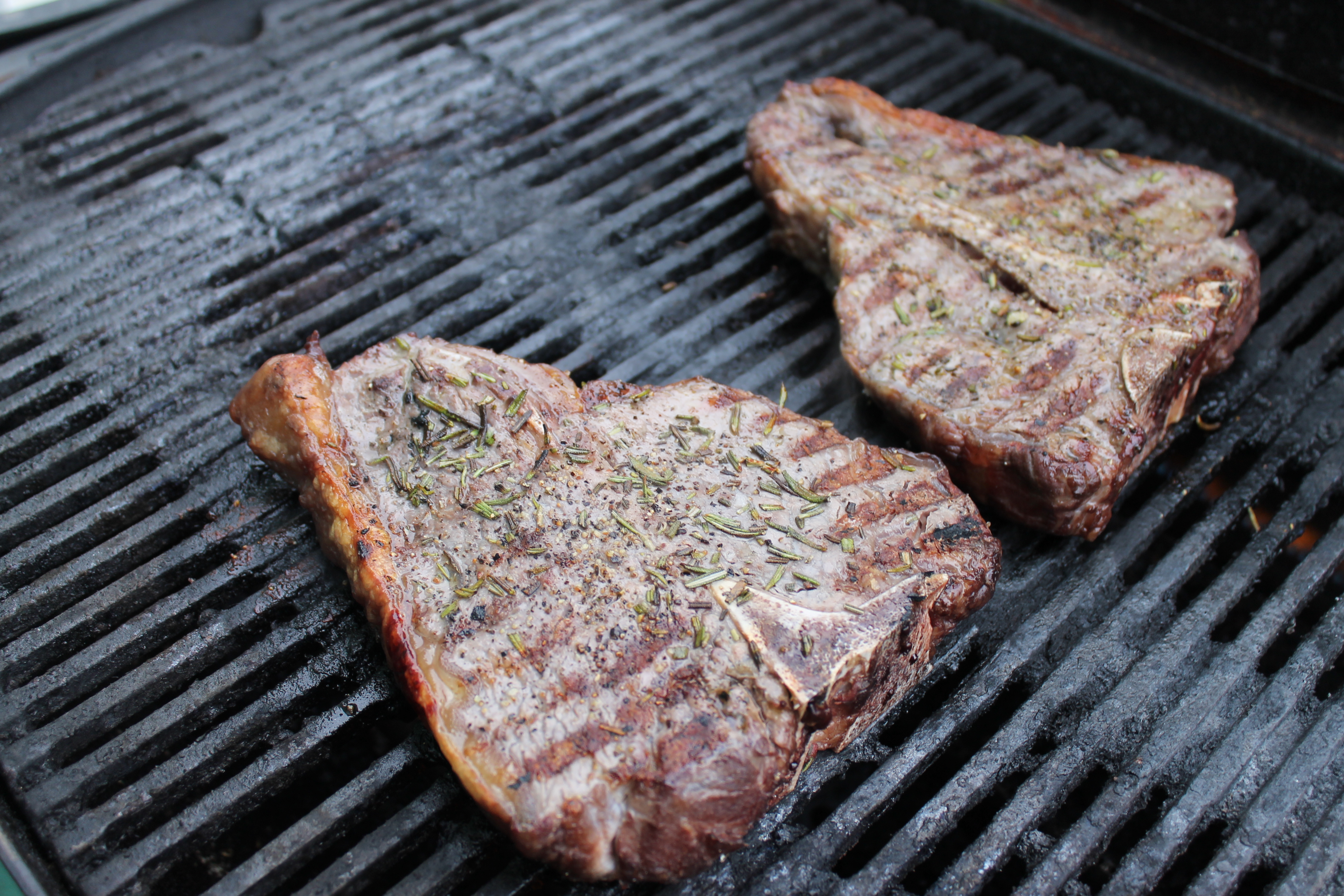 Ég kveikti svo á grillinu, stillti brennarana á fullt og lokaði því. Á meðan það var að hitna þerraði ég steikurnar vel með eldhúspappír, bar svo ögn af ólífuolíu á þær og kryddaði með nýmöluðum svörtum pipar og söxuðu rósmaríni.