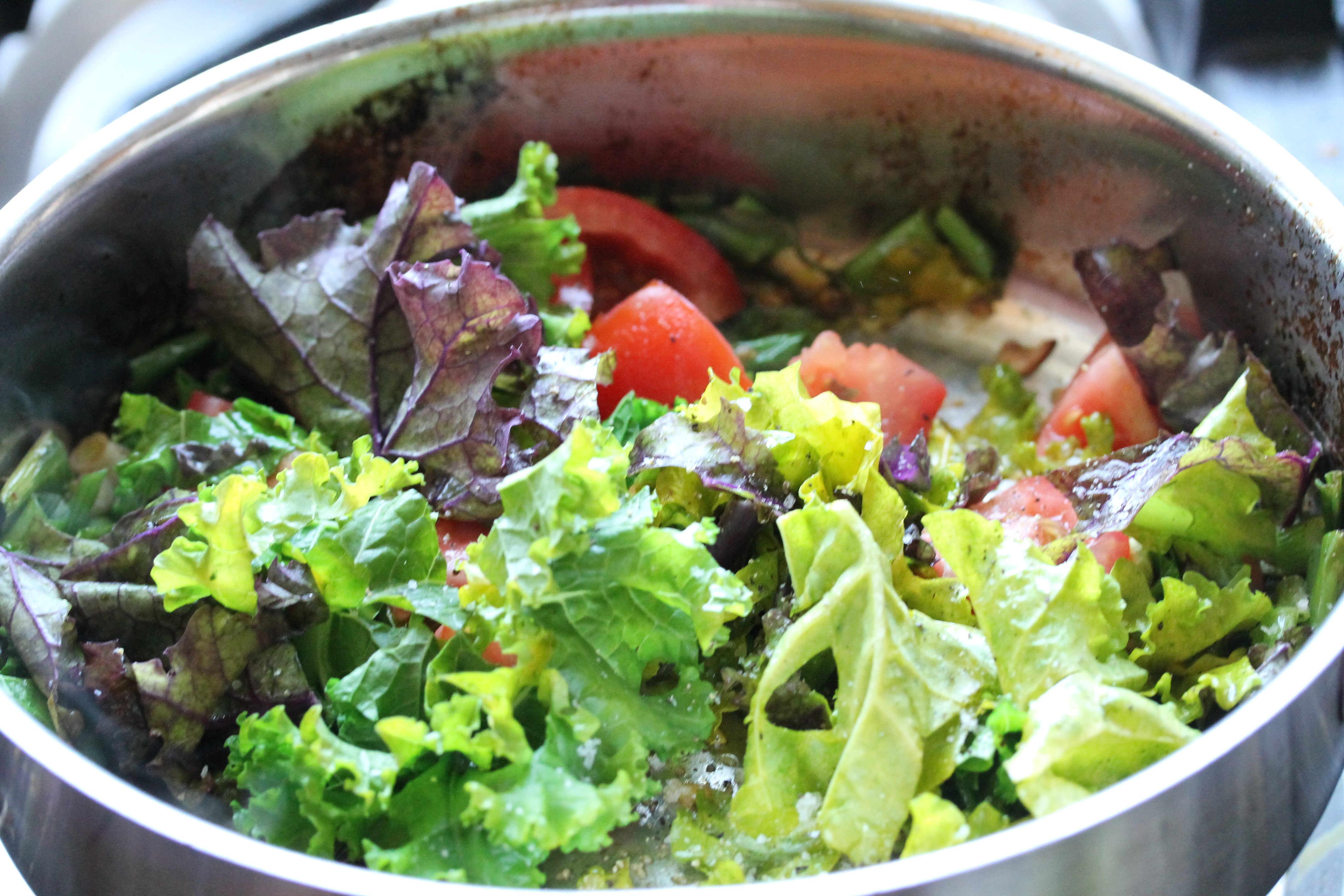 Ég setti svo tómatana á pönnuna og síðan grænkálið, kryddaði með pipar og salti, bætti við svona 1 msk af furuhnetum (má sleppa) og lét þetta krauma við fremur vægan hita í 6-8 mínútur.