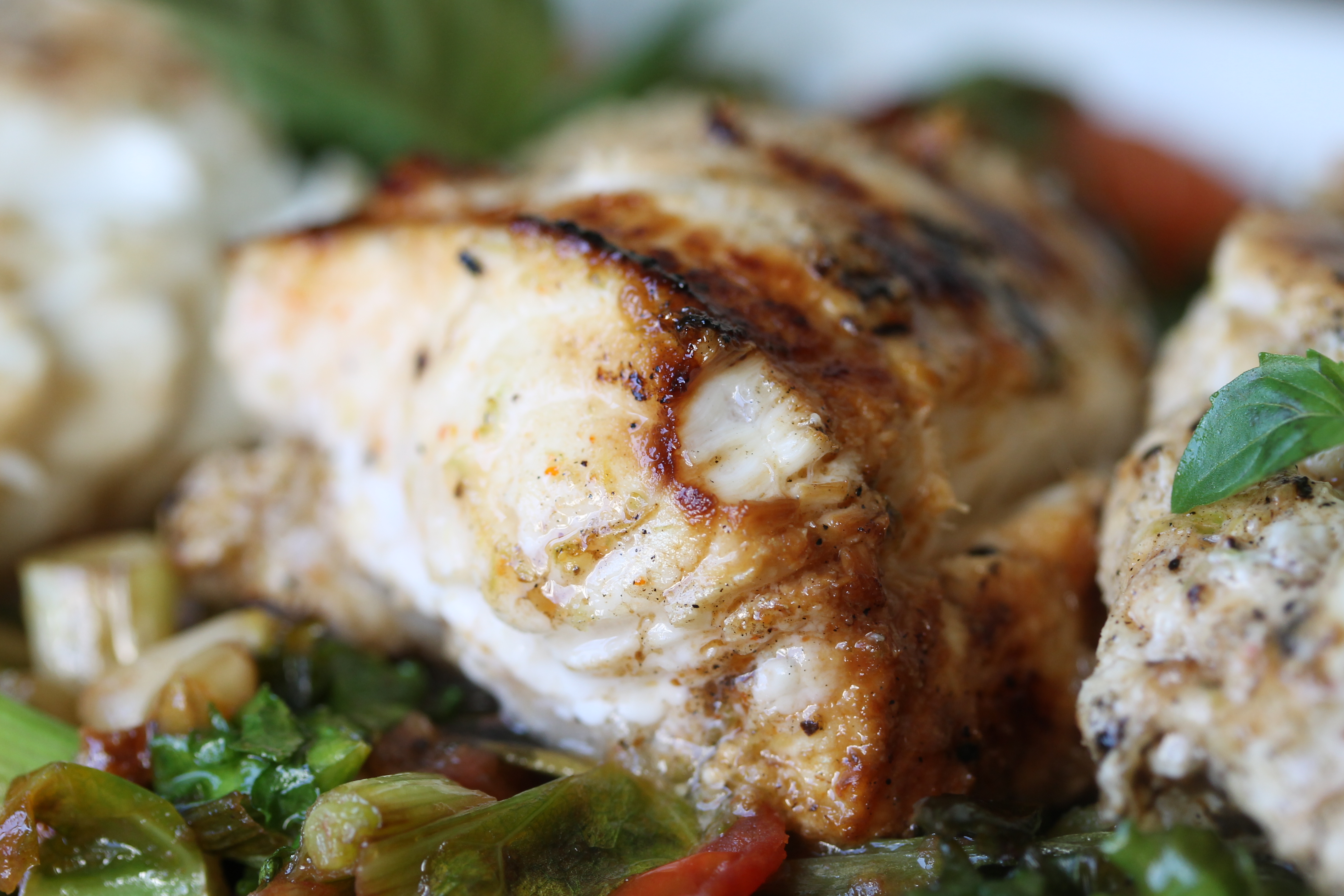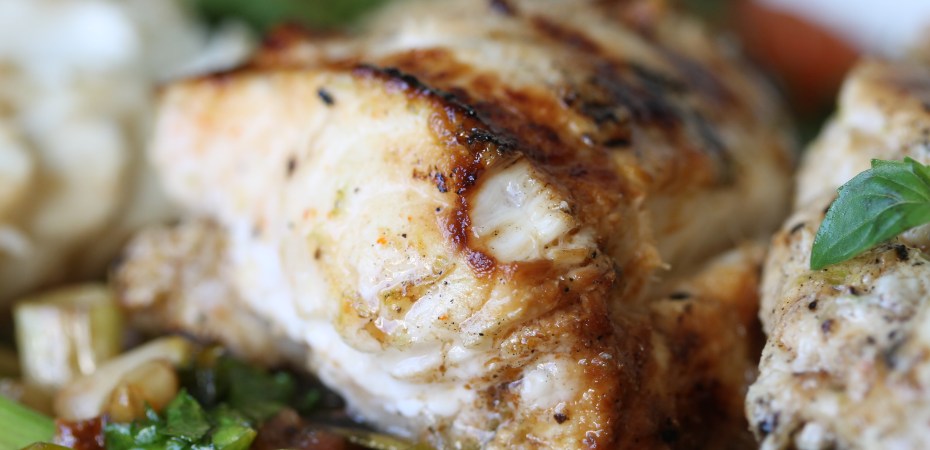 Nú var grillið orðið vel heitt og ég penslaði það meö smávegis olíu, setti steinbítinn á það og grillaði í 3 mínútur á annarri hliðinni – um að gera að hreyfa ekkert við honum hann festist kannski við grillið fyrst en ætti svo að losna af sjálfu sér – annars má renna spaða undir hann og snúa honum. Ég held ég hafi grillað hann í svona 2 mínútur á hinni hliðinni.