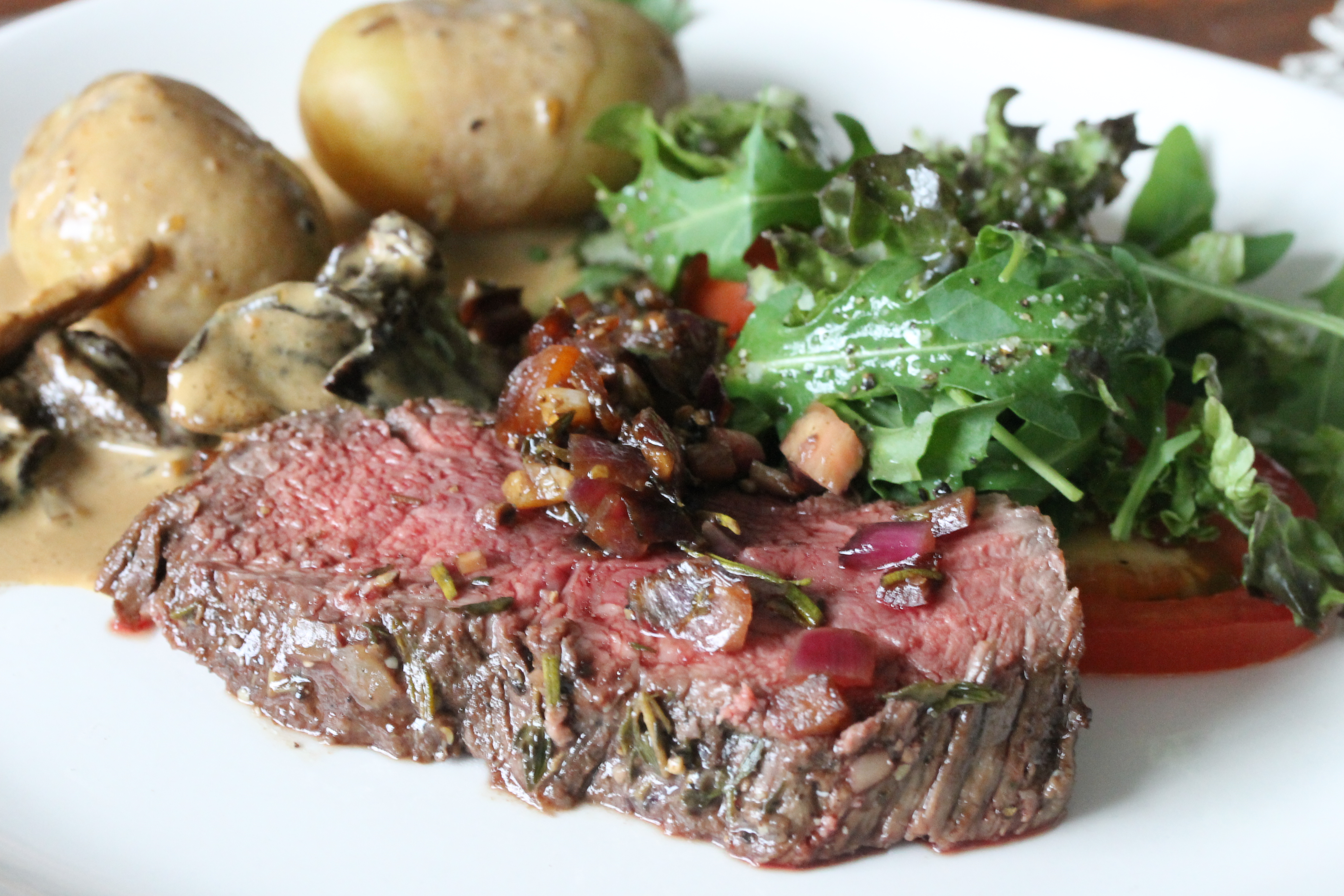 Svo bar ég kjötið fram með laukblöndunni, soðnum nýjum kartöflum, sveppasósu og grænu salati og tómötum. Afskaplega meyrt og gott.