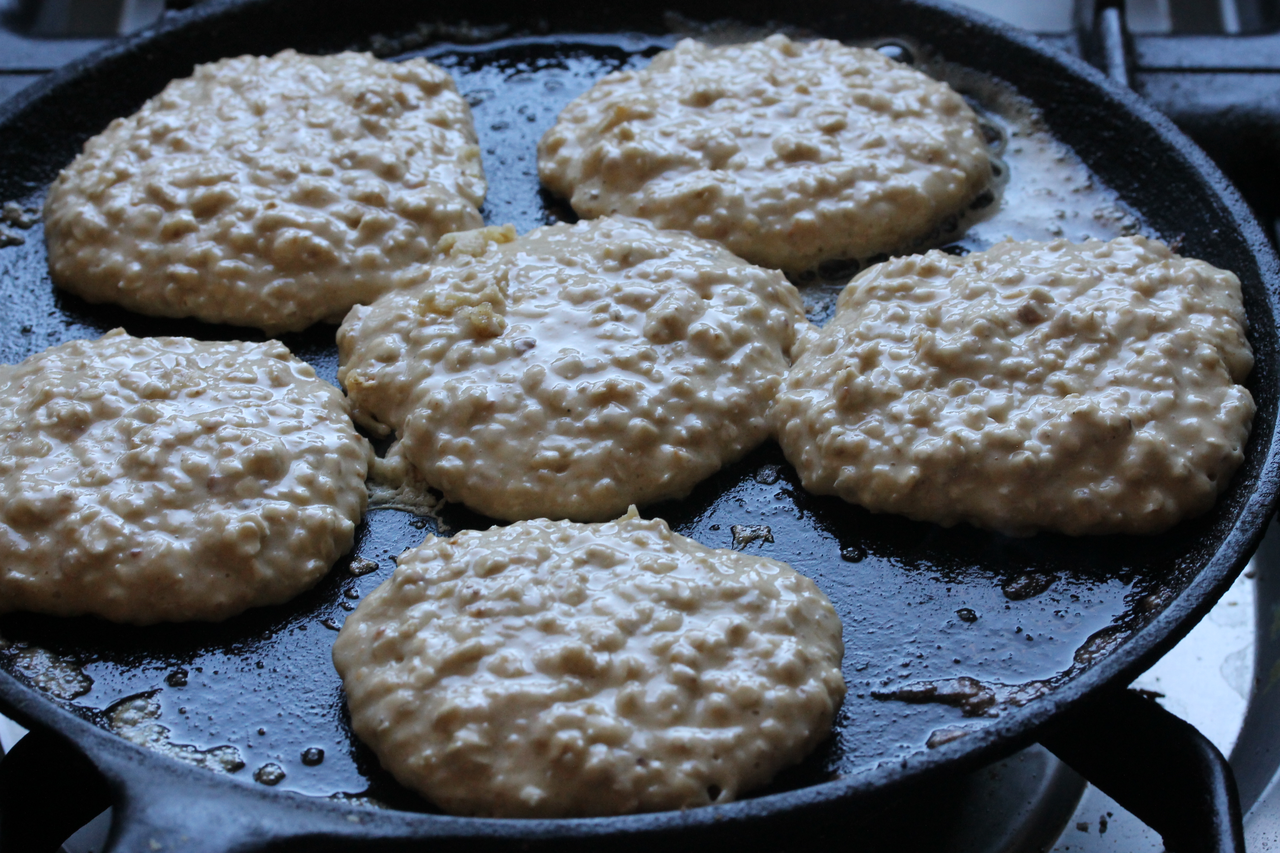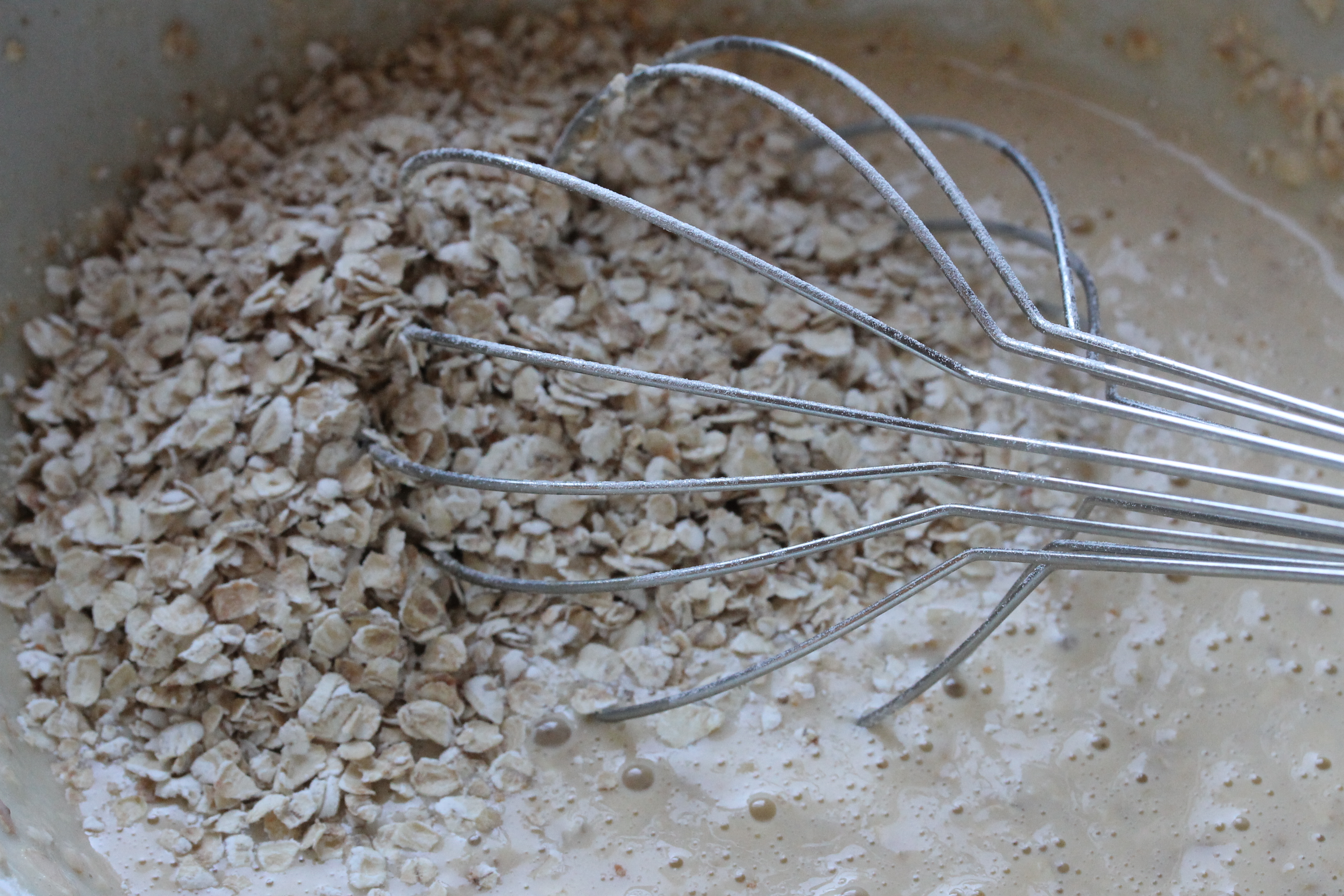 Og síðan blandaði ég 150 g af hafragrjónum saman við. Deigið á að vera þykkt, svo þykkt að það renni frekar lítið út á pönnunni og skonsurnar verði þykkar, en þó ekki þurrt. Það má þynna það með mjólk eða þykkja það með ögn af hveiti eftir þörfum, en þó ekki fyrr en búið er að bræða 50 g af smjöri og hræra saman við (eða 3-4 msk af olíu).