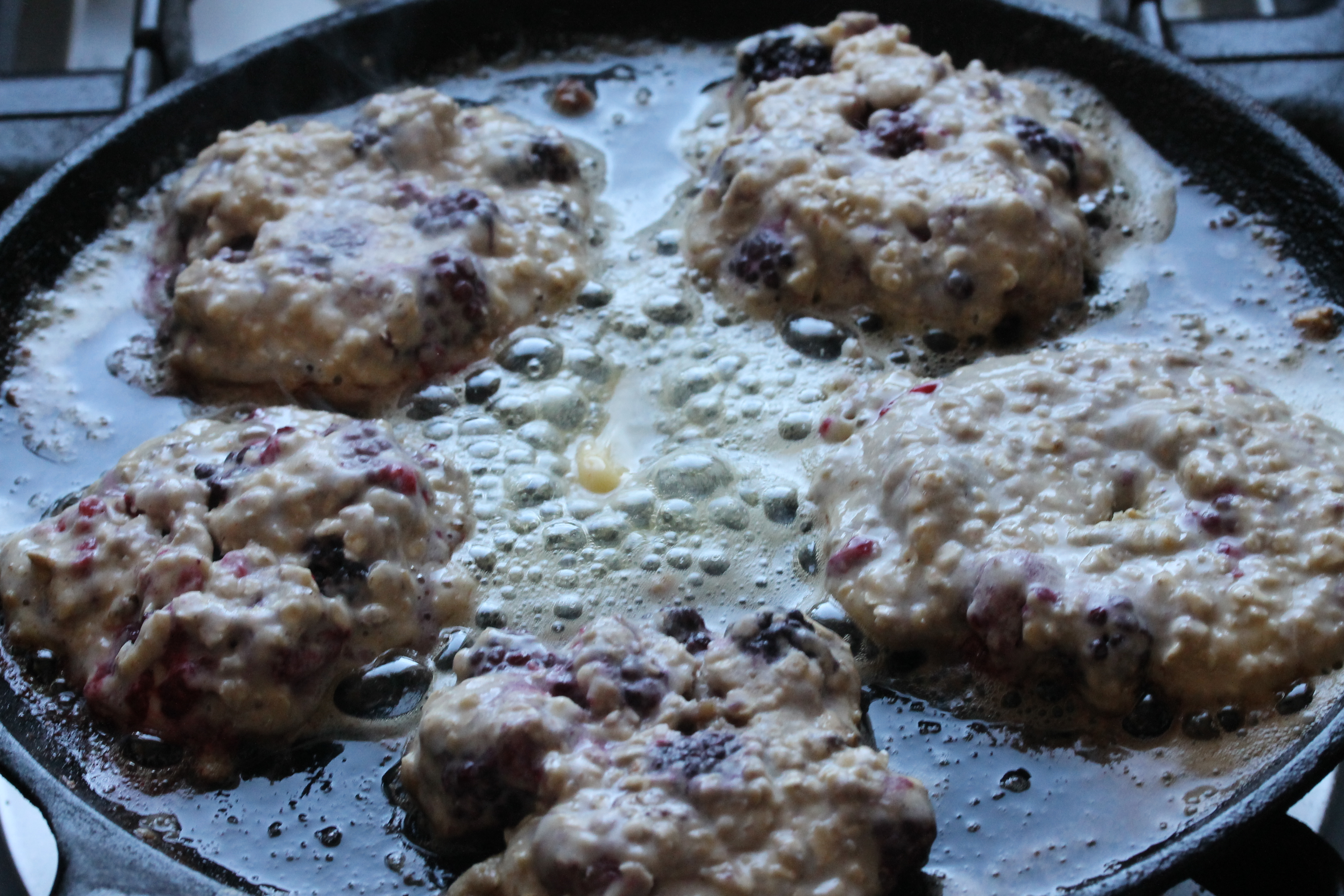 Ég blandaði lófafylli af f hindberjum og lófafylli af brómberjum saman við afganginn af deiginu og steikti skonsur/lummur úr því líka.