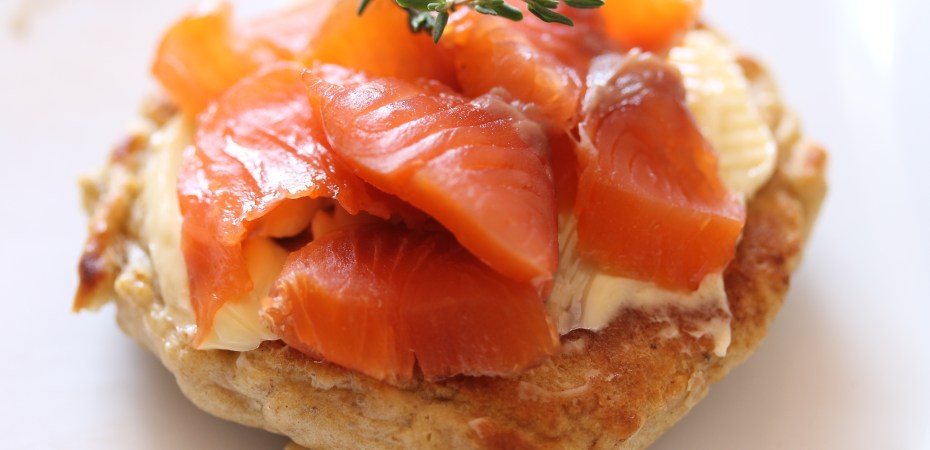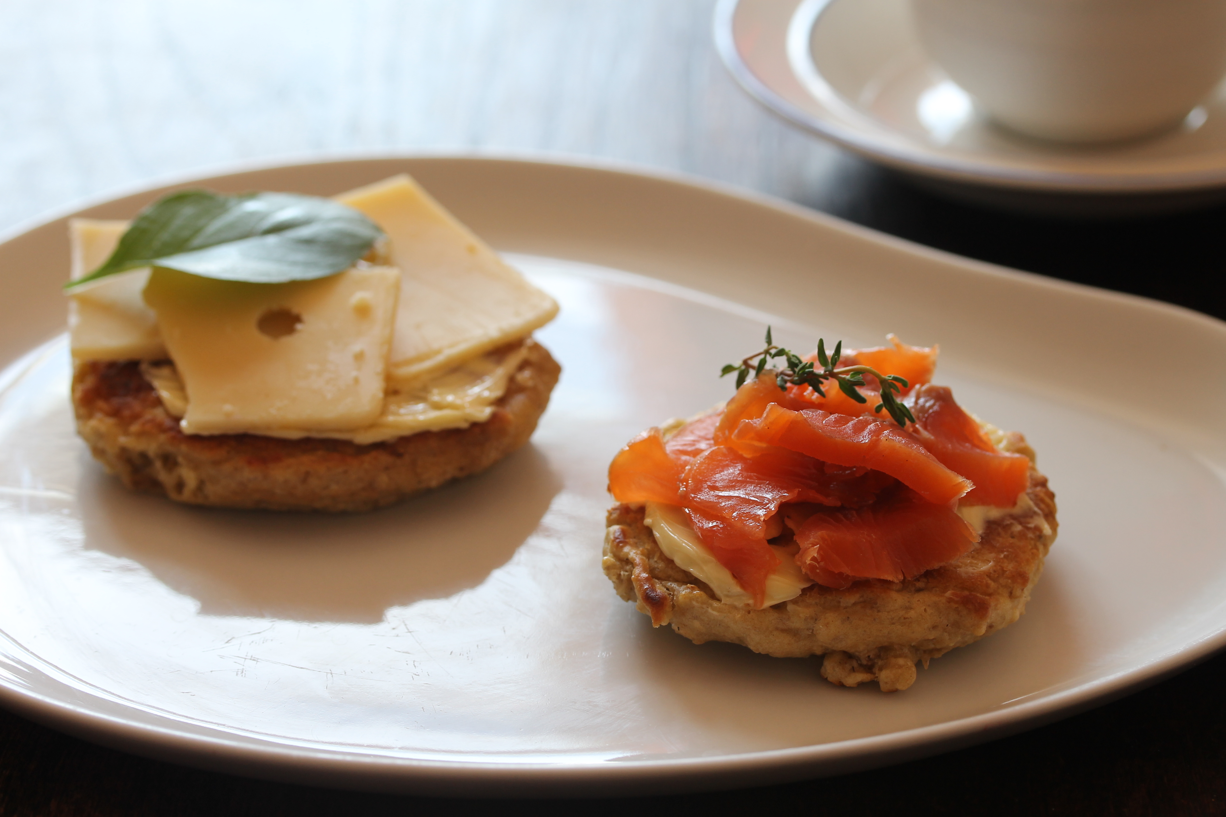 Þessar ósætu lét ég kólna alveg og smurði þær svo og setti álegg á þær. Primadonnaost og reyktan lax í þessu tilviki en það má vera hvað sem er. Þessar með basilíkunni voru líka mjög góðar með eintómu smjöri.