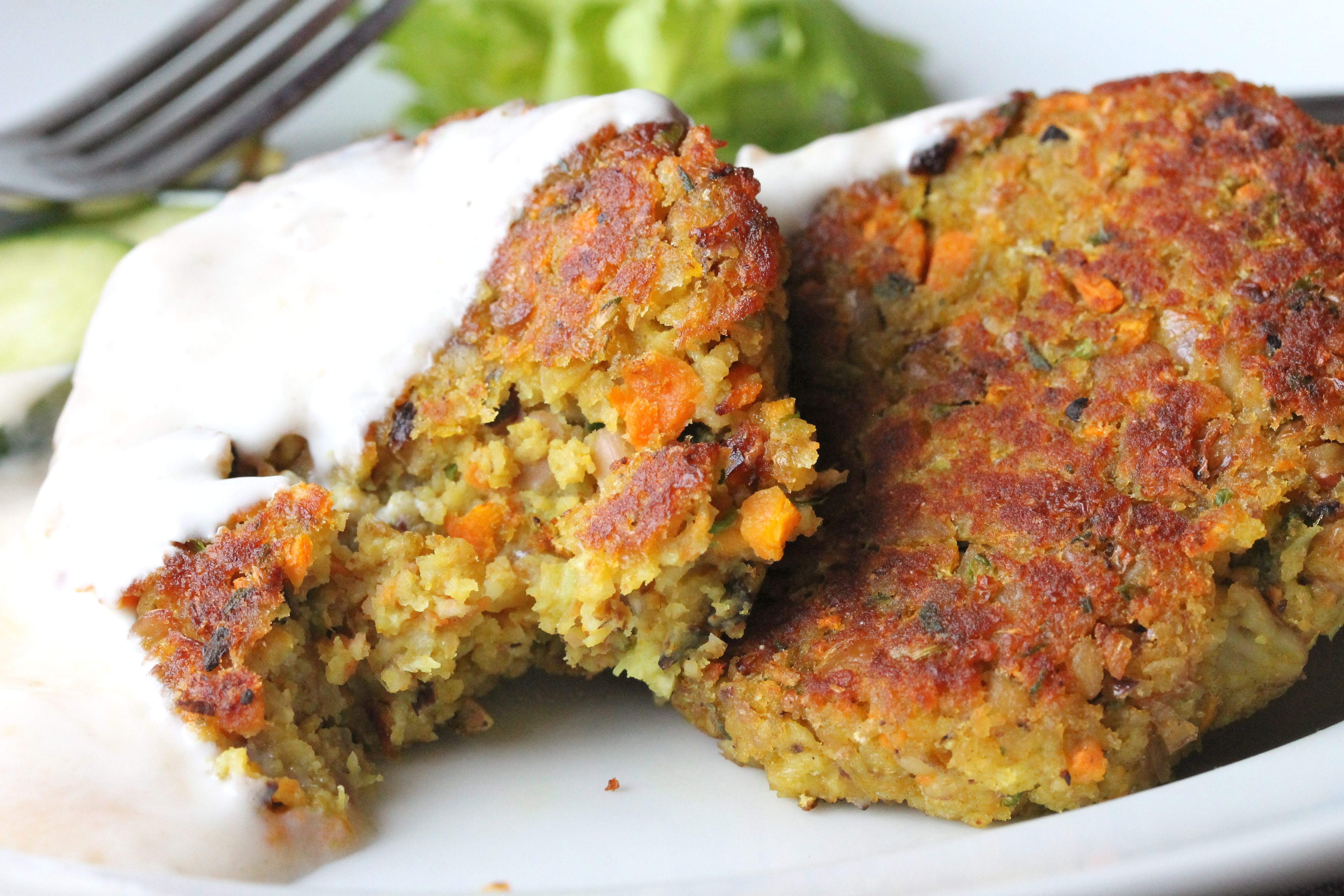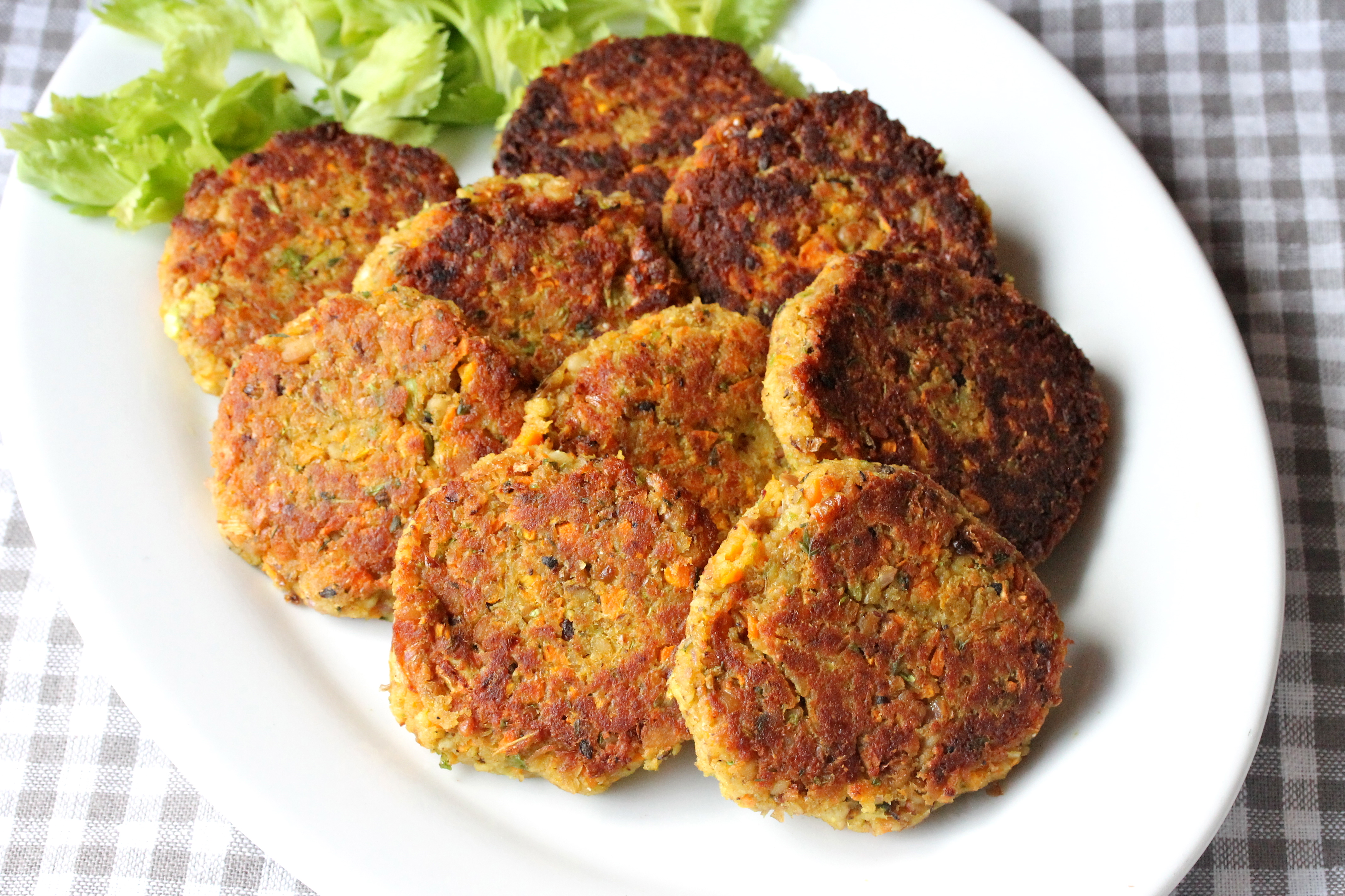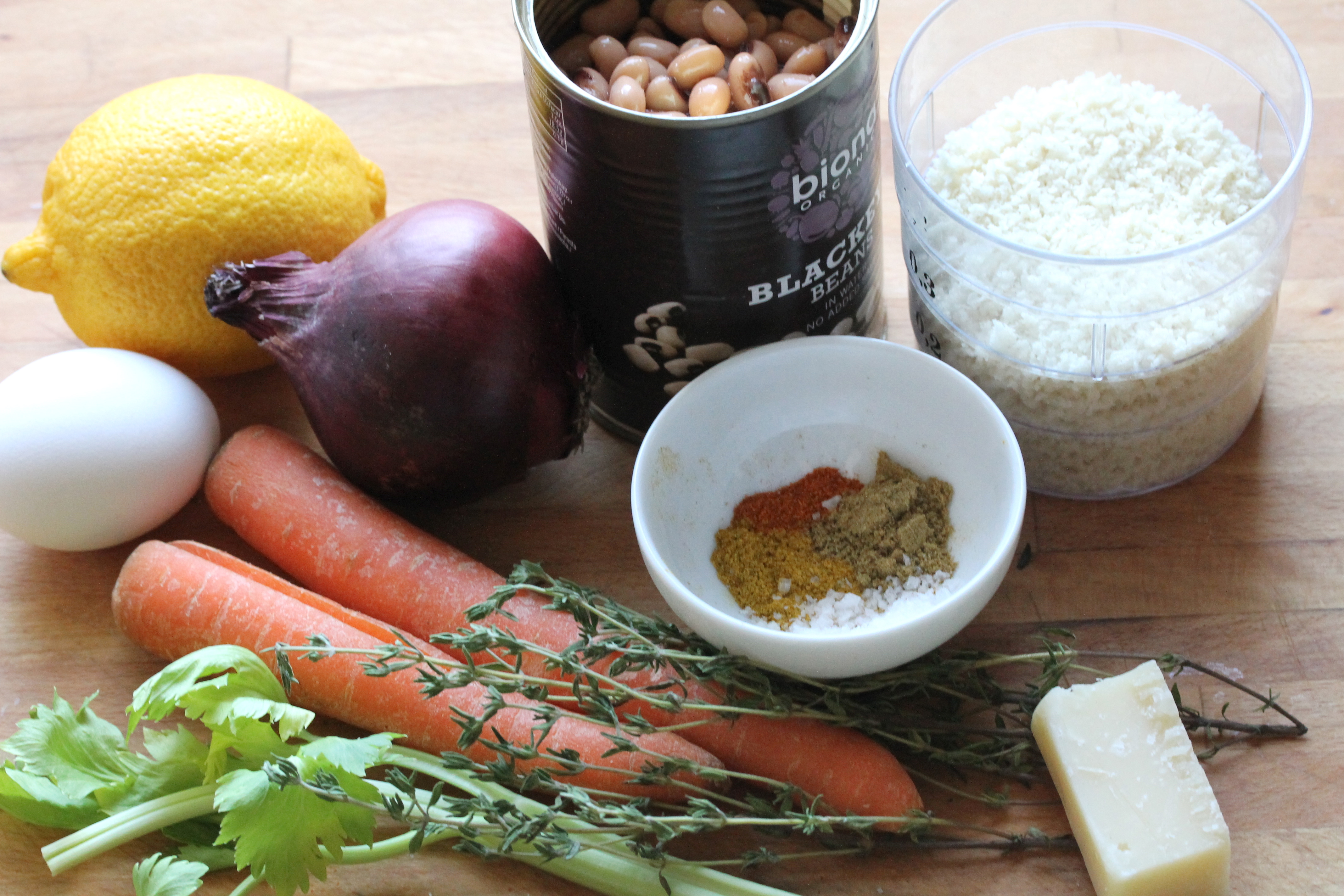 Svo var ég með tvær gulrætur (frekar litlar), sellerístöngul, rauðlauk, eitt egg, sítrónu (notaði bara börkinn), nokkrar timjangreinar (má líka vera þurrkað timjan), smábita af parmesanosti (má sleppa), 200 ml af raspi (ég notaði panko-rasp, má vera venjulegt), 1 msk af karrídufti, 1 tsk af kummini, ögn af cayennepipar og salt. Það má annars nota hvaða krydd sem mann lystir en það er best að vera ekkert að spara það sérstaklega.