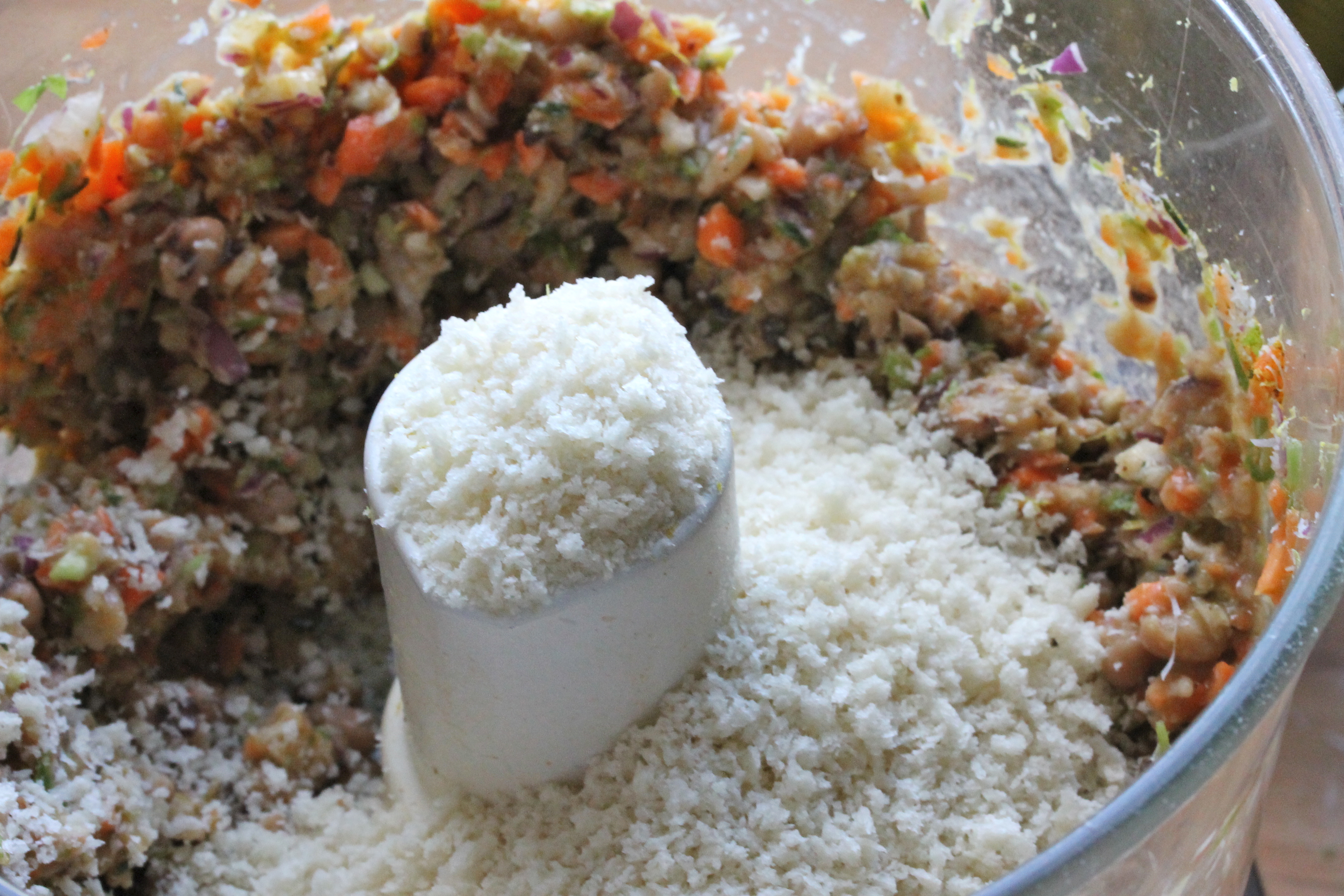 Hellti öllum leginum af baununum og setti þær út í ásamt egginu og kryddinu. Notaði púlshnappinn á vélinni til að grófmala baunirnar því ég vildi alls ekki að þetta yrði að fínu mauki.