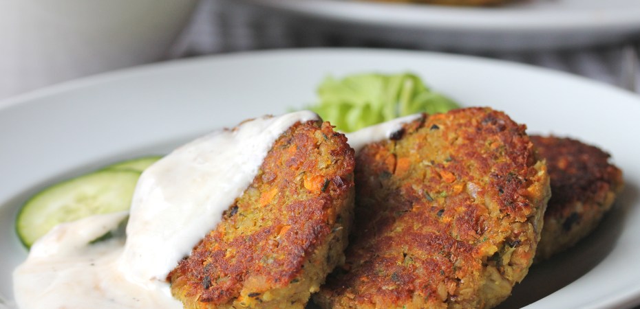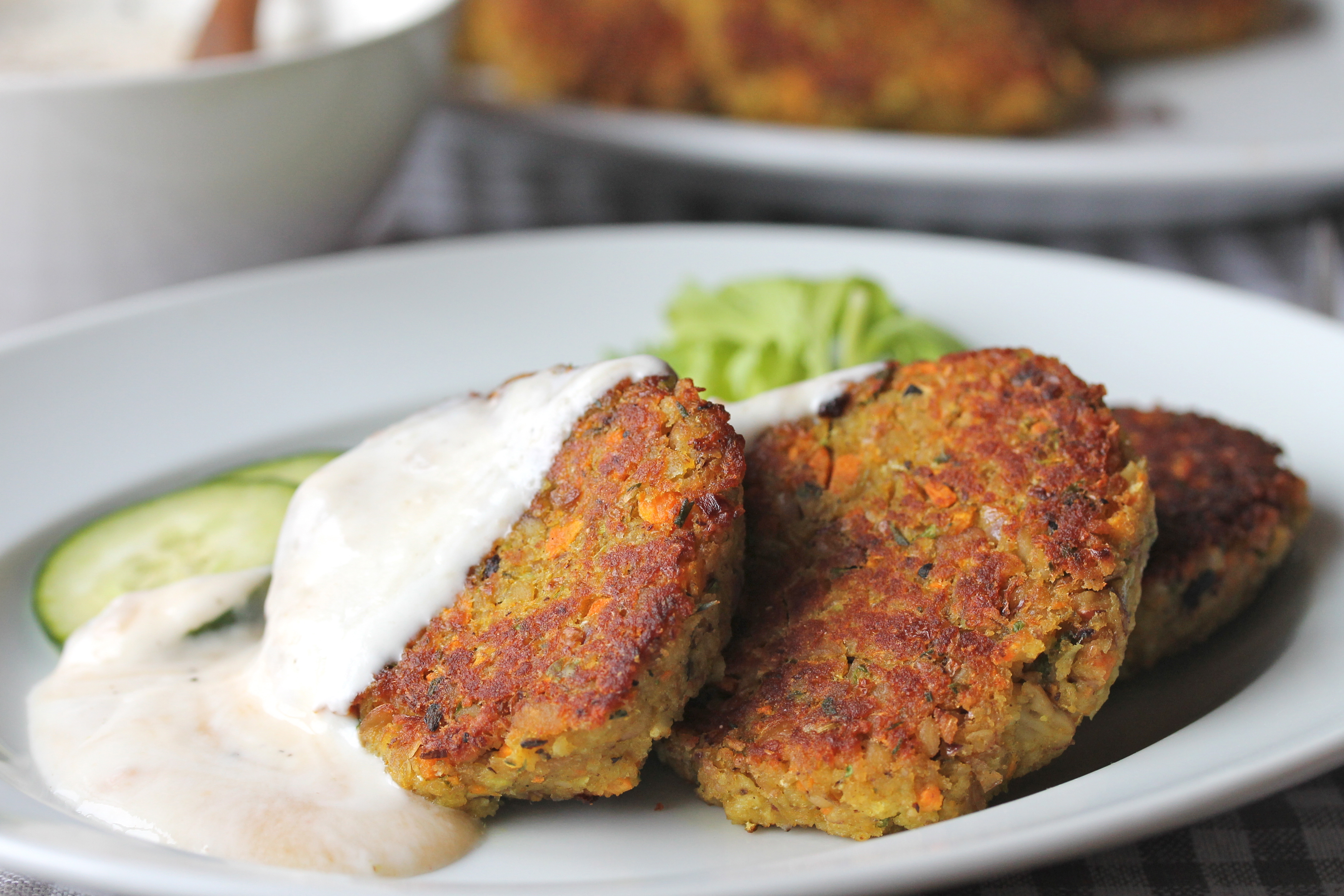 Þar sem buffin innihalda bæði baunir og grænmeti er kannski ekki endilega þörf á miklu meðlæti. Ég hefði þó haft grænt salat ef ég hefði átt einhver salatblöð en lét nægja að hafa gúrkusneiðar og sellerílauf með, auk mangójógúrtsósunnar.