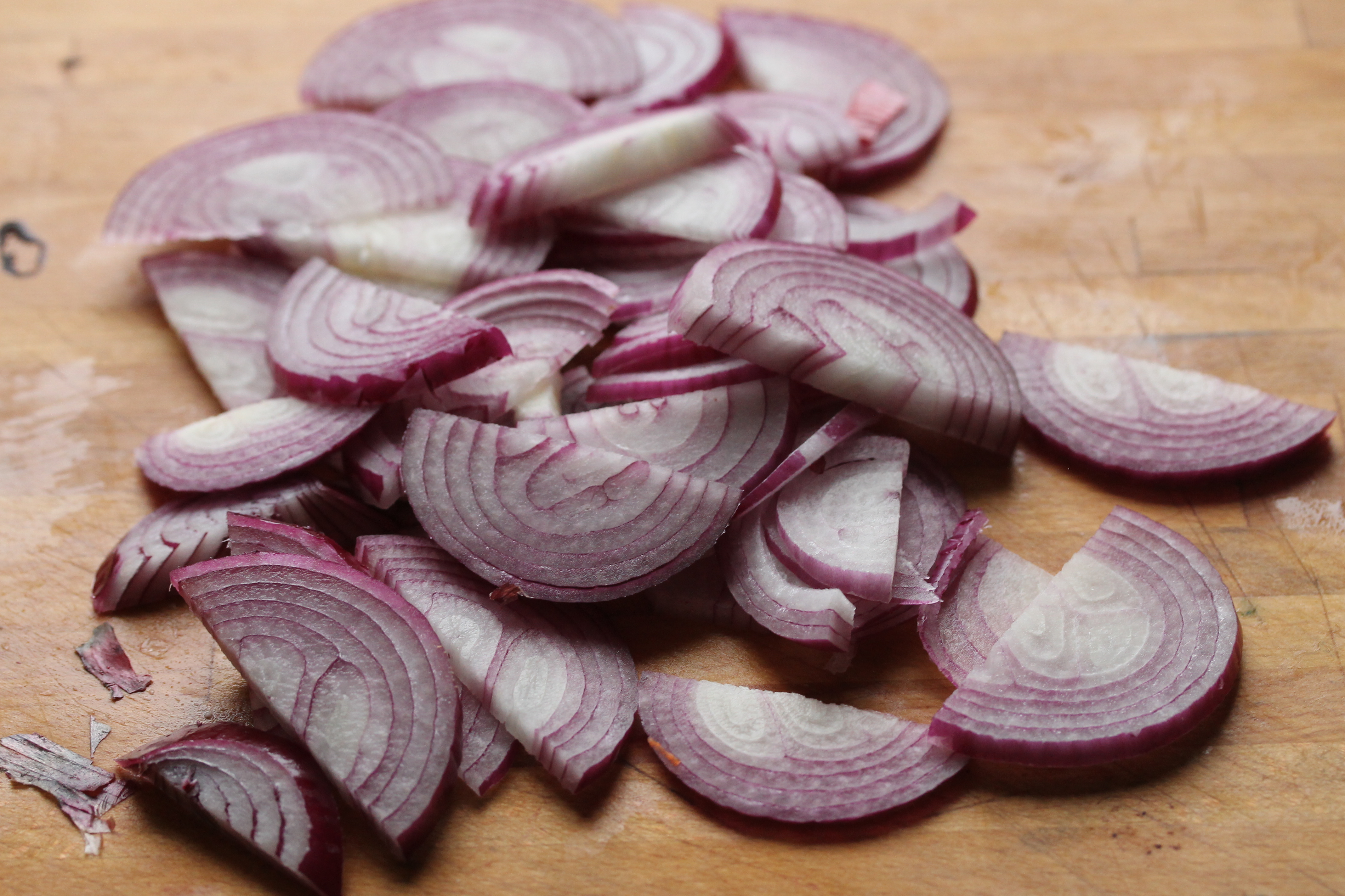 Ég tók enga mynd af öllu hráefninu í upphafi eins og ég geri oft, einfaldlega vegna þess að ég var alls ekki búin að ákveða nákvæmlega hvað ég ætlaði að gera þótt ég væri með nokkuð klára hugmynd í kollinum. En ég byrjaði á að flysja tvær bökunarkartöflur og þrjár meðalstórar gulrætur og skera í bita, setja í pott og sjóða. Svo tók ég tvo rauðlauka, helmingaði þá og skar svo helmingana í frekar þunnar sneiðar.