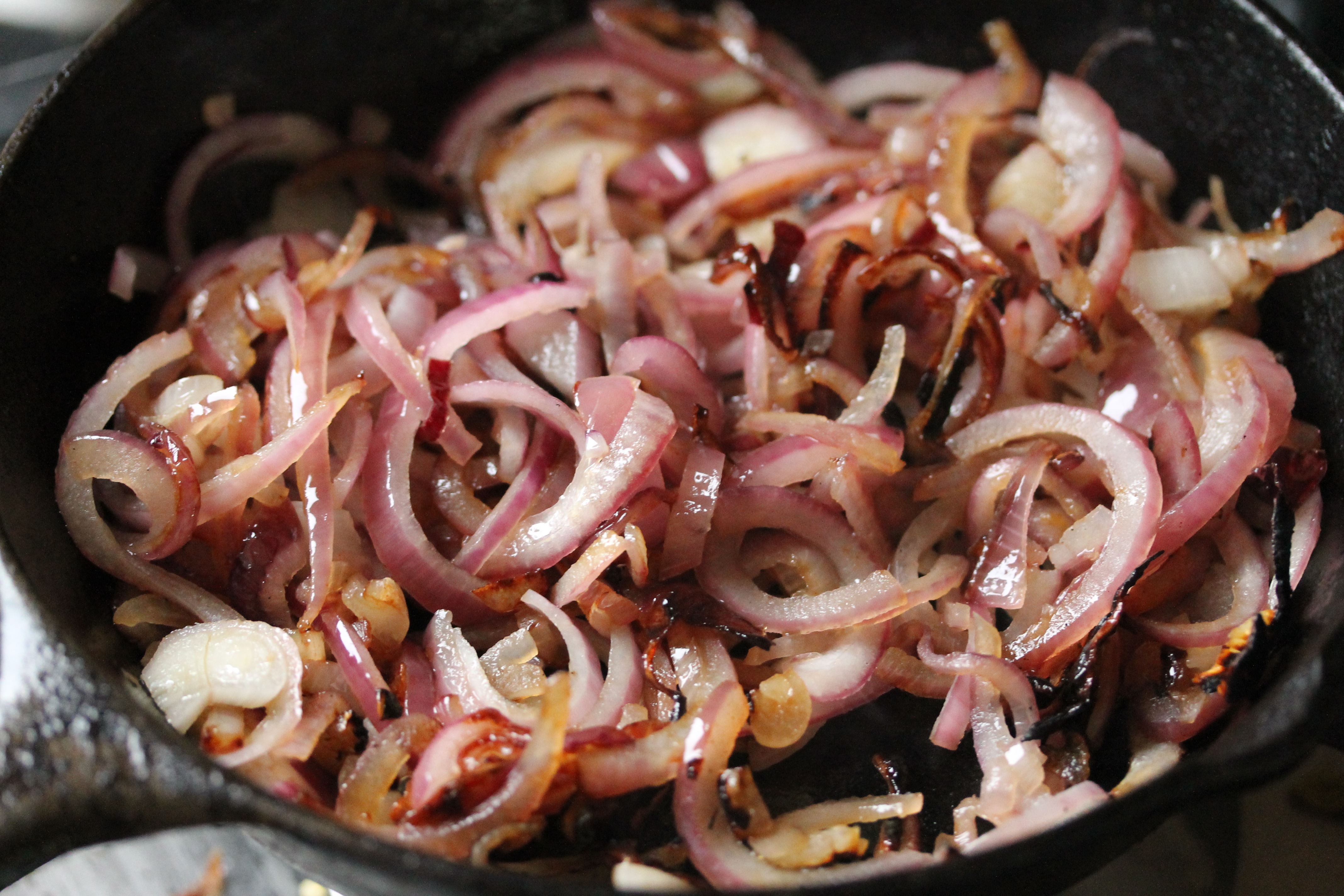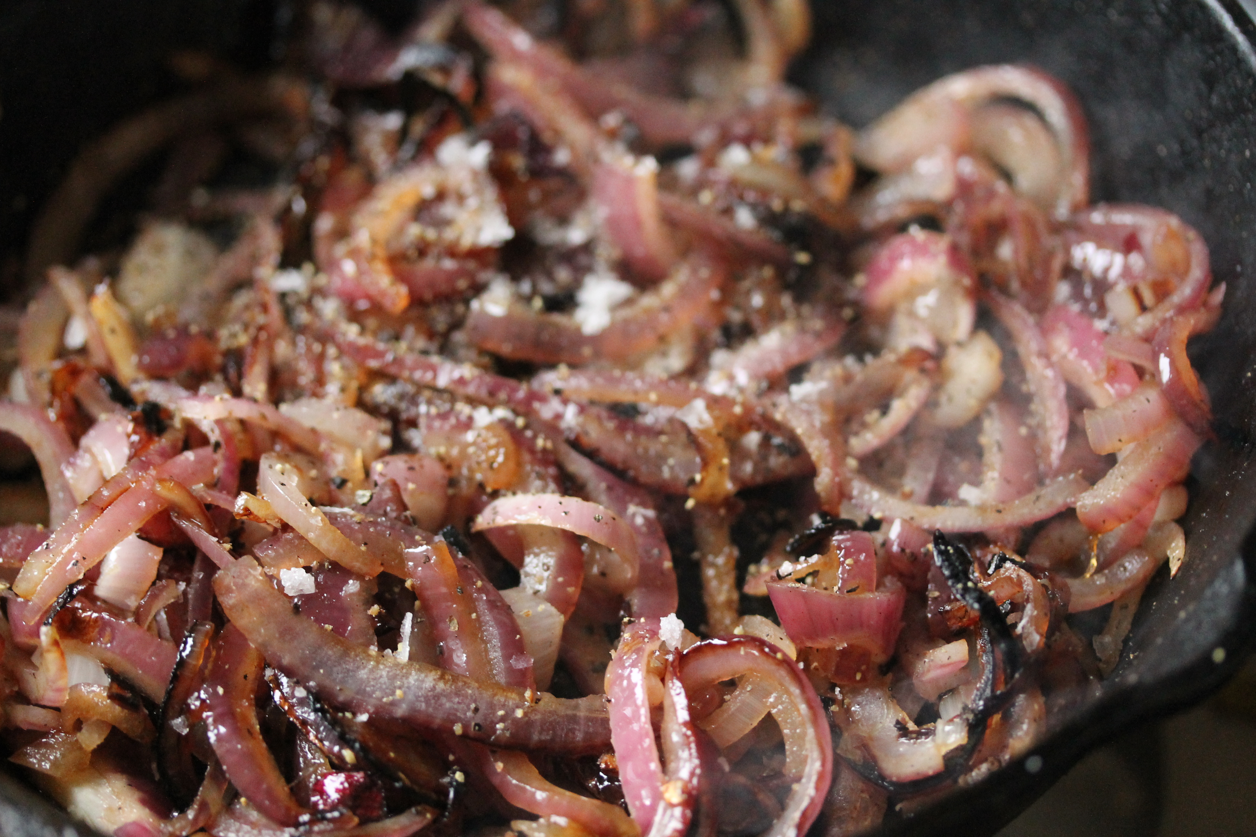 Mér finnst betra að nota frekar litla pönnu í svona, laukurinn steikist jafnar og brennur síður (ef maður hrærir). Sumir mundu setja svolítinn sykur út á en ég geri það yfirleitt ekki, vil láta laukinn karamelliserast af sjálfu sér og ekki vera of sætan á bragðið (en stundum vill maður samt hafa hann dálítið sætan). Ég kryddaði hann aftur á móti með pipar og salti og lét krauma áfram þar til hann var hæfilegur en tók þá pönnuna af hitanum.