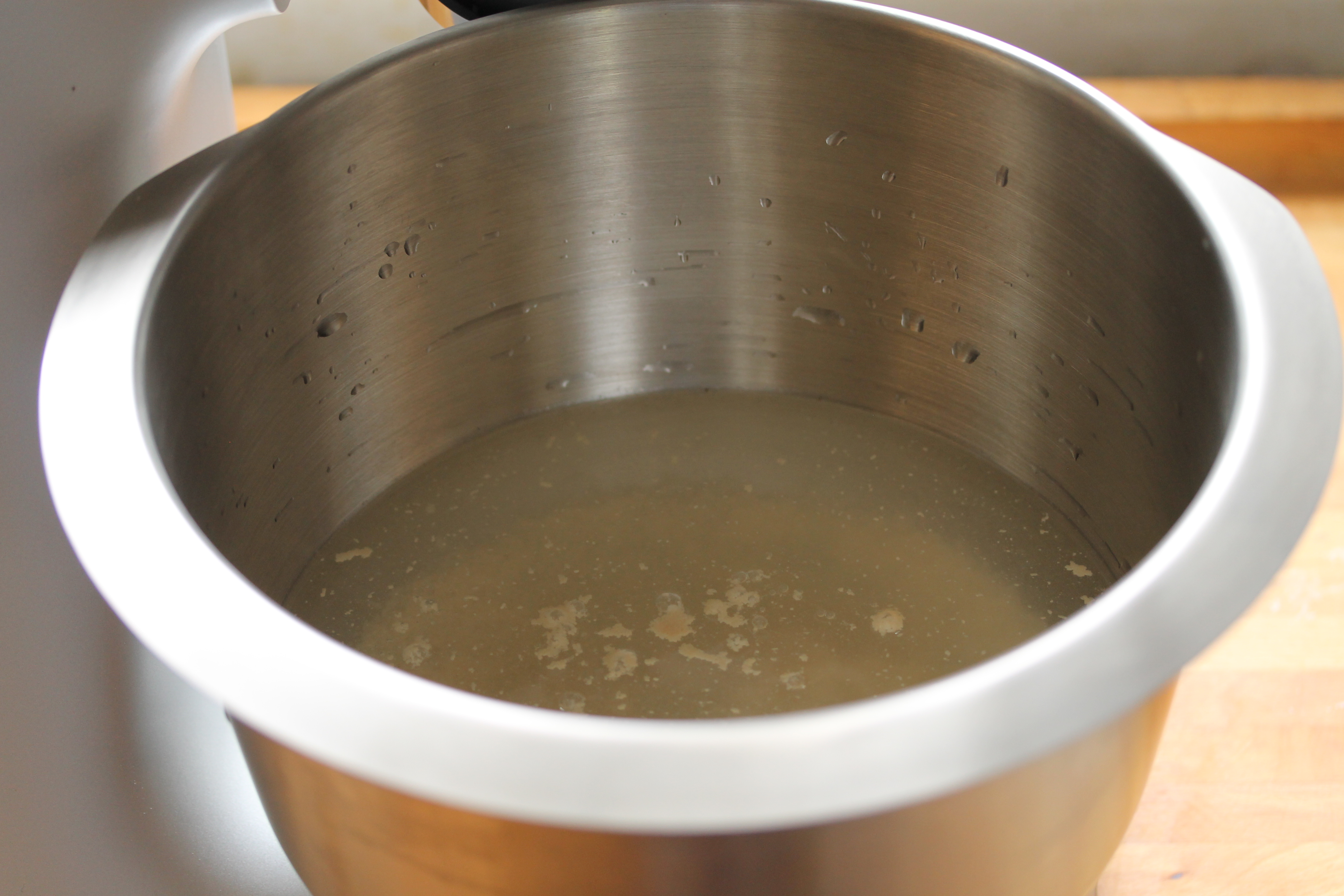 Ég bjó til deig í tvö brauð þótt ég bakaði bara annað núna (helmingurinn af deiginu bíður betri tíma í ísskápnum) og setti 850 ml af ylvolgu vatni í hrærivélarskál, stráði 1 msk af geri yfir og lét standa í nokkrar mínútur. – Það er hægt að komast af án hrærivélar en þetta er þykkt og þungt og mikið deig og aflmikil hrærivél léttir verkið ansi mikið.