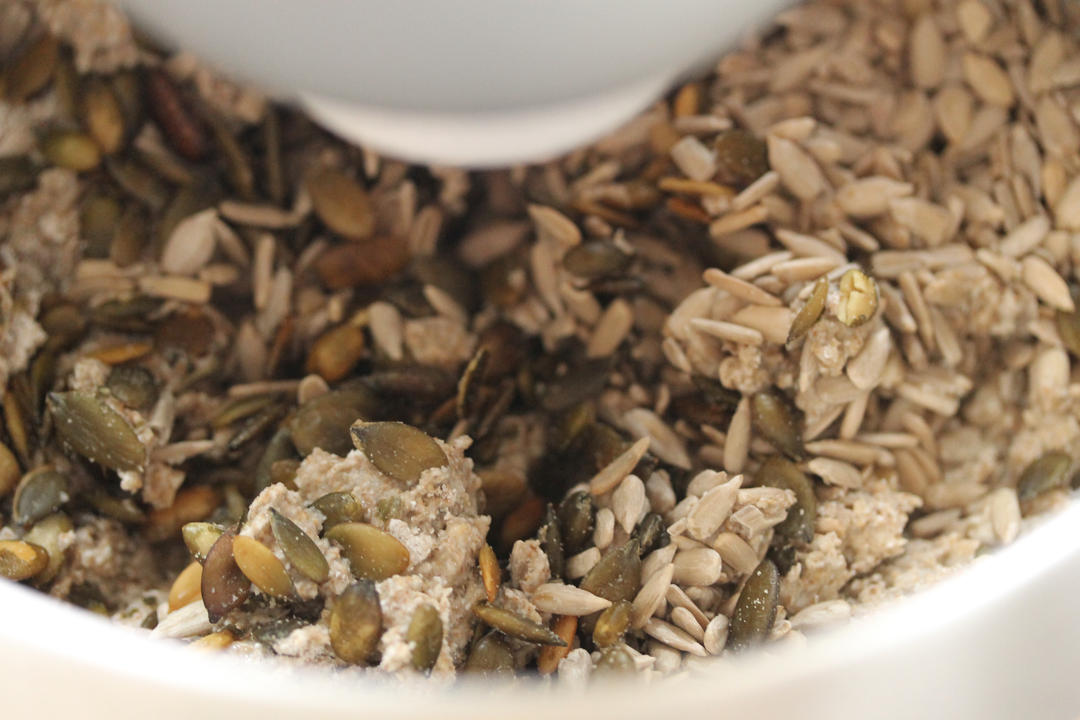 Þá setti ég 100 ml af graskersfræjum og sama magn af sólblómafræjum (sem heita ekki sólkjarnafræ, ekki veit ég hverjum datt það í hug) út í og hrærði.
