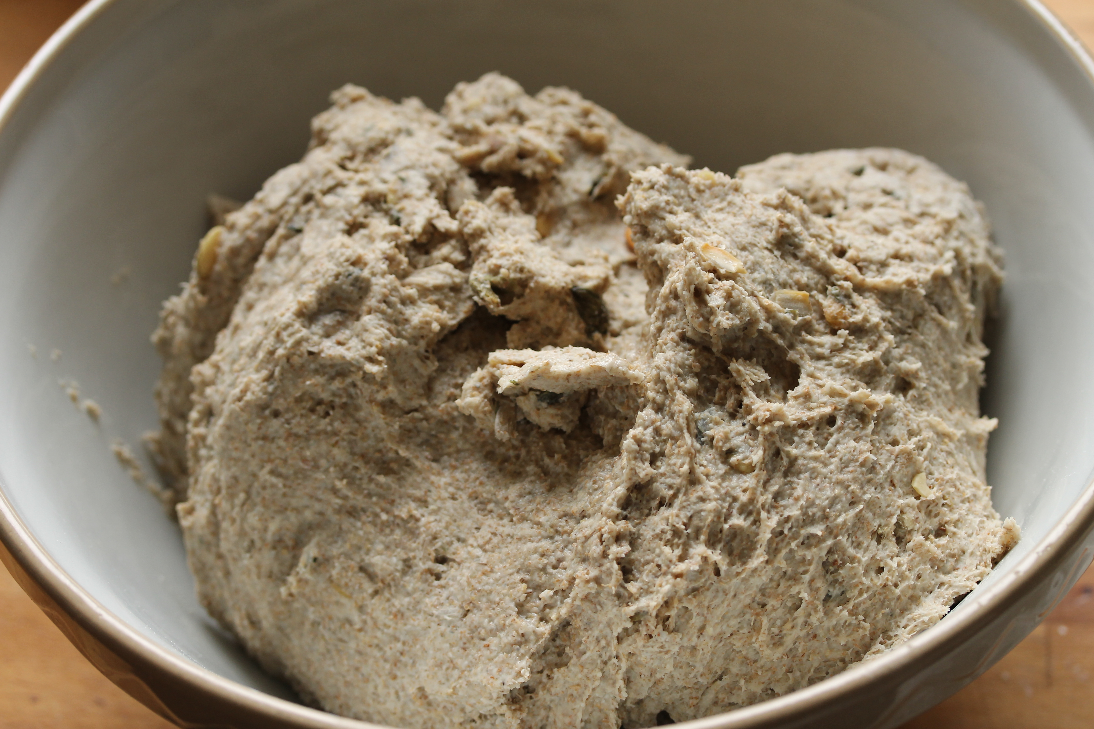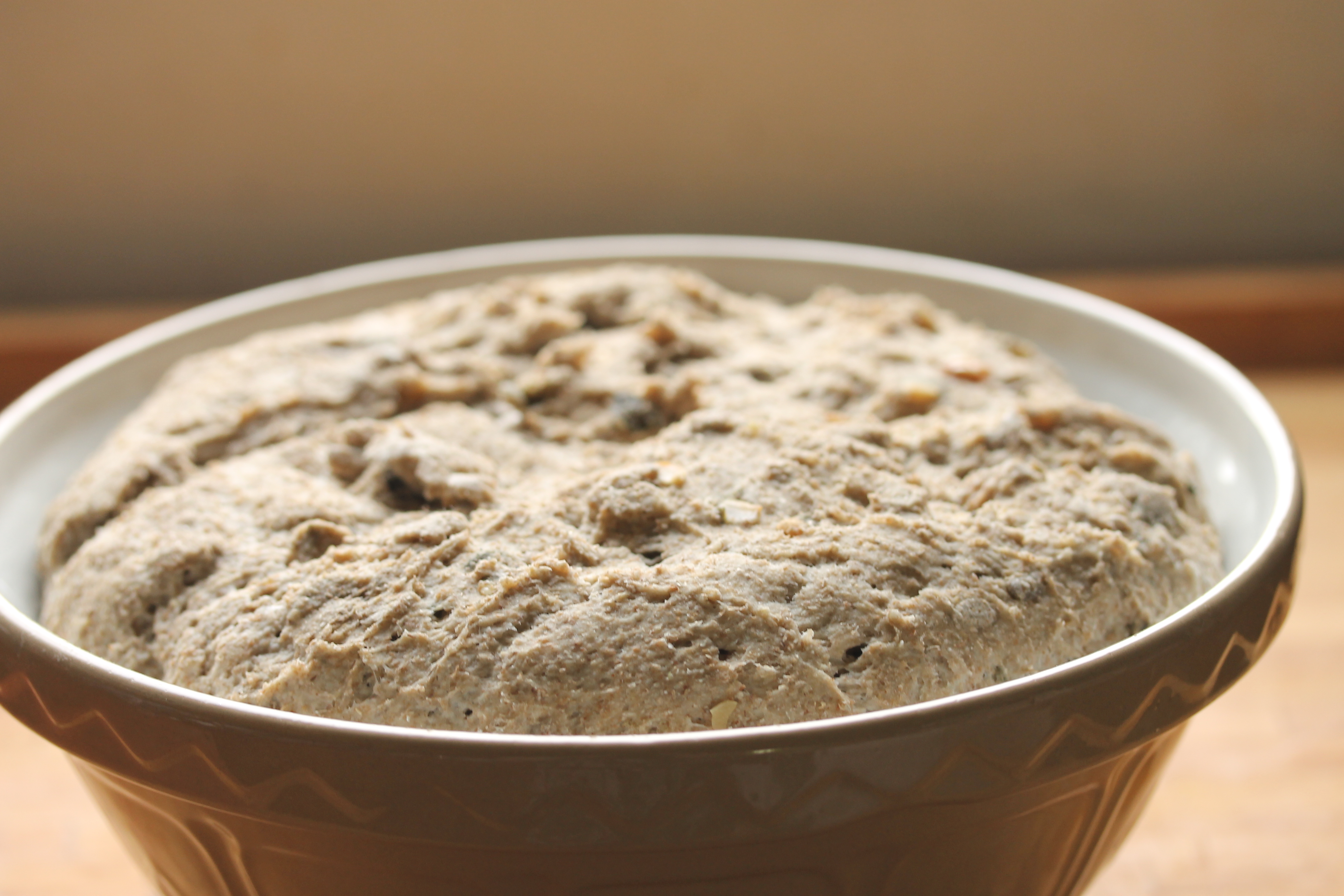 Ég bakaði brauð úr rúgmjöli í dag. Það var samt ekki rúgbrauð því þegar fólk segir rúgbrauð á það yfirleitt við seytt rúgbrauð – eða það er að segja, sætt, dökkt, hægbakað rúgbrauð. En þetta var nú ekki svoleiðis svo ég ætla að kalla það rúgmjölsbrauð. Reyndar var hveiti í því líka en það gildir nú líka um flest venjulegt rúgbrauð. Og fræ. Svo að – já, rúgmjölsbrauð með fræjum.