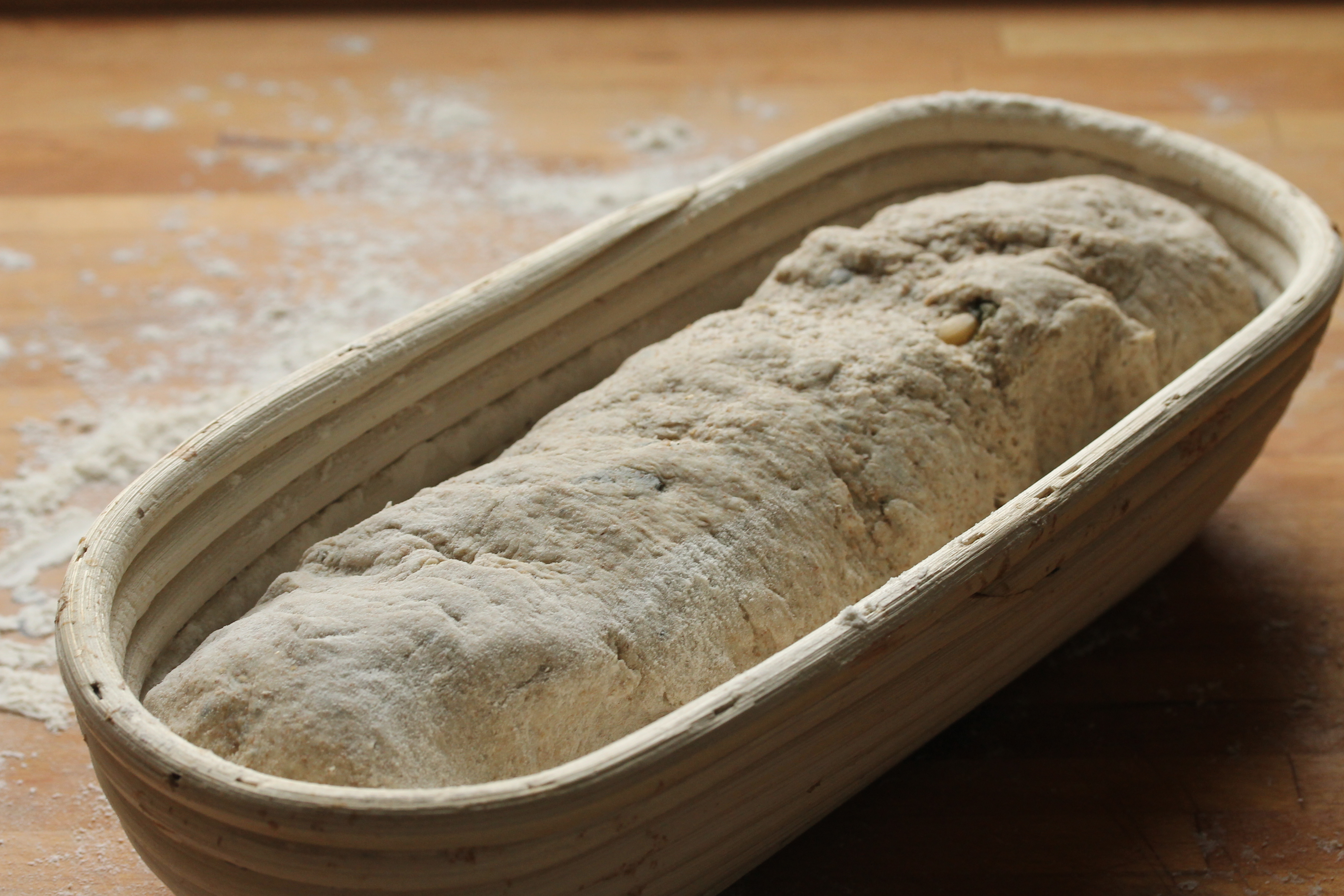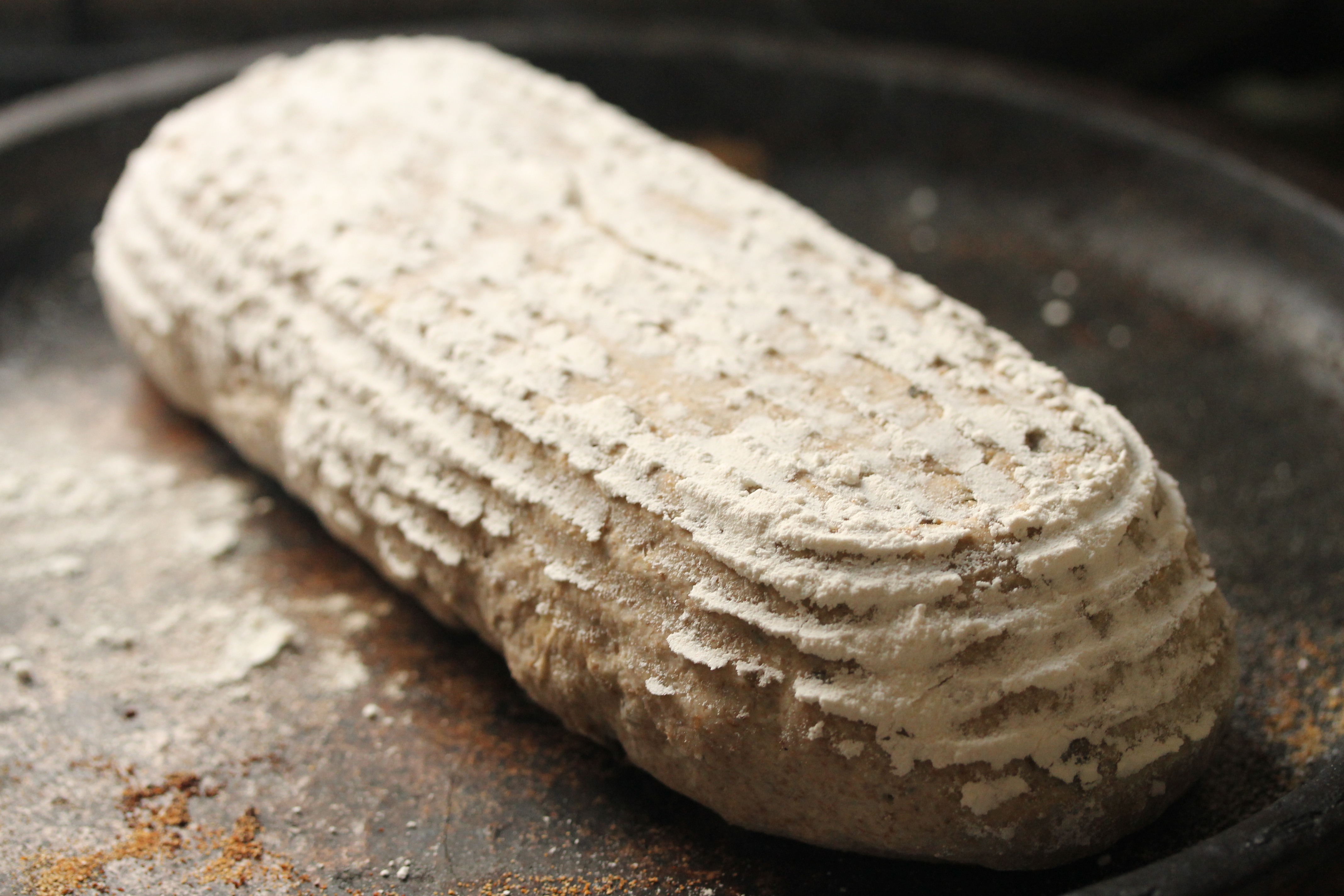 Ég setti deigið í hefunarkörfu og lét það lyfta sér þar en það má líka setja það í form eða láta það bara lyfta sér á bretti og renna því yfir á plötu, það er svo þétt í sér að það ætti að halda lögun nokkurn veginn. Ég lét það lyfta sér í svona 40 mínútur og eftir 20 mínútur kveikti ég á ofninum á 240°C og setti leirdiskinn sem ég baka oftast á inn til að hita hann (það má líka hita bara bökunarplötu).