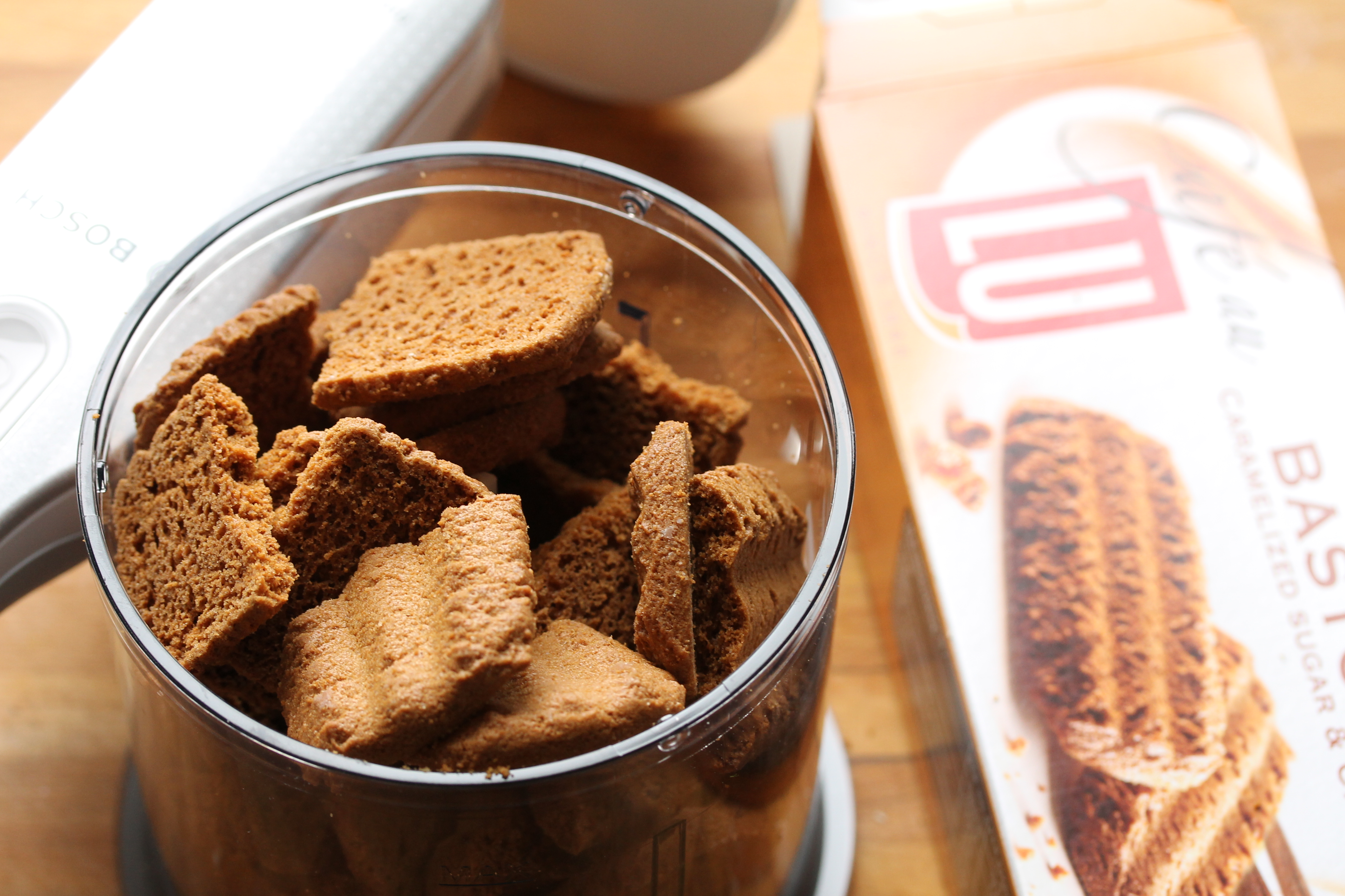 En ekkert heilhveitikex (þ.e. Haustkex, sem er ekki hafrakex, take note) í þetta skipti. Ég átti Lu kanilkex og notaði það. Sextán kökur, það eru eitthvað um 190 grömm. Meira komst ekki í litlu kvörnina svo ég ákvað að láta það duga.
