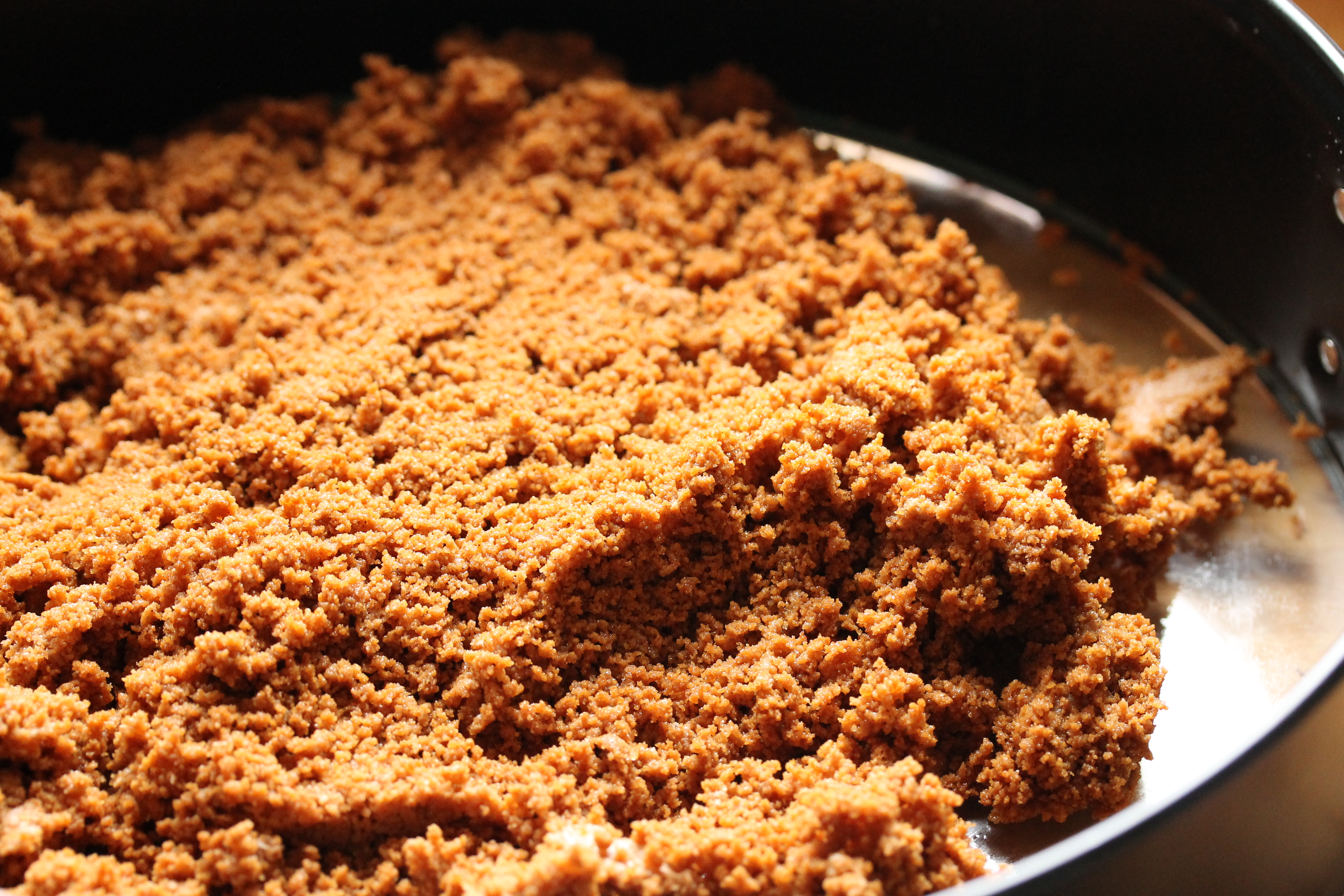 Stráði mylsnunni á botninn á meðalstóru smelluformi og þrýsti því létt niður og aðeins upp með hliðunum. Ég var búin að hita ofninn í 180°C og bakaði botninn í svona 5 mínútur. Tók hann svo út og lét kólna og lækkaði hitann í 160°C.