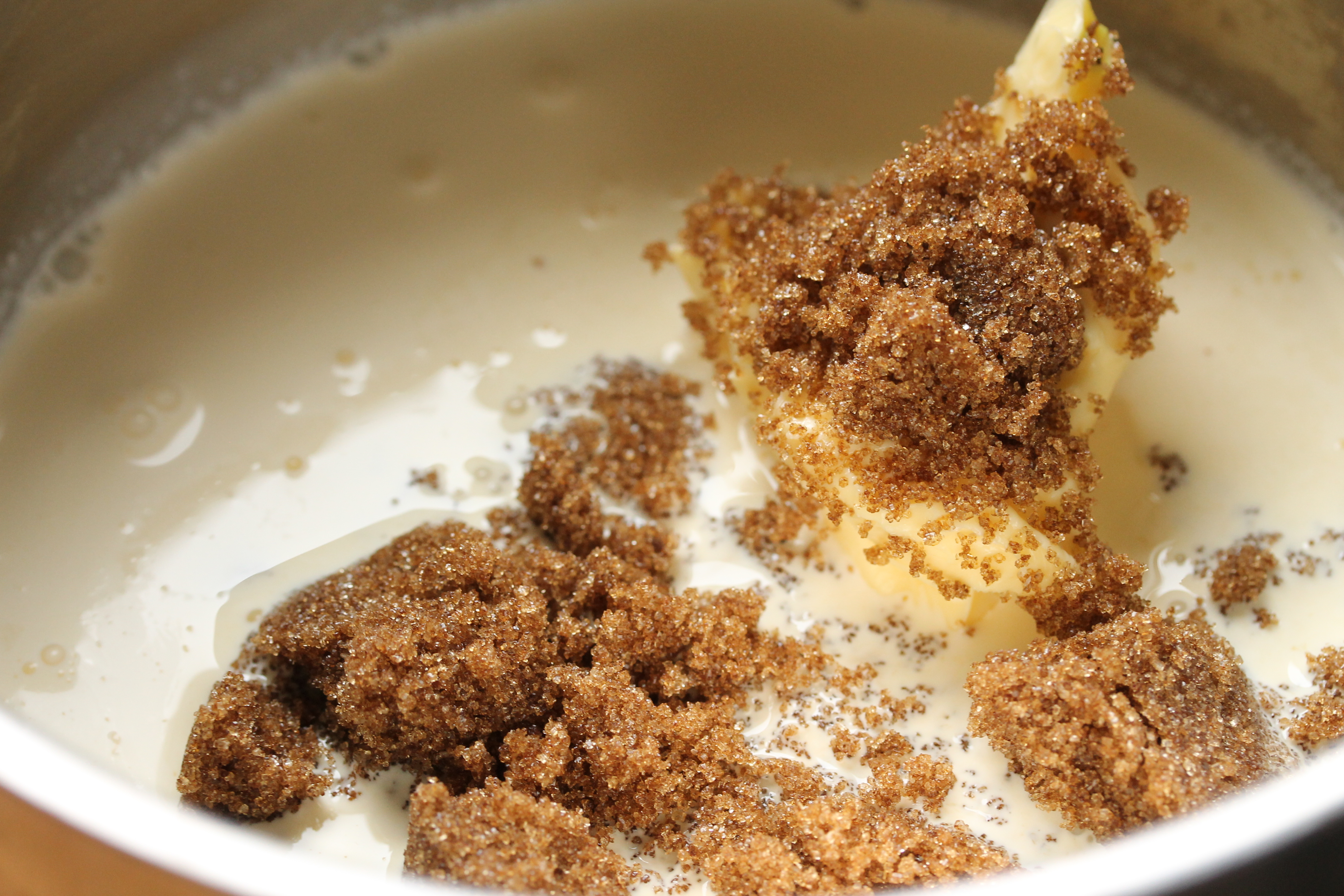 Á meðan fór ég að undirbúa fyllinguna. Ég byrjaði á að setja 150 ml af rjóma, 100 g af púðursykri og 50 g af smjöri í pott, hitaði að suðu og lét þetta svo malla góða stund …