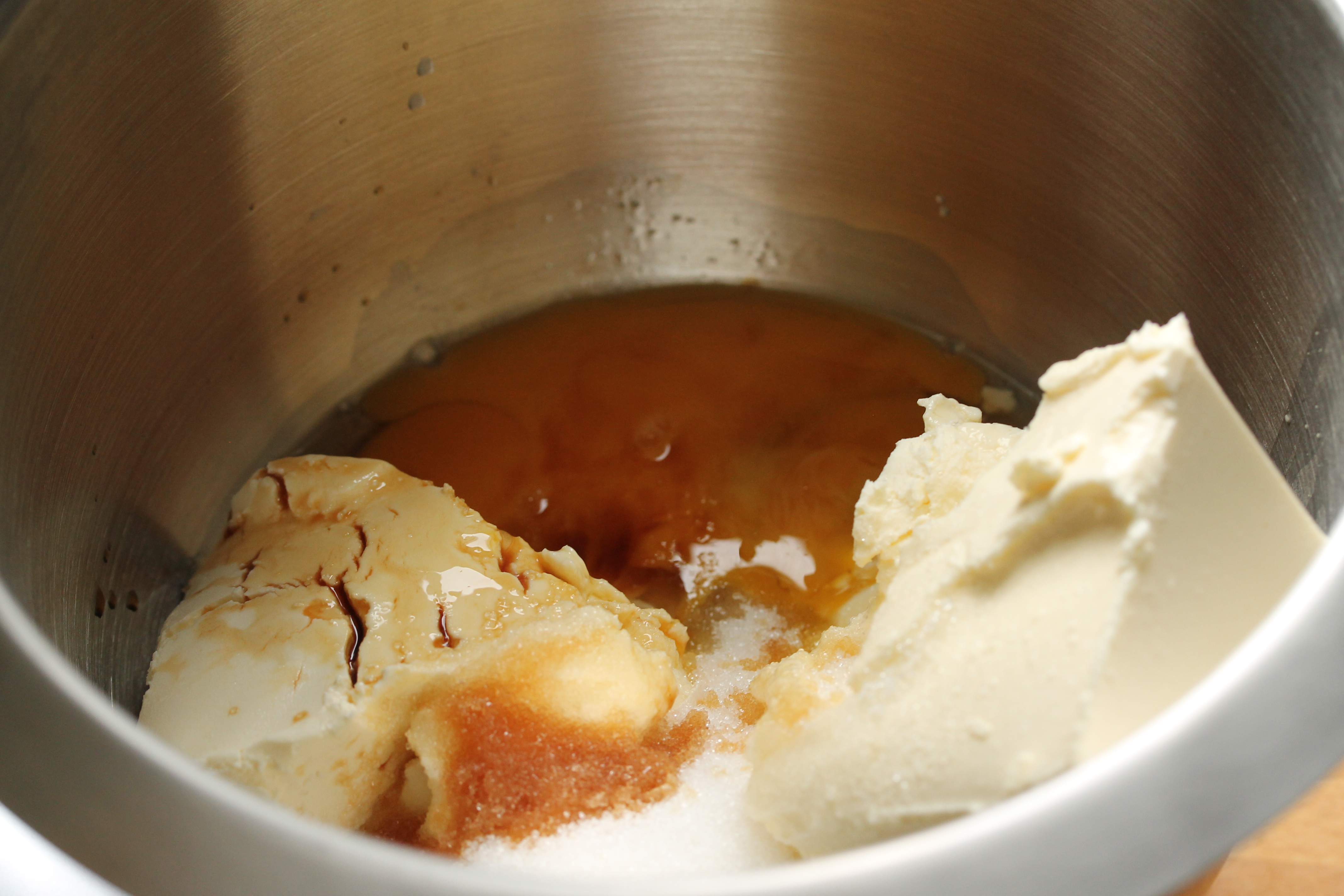 Á meðan sósan mallaði setti ég 500 g af mjúkum rjómaosti, 4 egg, 100 g af sykri og 1 1/2 tsk af vanilluessens í hrærivélarskálina og hrærði þetta vel saman.