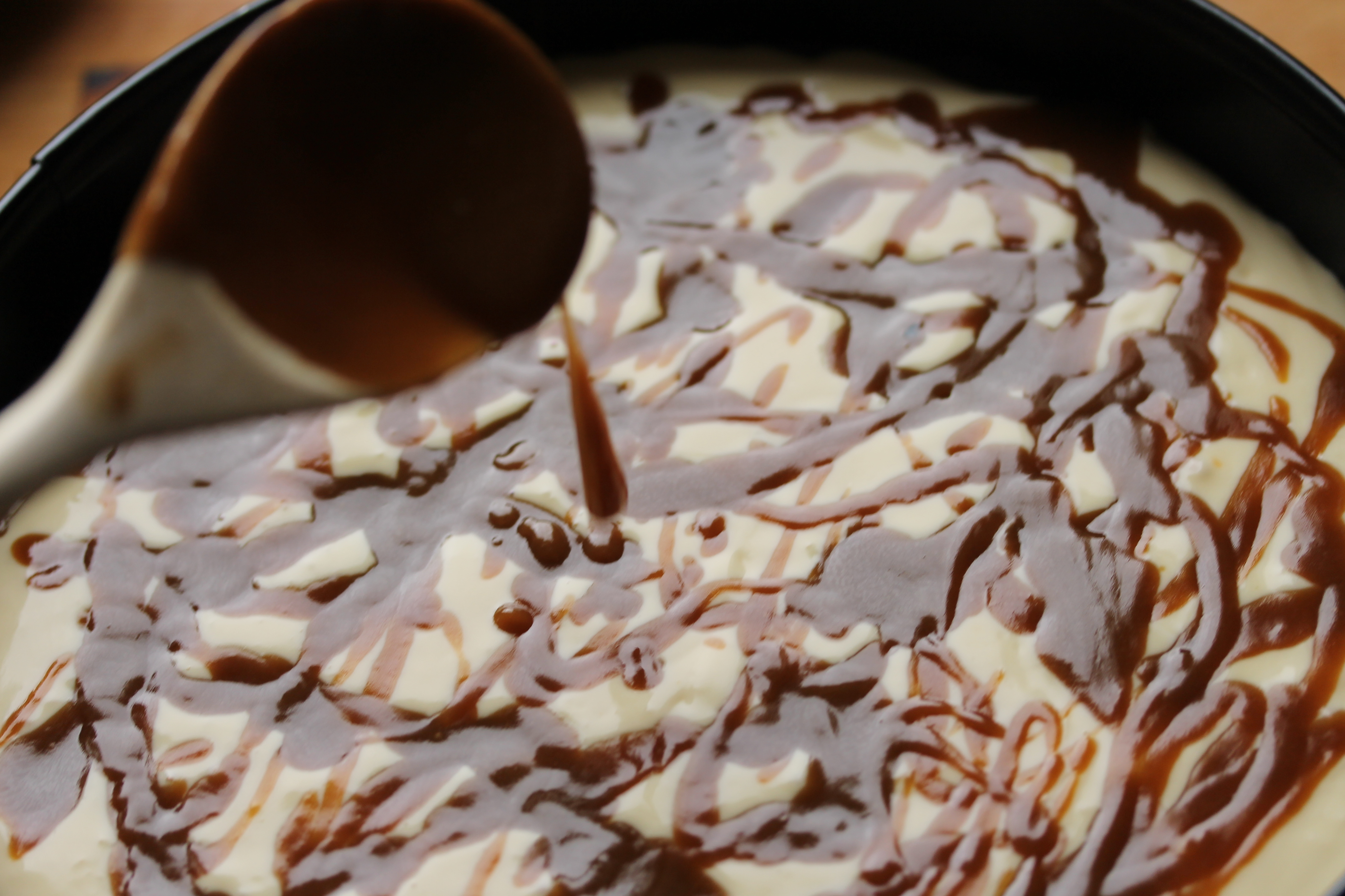Svo dreypti ég karamellusósunni yfir úr sleif. Ég notaði reyndar ekki alla sósuna, skildi rúmlega þriðjunginn eftir – það má velgja hana og bera fram með kökunni eða geyma hana í kæli og nota t.d. út á ís seinna.