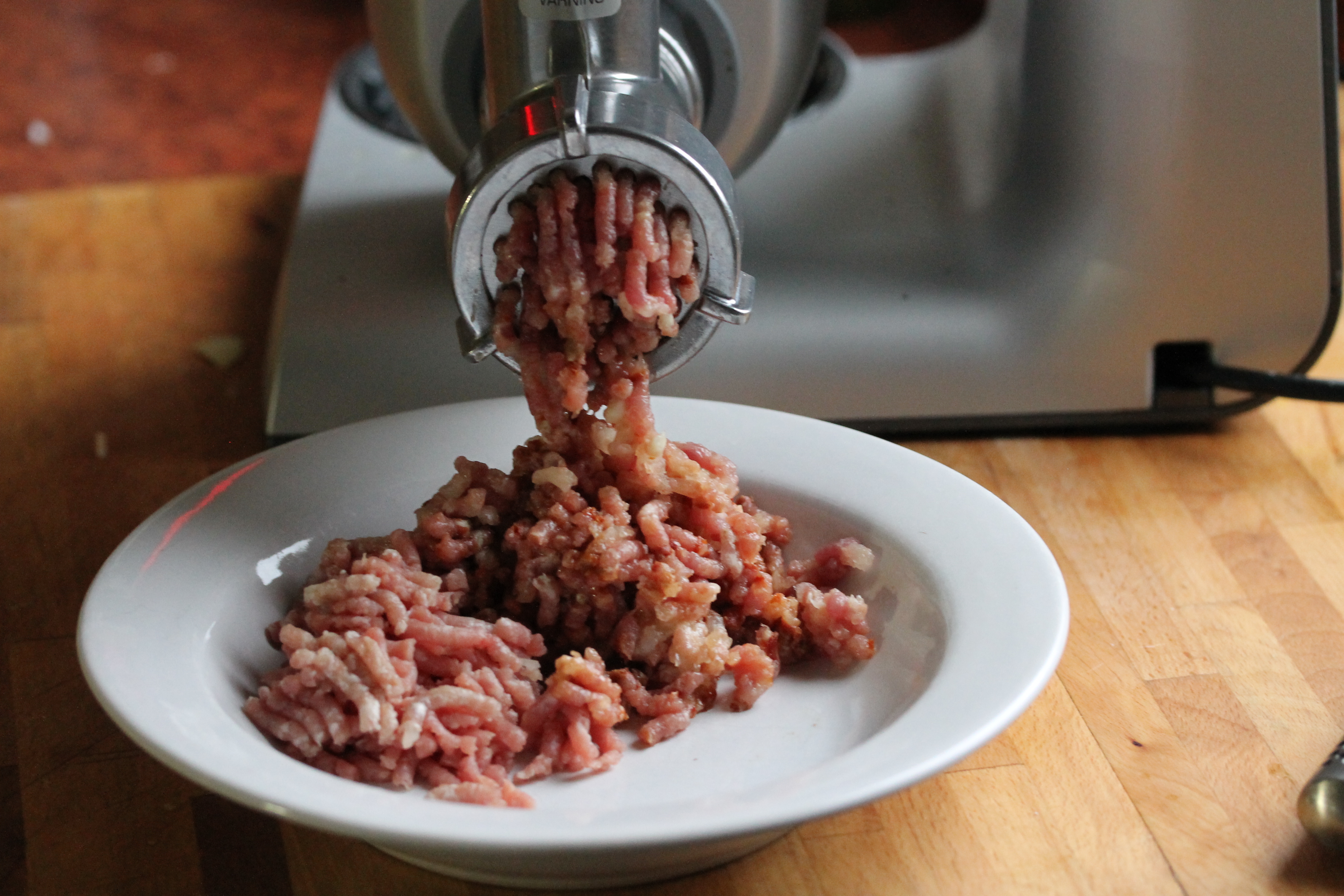 Það er auðvitað alveg hægt að kaupa hakk og nota það. En kosturinn við að eiga hakkavél og hakka sitt eigið kjöt er auðvitað ekki síst að maður veit þá nákvæmlega hvað er í hakkinu. Hvort það er mest fita, sinar og ólseigir vöðvar eða eitthvað annað. Og þessi svínahnakki var býsna magur, jafnvel svo magur að ég velti fyrir mér hvort ég ætti að blanda svolítilli olíu saman við hakkið en það reyndist þó óþarfi (ja, það fylgdi reyndar ögn af olíu með tómötunum. Meira um það hér á eftir).