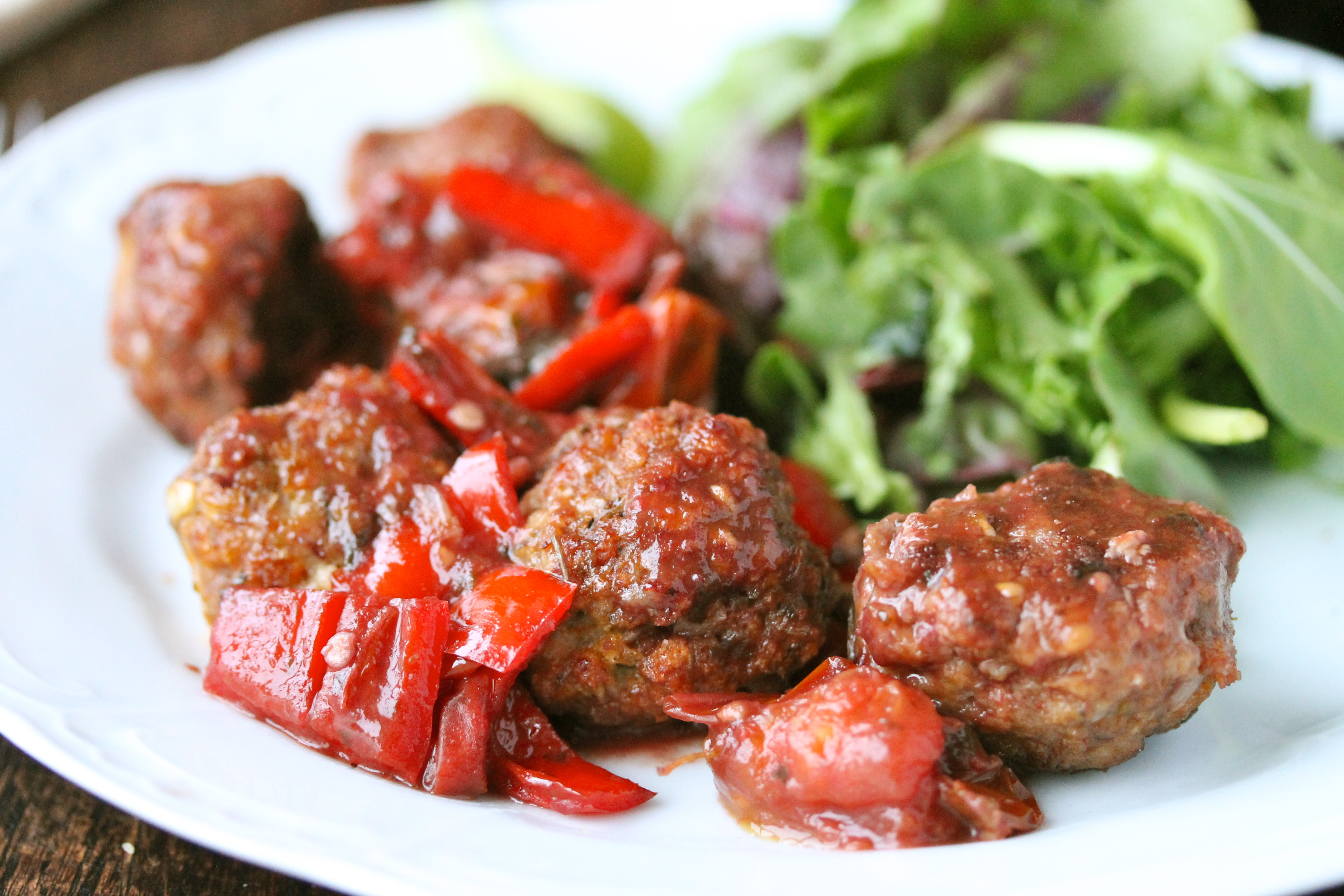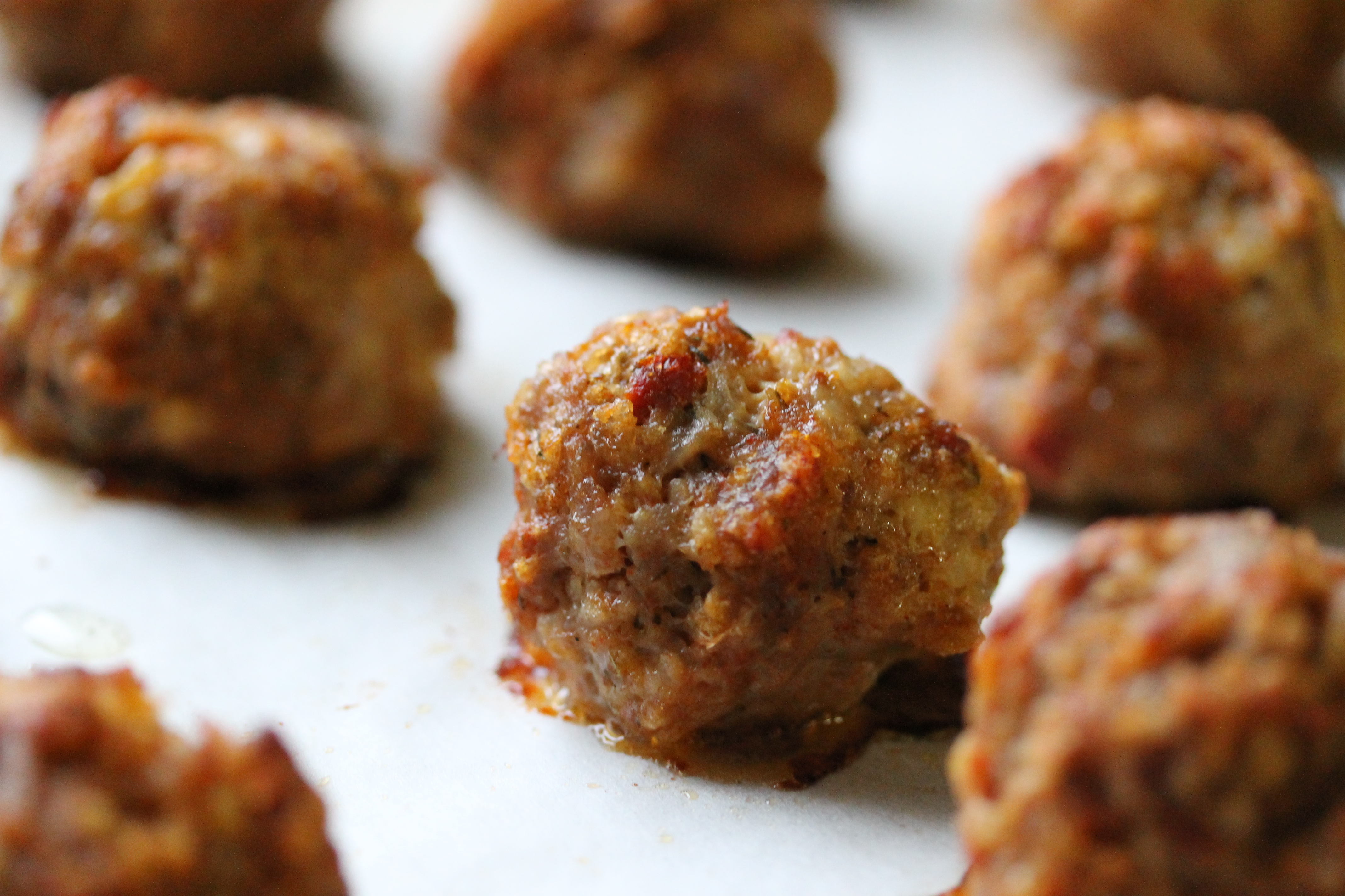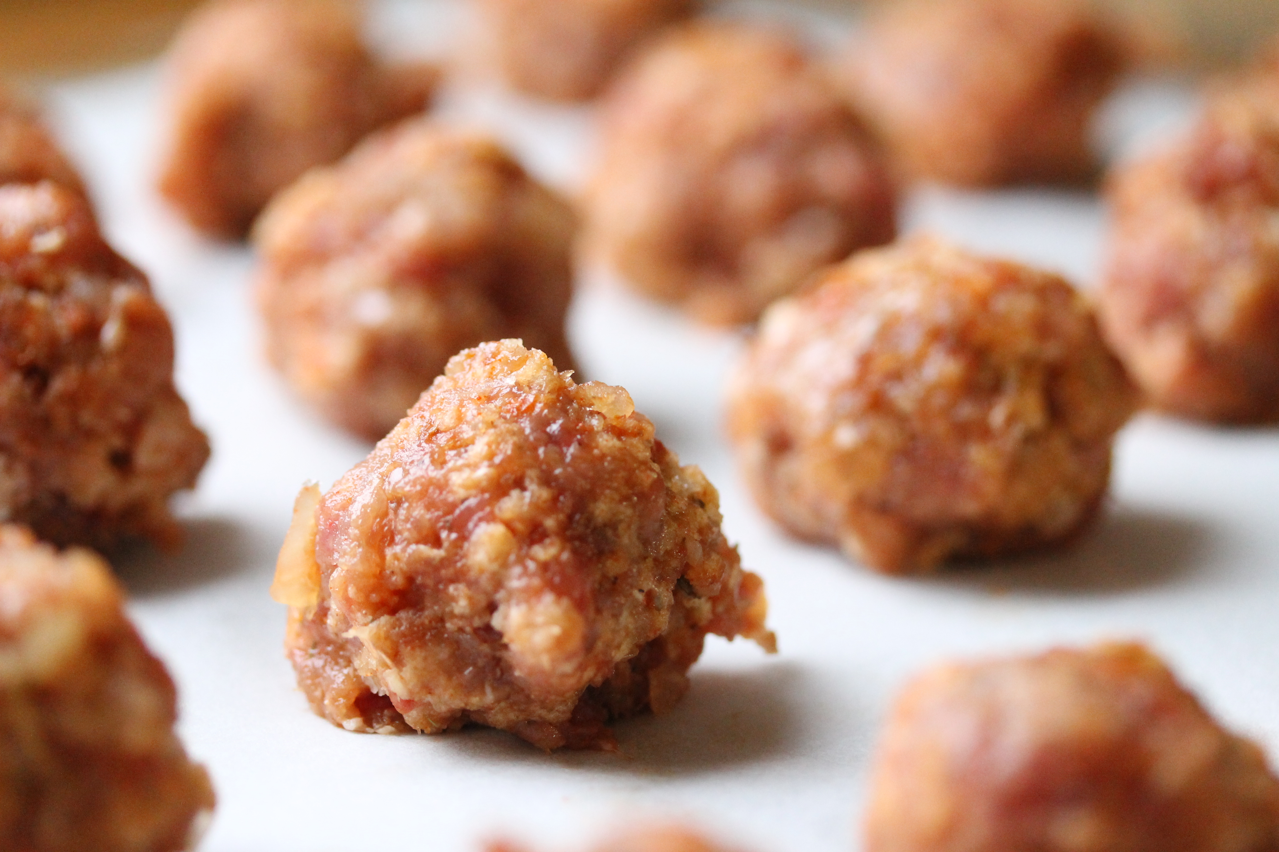 Ég blandaði öllu vel saman með höndunum. Mótaði svo litlar bollur úr farsinu, á stærð við valhnetu eða svo – þetta urðu einar 30 bollur. Raðaði þeim á pappírsklædda bökunarplötu og ýrði örlítilli olíu yfir.