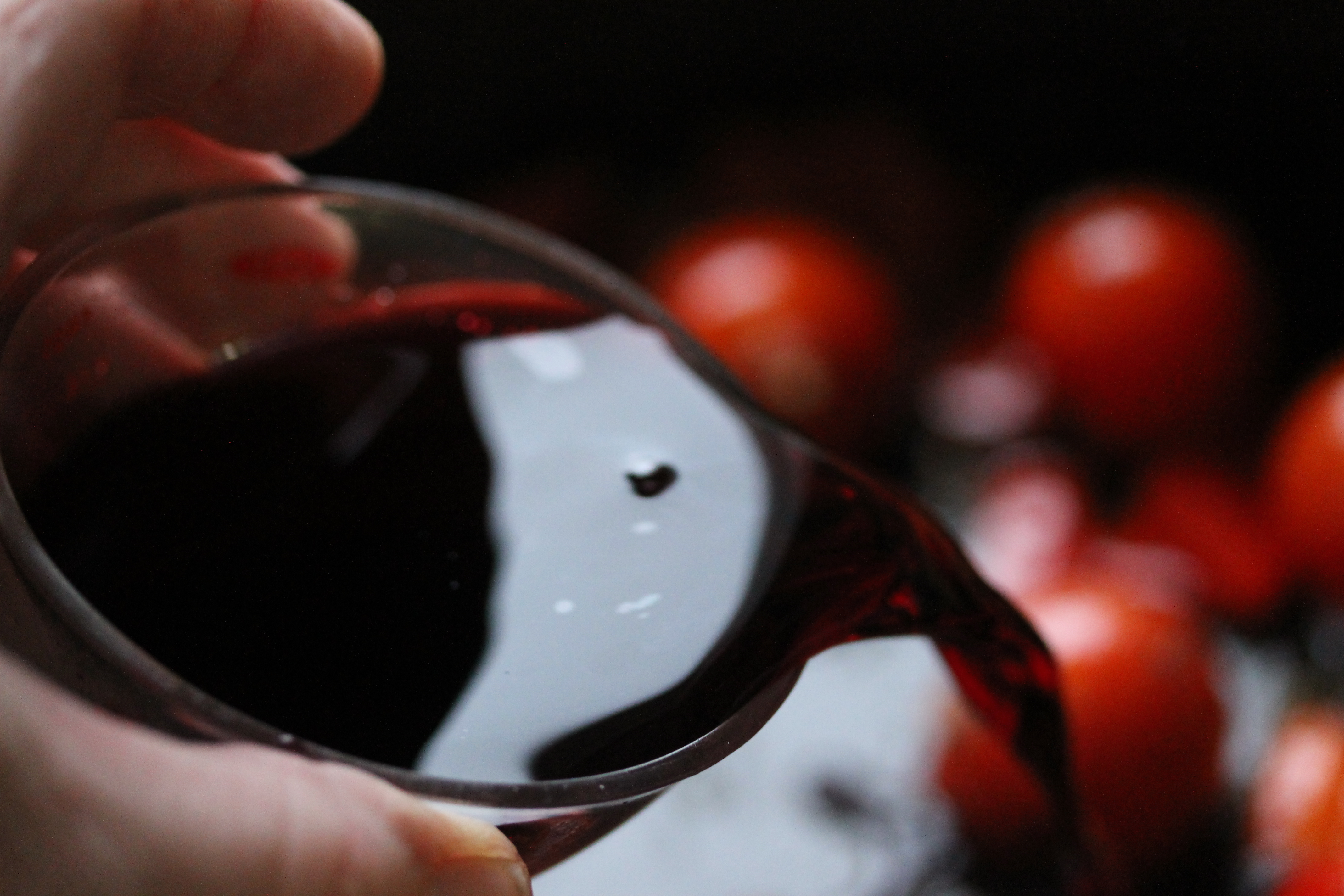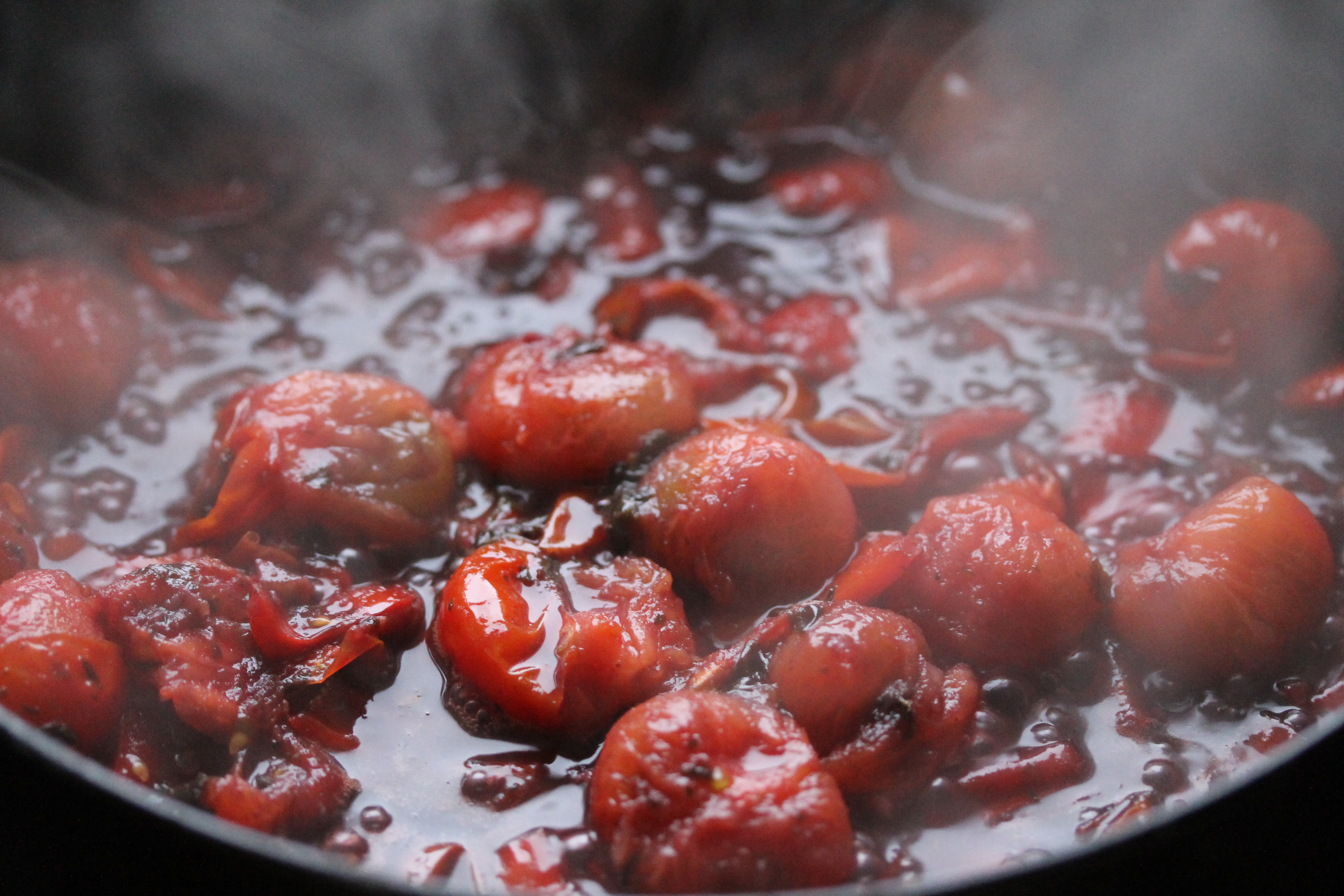 Þegar tómatarnirog paprikan voru aðeins farin að mýkjast hellti ég 150 ml af rauðvínsafgangi sem ég átti á pönnuna og bætti við 1/2 tsk af kjötkrafti. Ef ekki er til rauðvín má bara nota vatn og bæta kannski við 1 tsk af hvítvinsediki og/eða 1 tsk af kjötkrafti. Nú, eða grænmetiskrafti.