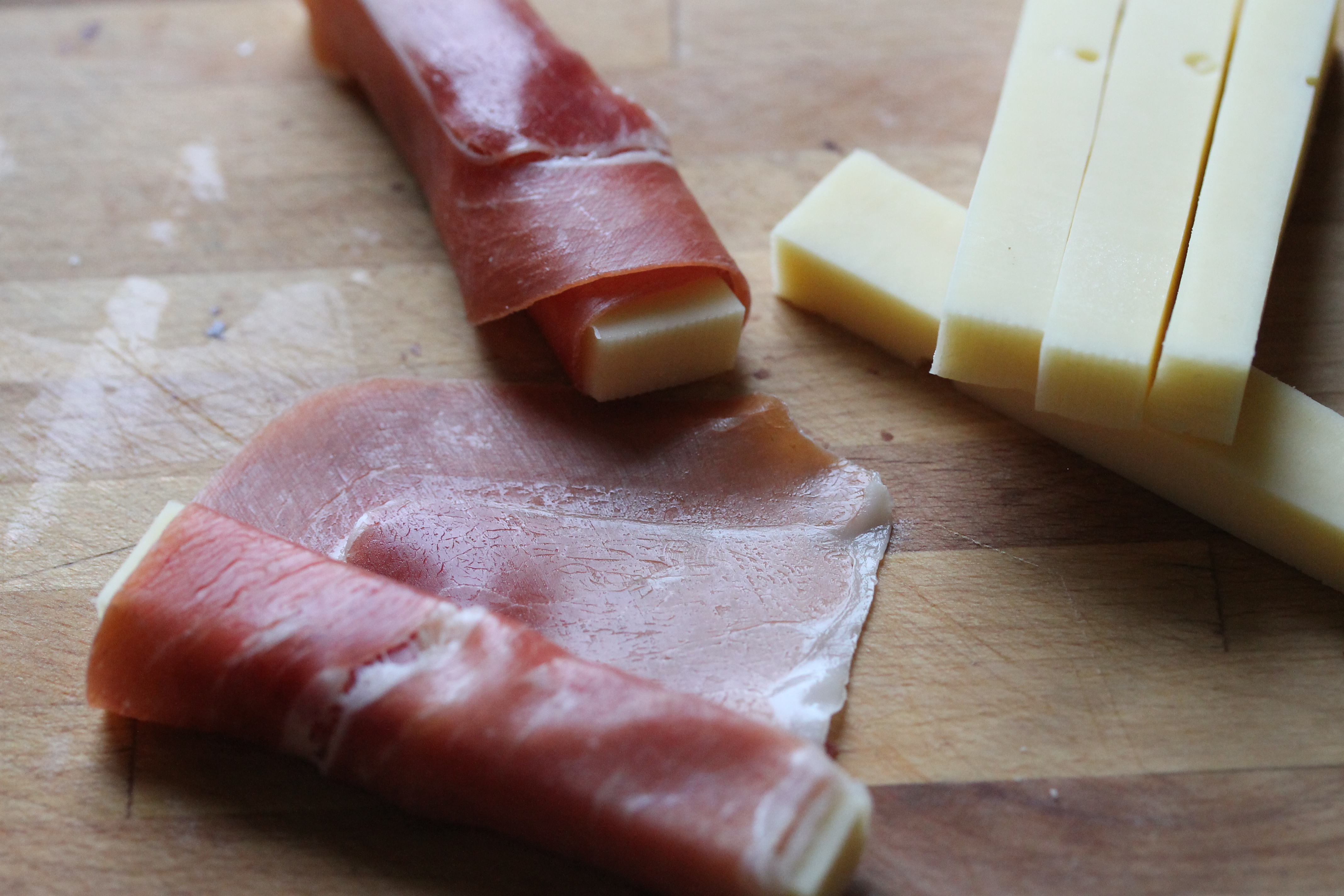 Ég byrjaði á að hita ofninn í 200°C. Svo tók ég svona 120 g af osti – ég notaði Tind af því að ég átti hann en það má vera hvaða bragðmikill ostur sem er og skar í 6 stauta. Tók svo 6 sneiðar af hráskinku og vafði einni utan um hvern staut. En það hefði líka mátt nota góða soðna skinku – helst ekki venjulega brauðskinku samt.