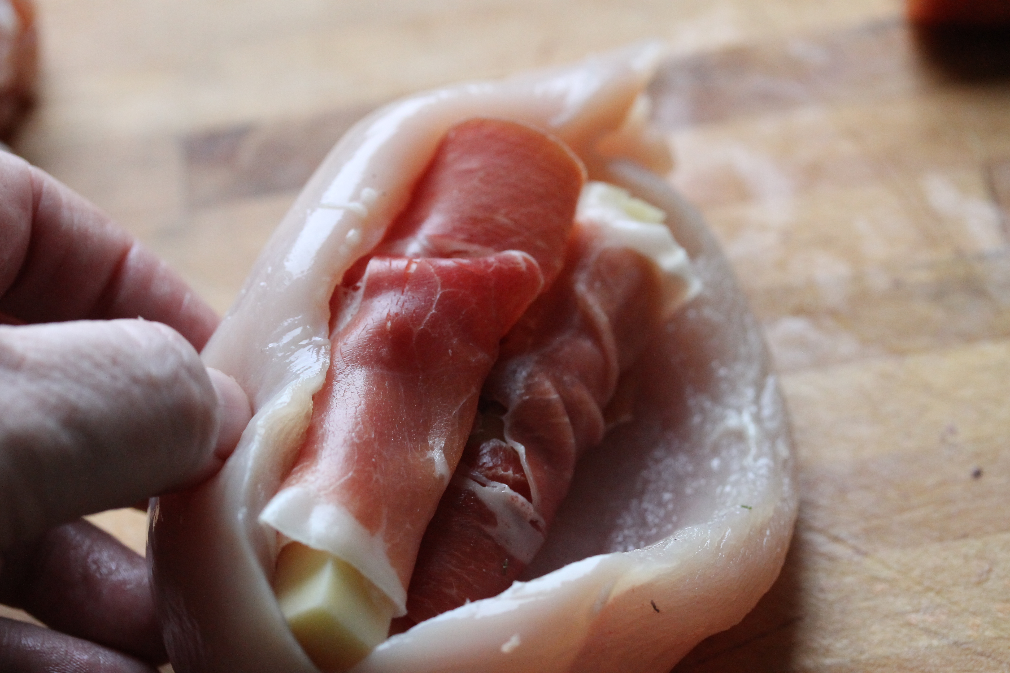 Til eru margar útfærslur á réttinum; oftast eru kjúklingabringur skornar í tvennt á þykktina eða barðar þar til þær eru þunnar og þær síðan brotnar eða þeim vafið utan um skinku og ost áður en þeim er velt upp úr raspi og þær svo steiktar eða bakaðar. Hér barði ég aftur á móti ekki nokkurn skapaðan hlut, heldur skar ég vasa í bringurnar og vafði skinkunni utan um ostinn, það dregur úr líkum á að osturinn leki allur út þegar hann bráðnar.