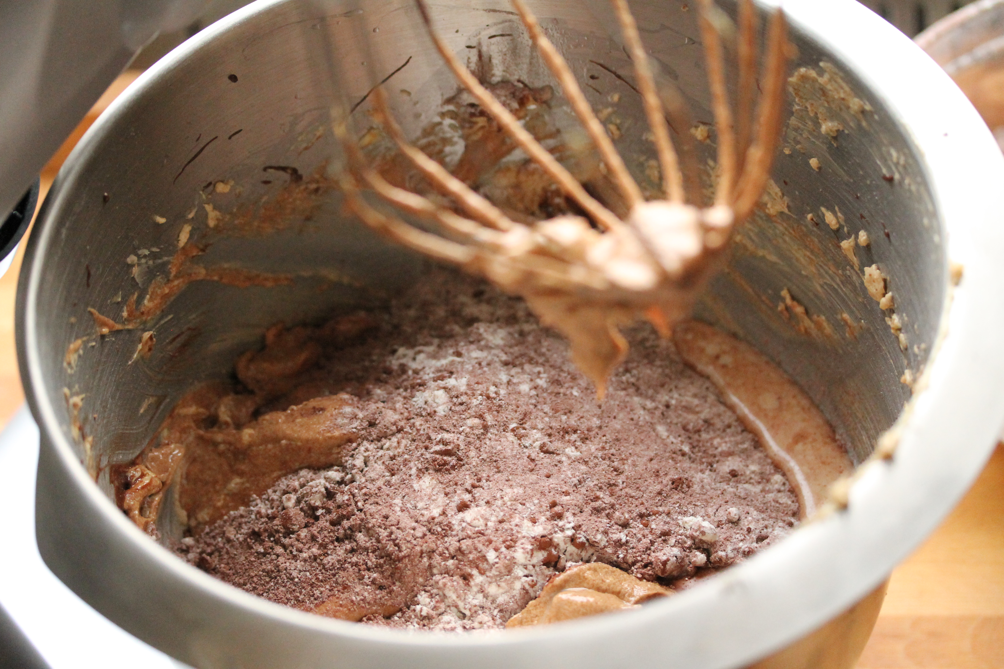 Ég vigtaði svo 125 g af hveiti og 40 g af kakói og blandaði 1 tsk af lyftidufti og 1/4 tsk af salti saman við. Mældi 125 ml af mjólk og setti svona þriðjung af hveitiblöndunni og þriðjung af mjólkinni út í á víxl og hrærið rólega saman. Best er að hræra sem minnst, bara rétt til að blanda öllu saman.